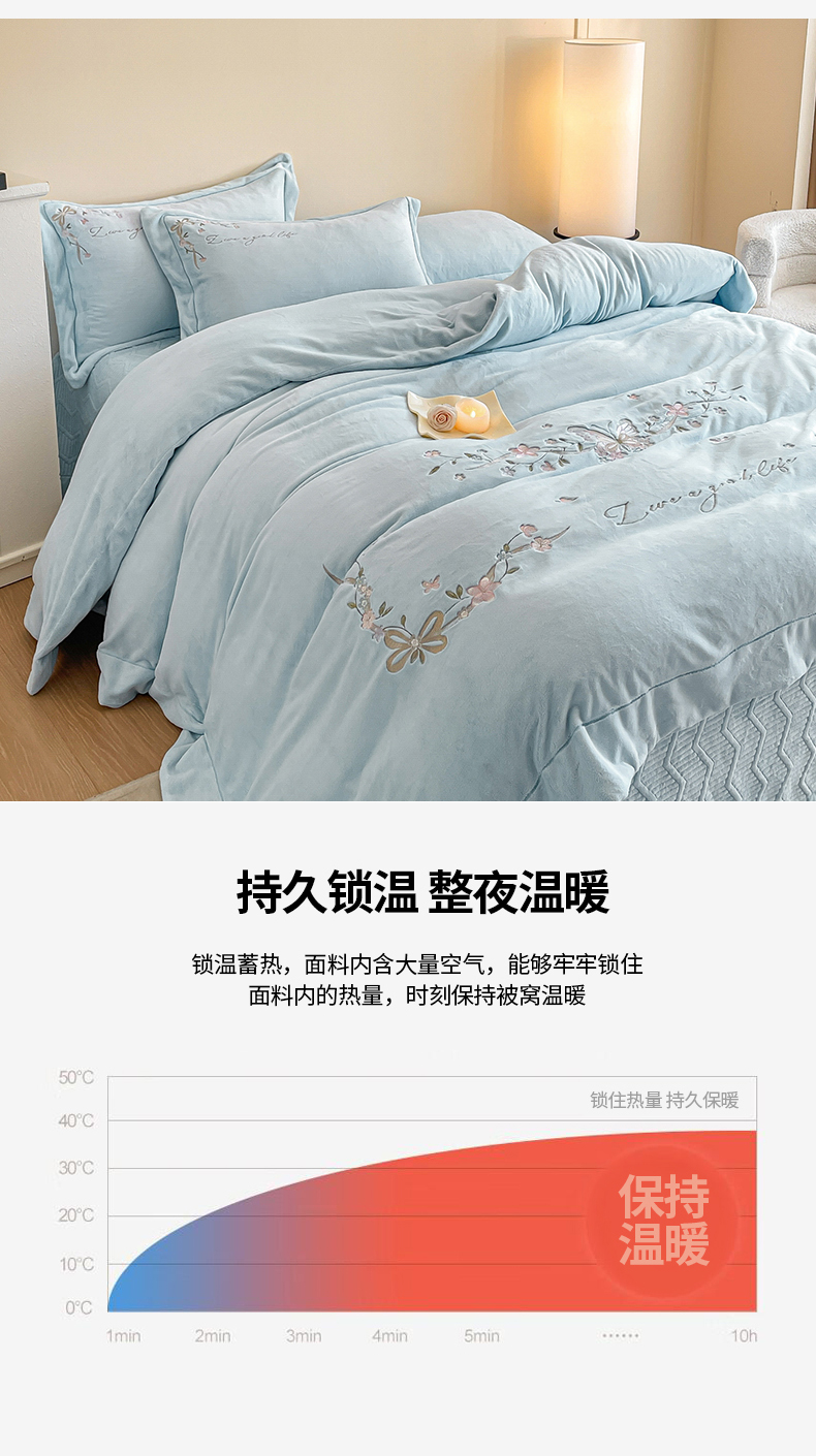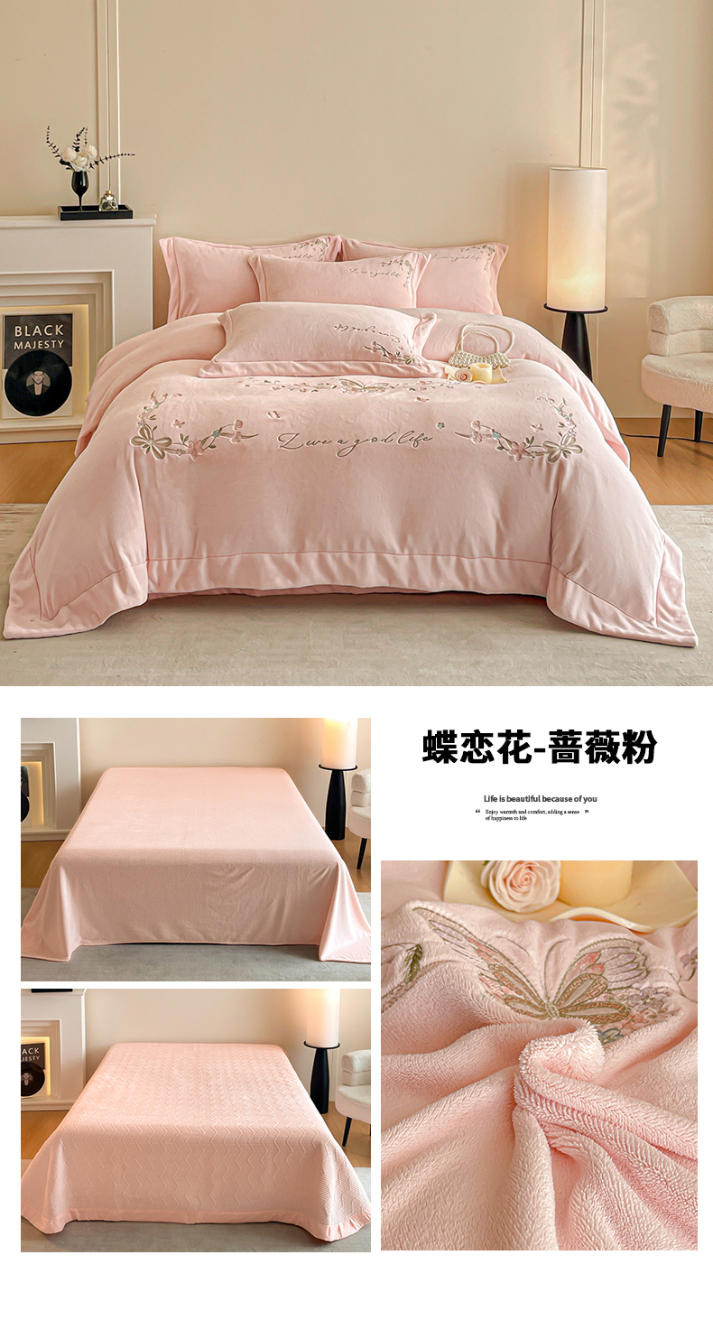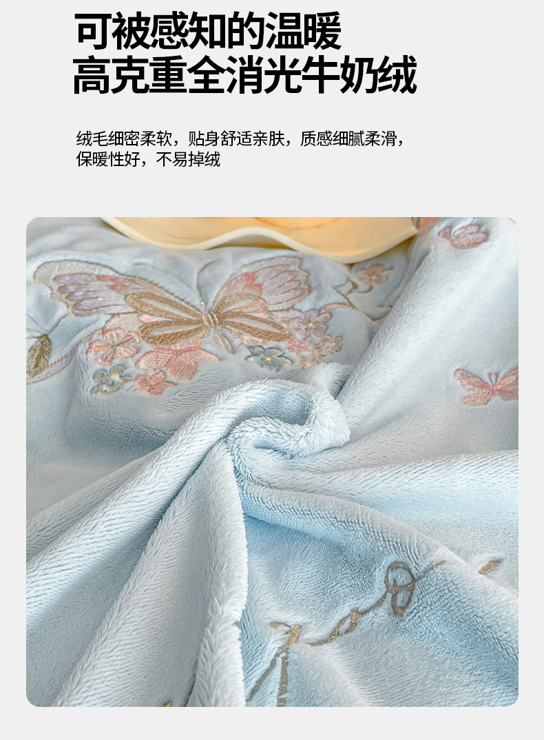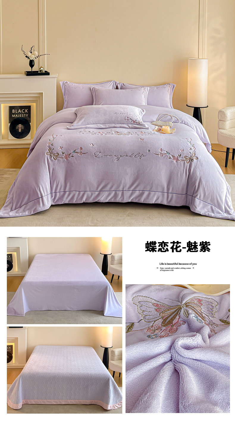 商品名称:(总)控价 2025新款 专版花型 全消光A类刺绣牛奶绒四件套床盖款-蝶恋花