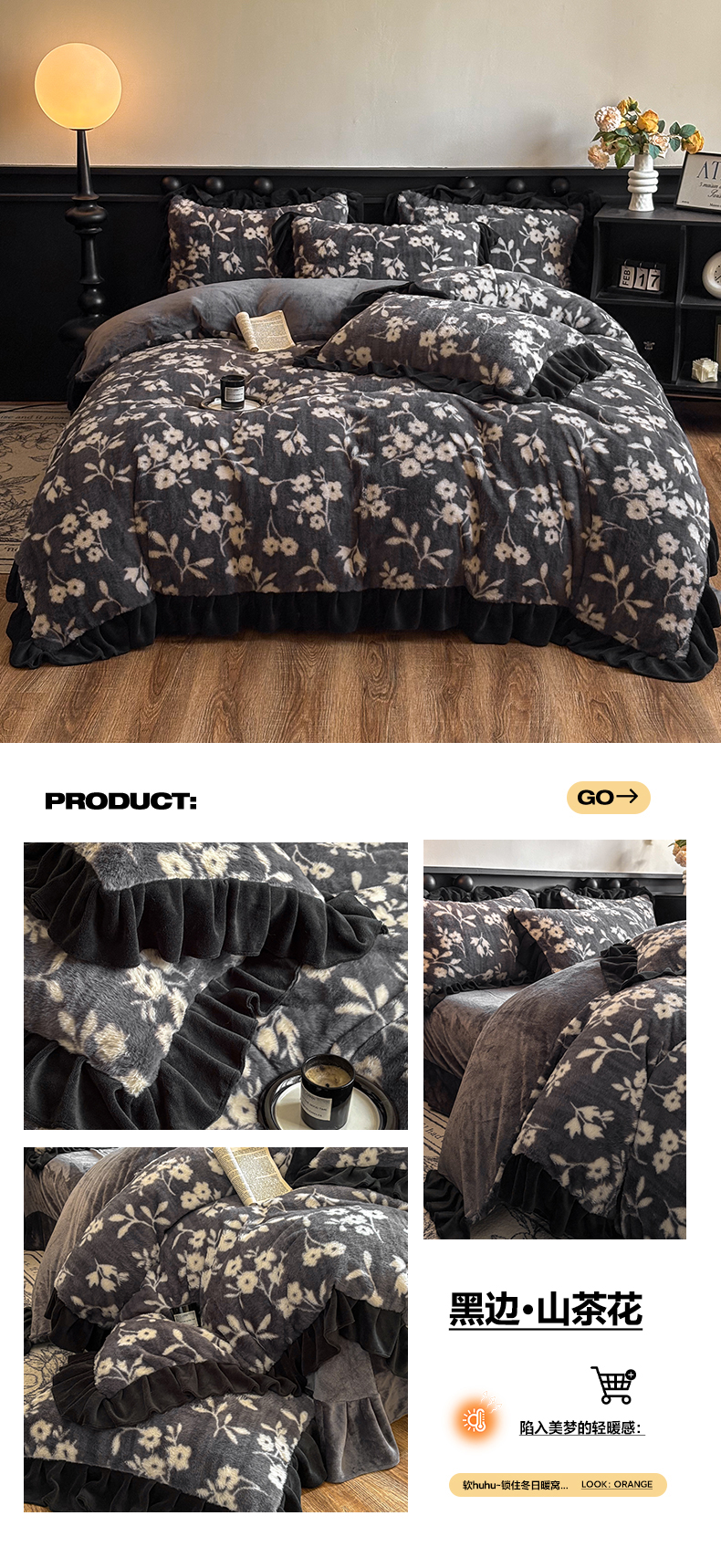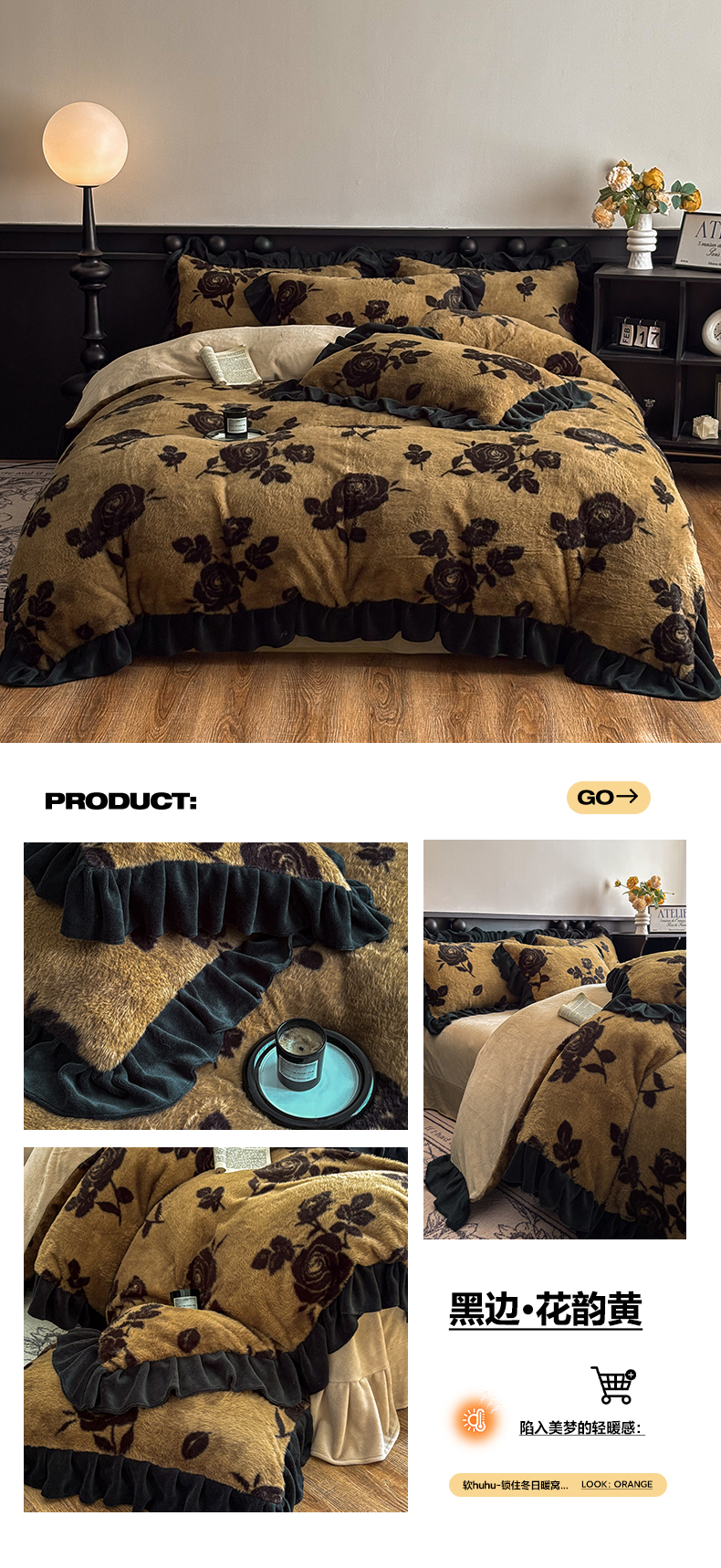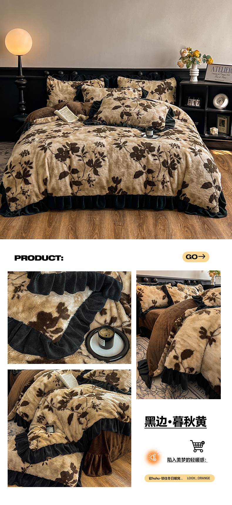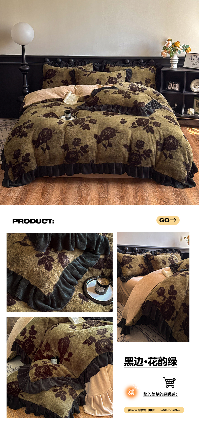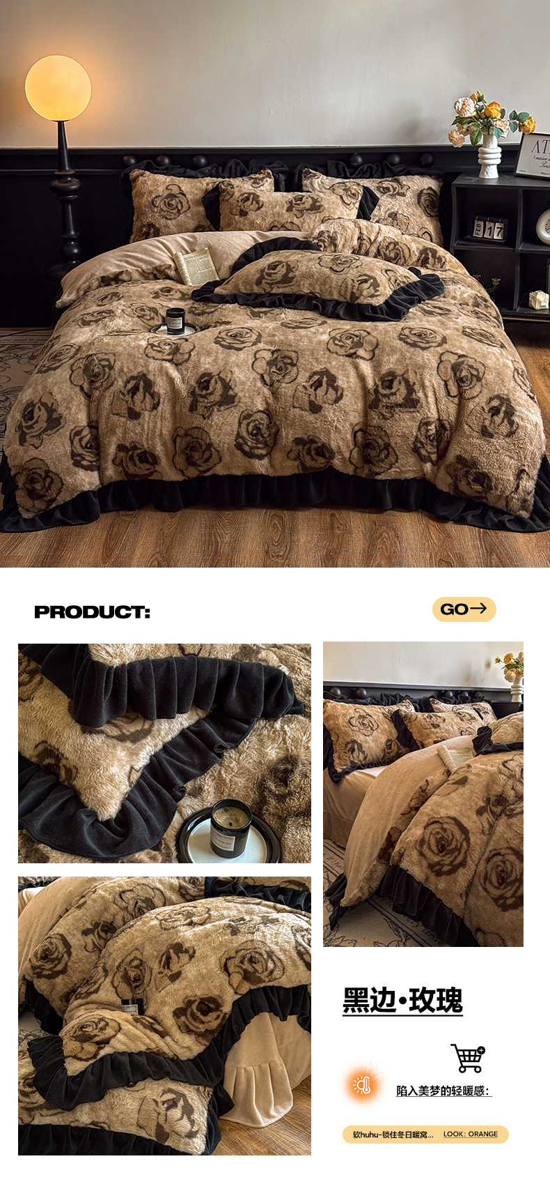 商品名称:(总)晚爱家居 2025新款韩版黑色花边美拉德兔毛绒四件套高克重皮草兔绒牛奶绒四件套