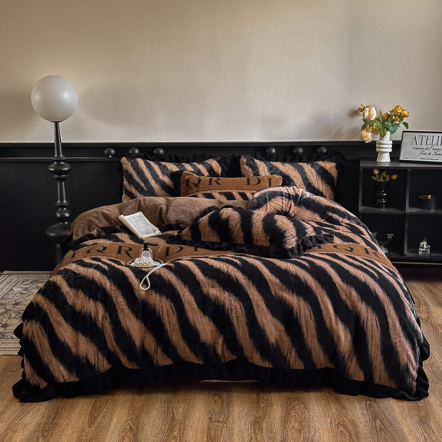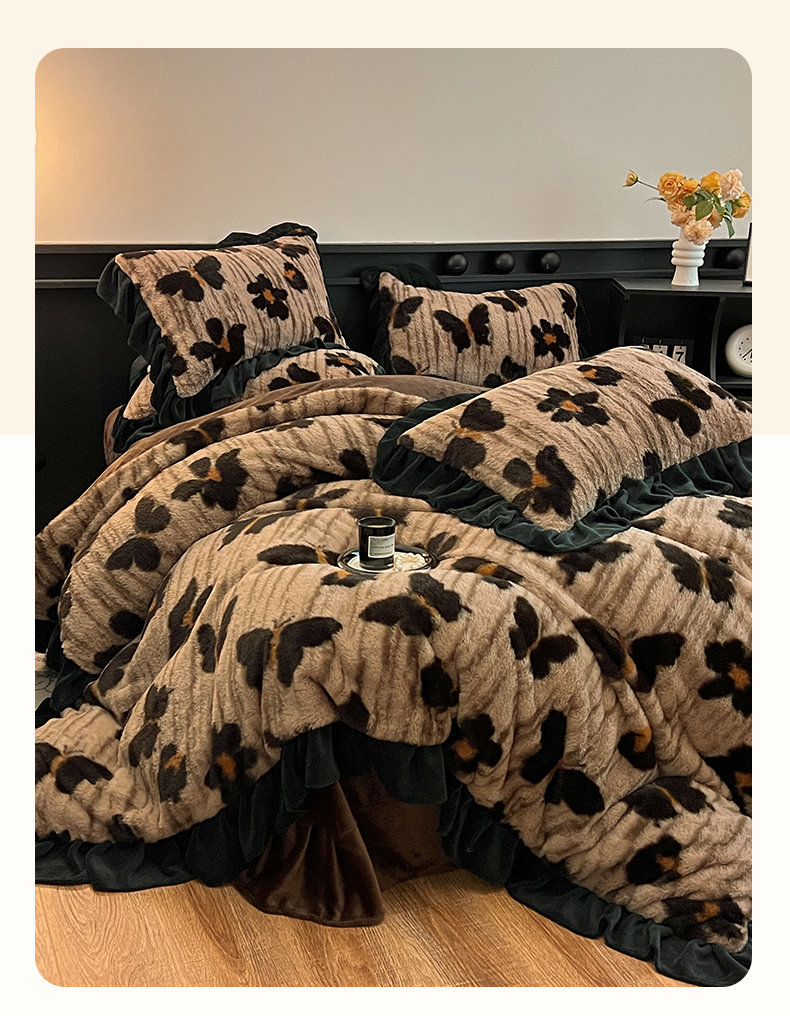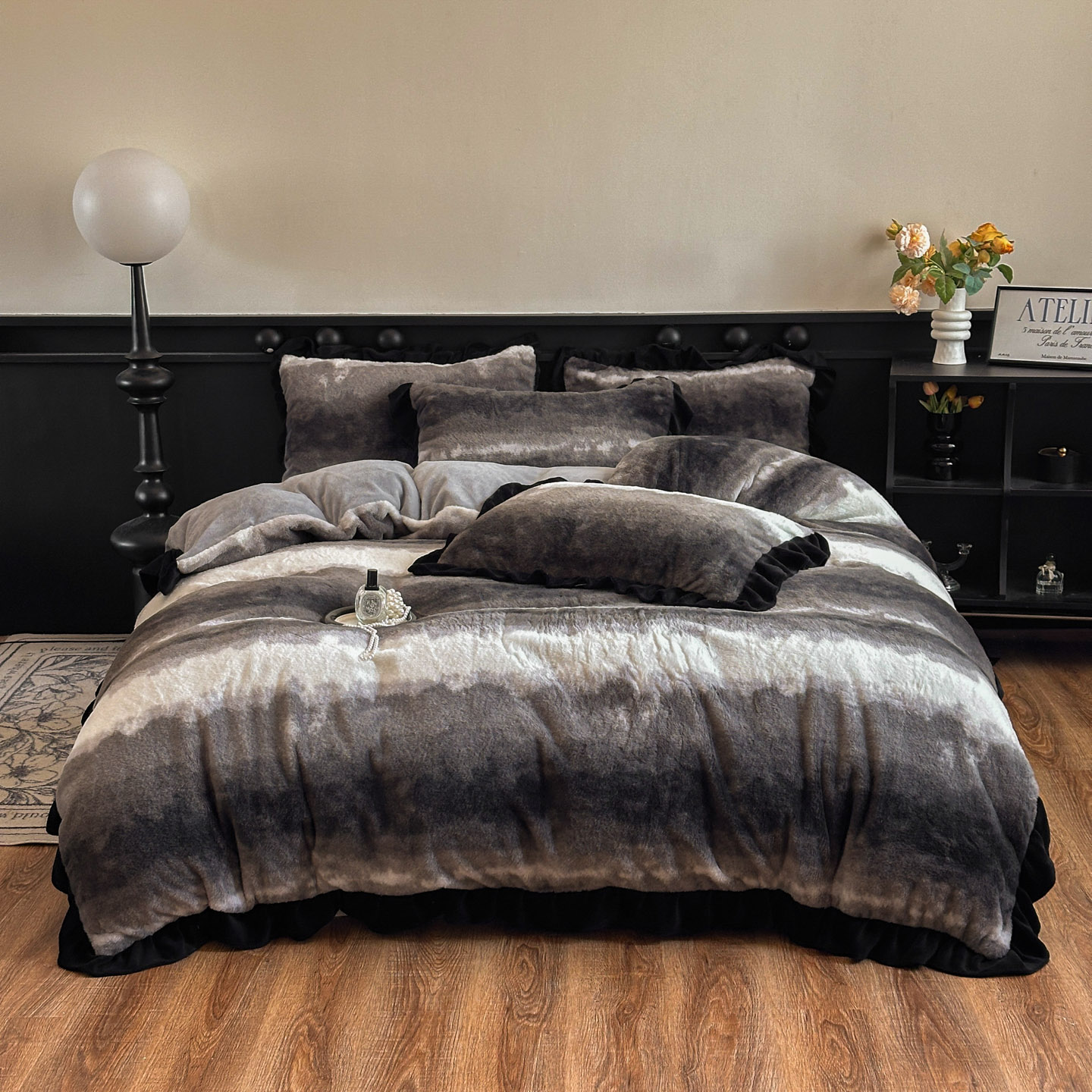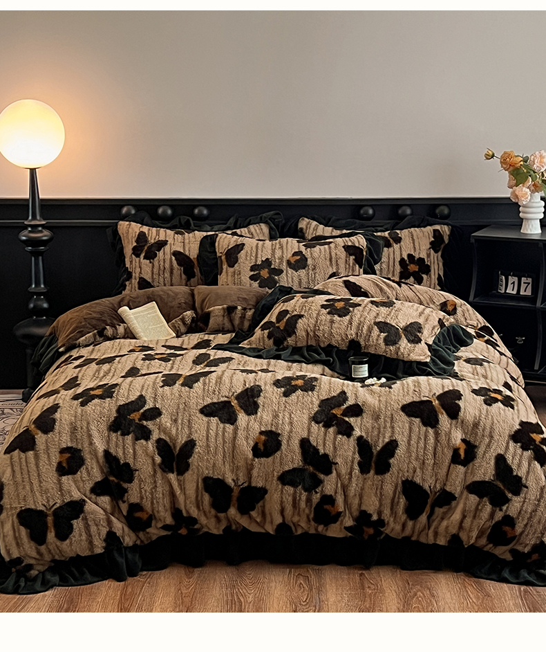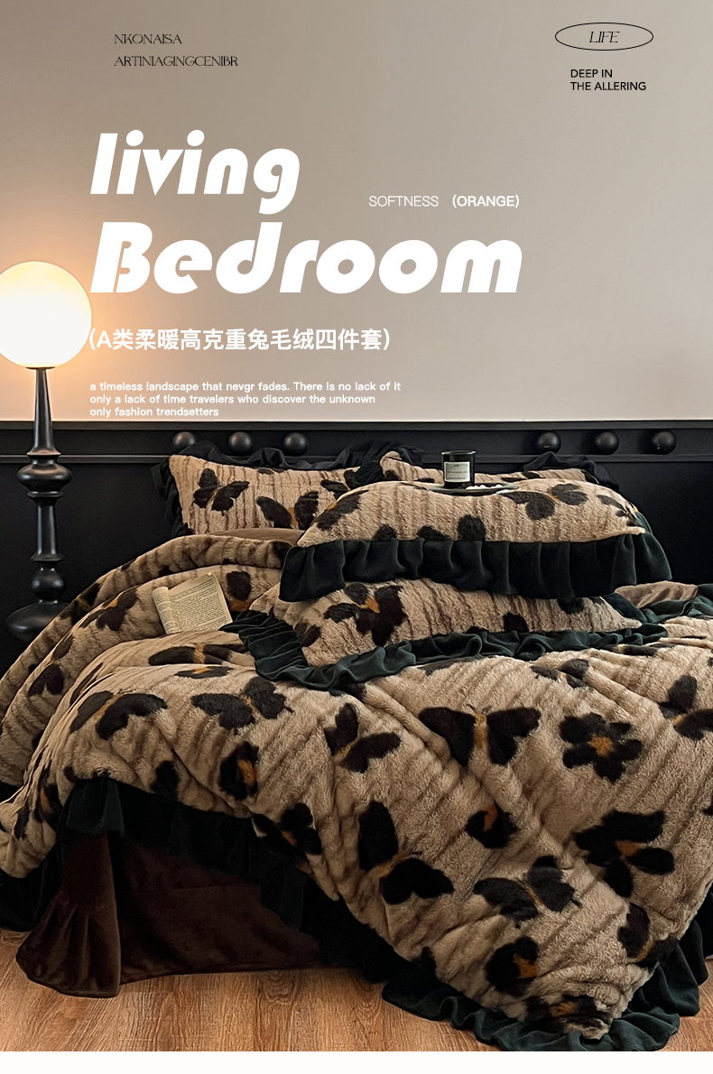 (总)晚爱家居 2025新款韩版黑色花边美拉德兔毛绒四件套高克重皮草兔绒牛奶绒四件套