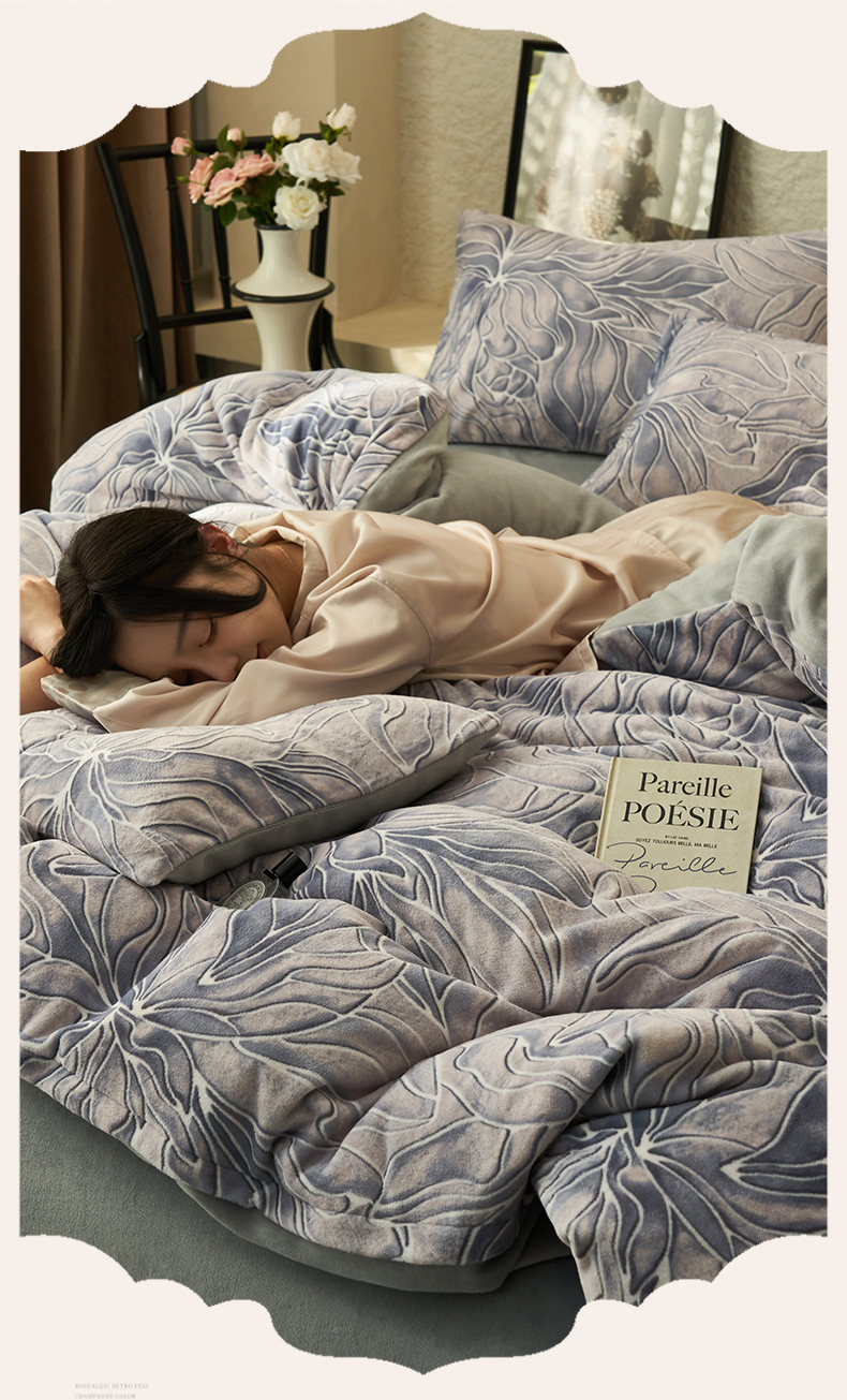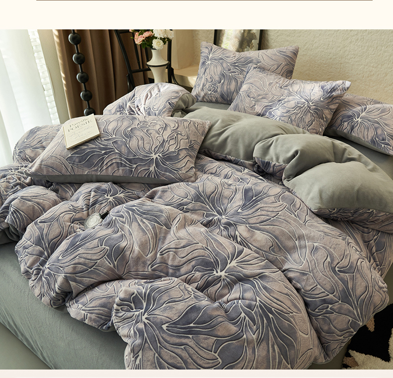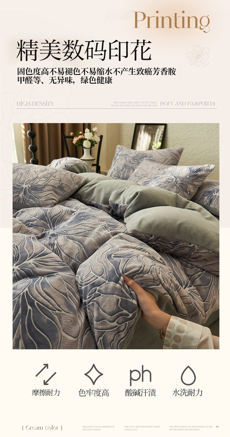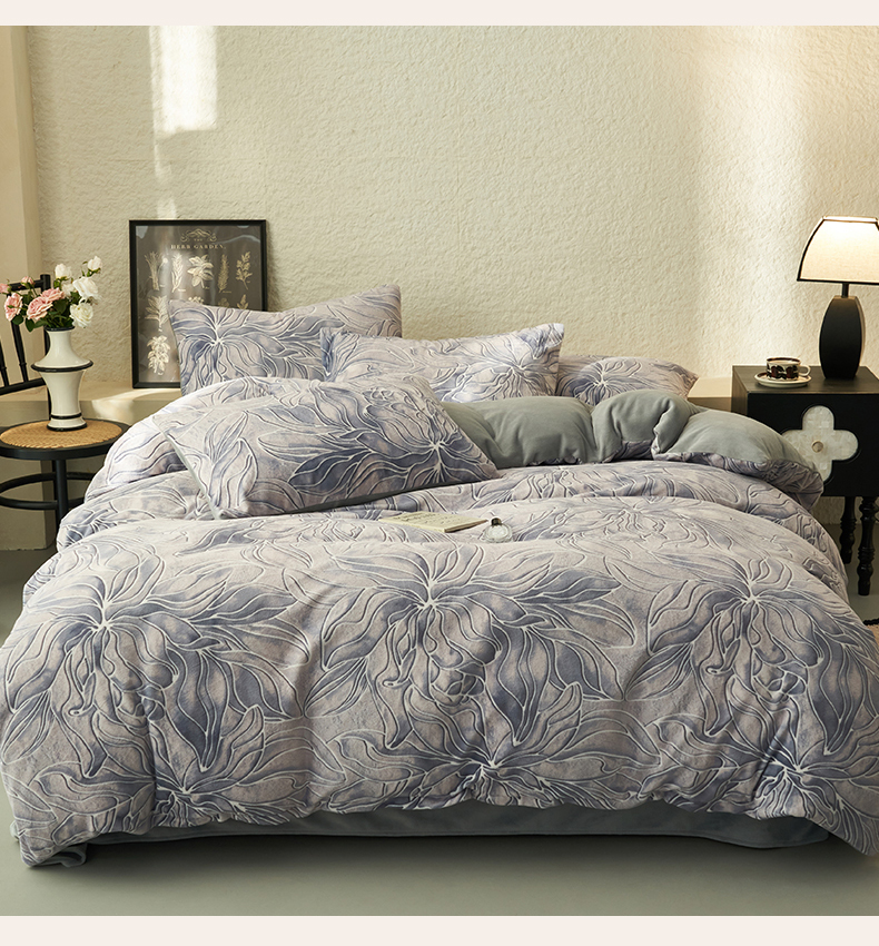 (总)金鹰 2025新款A类雕花牛奶绒烂花兔毛包边四件套,羽毛,波澜壮阔,繁花,蝴蝶梦,简爱,兰花,玫瑰物语,梦幻森林,清晨玫瑰,羽叶,仲夏晨歌