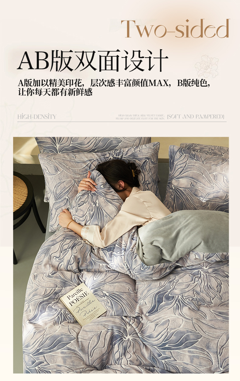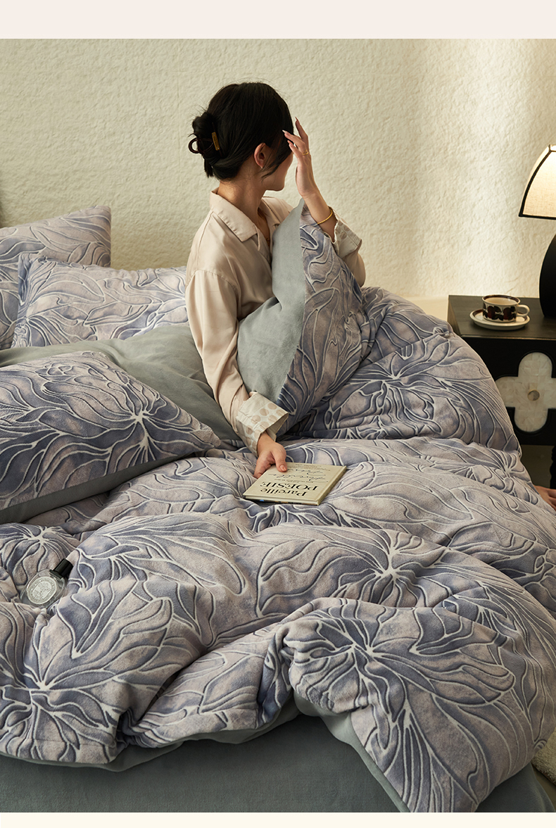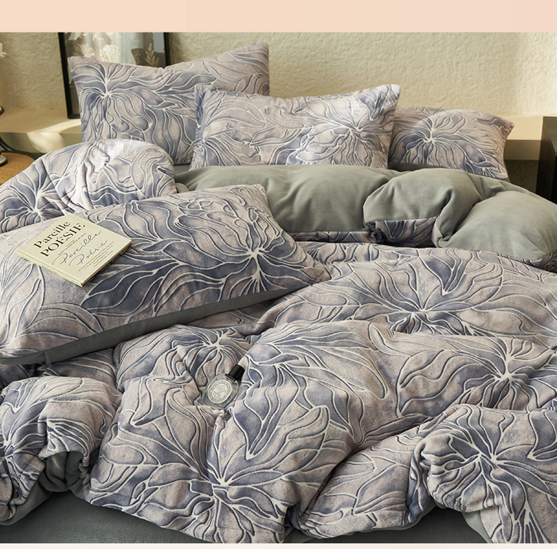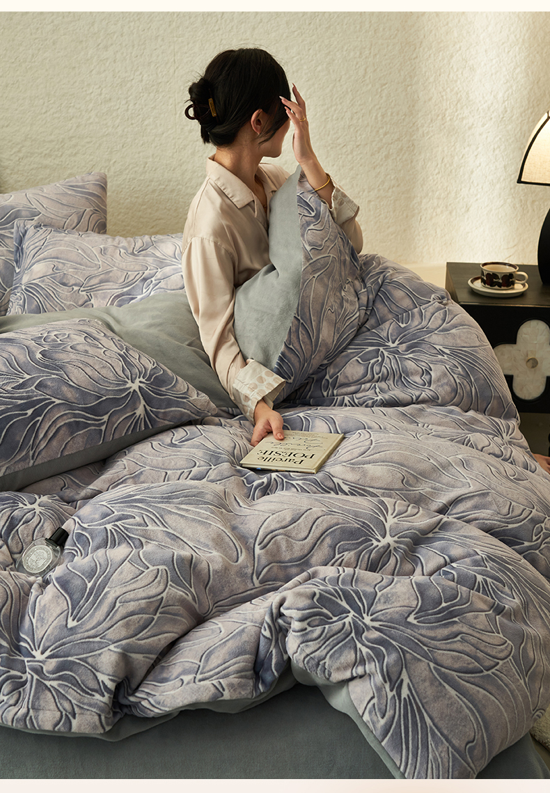 (总)金鹰 2025新款A类雕花牛奶绒烂花兔毛包边四件套,羽毛,波澜壮阔,繁花,蝴蝶梦,简爱,兰花,玫瑰物语,梦幻森林,清晨玫瑰,羽叶,仲夏晨歌