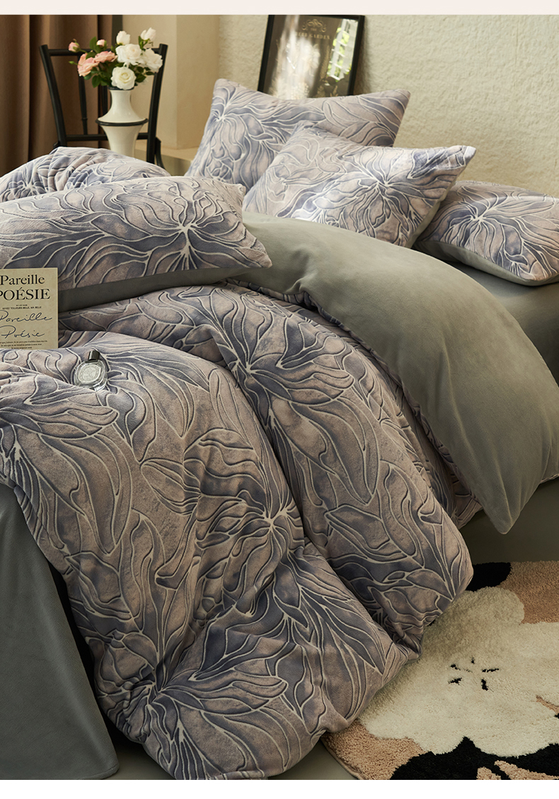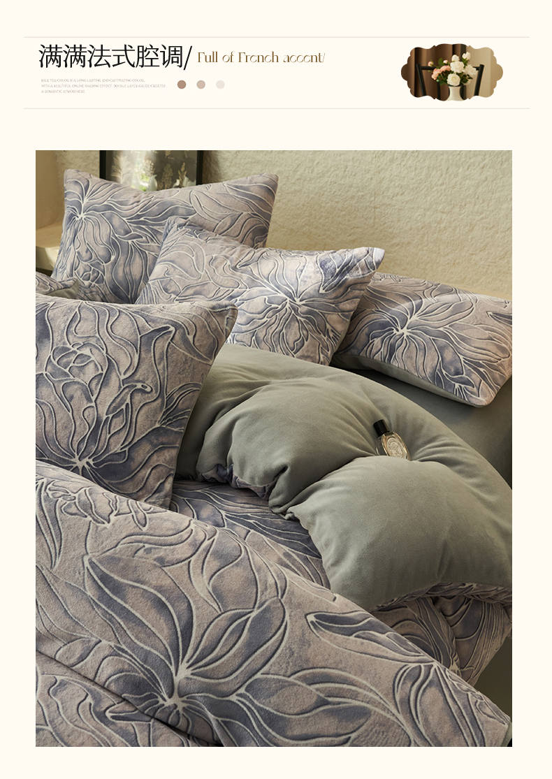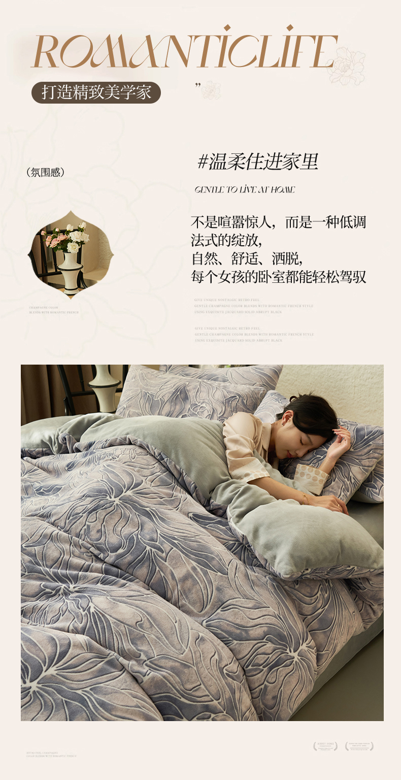 (总)金鹰 2025新款雕花烂花牛奶绒四件套,梦回唐朝,爱丽丝,蝴蝶结,花朝梦,浪漫人生,流年花束,绿野仙踪-灰,绿野仙踪-驼,玫瑰恋情,叶茂,叶叶生辉,叶影