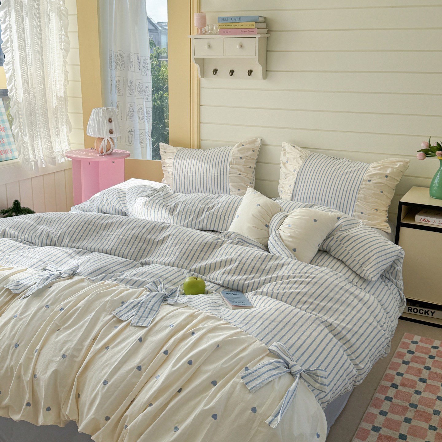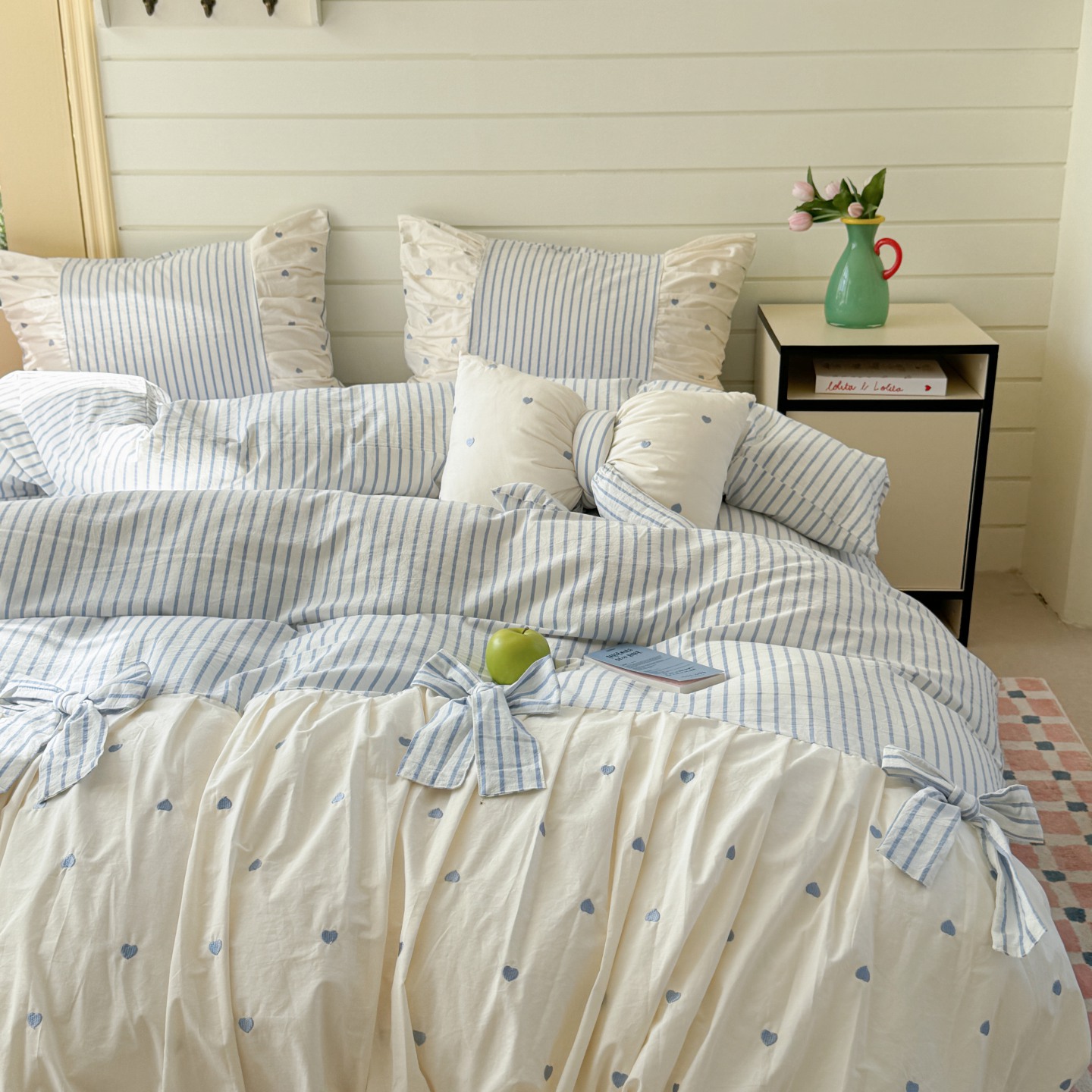 (总)觅糖家纺 2025新款牛奶绒荷叶边小小系列四件套,小小爱心白,小小樱桃酱