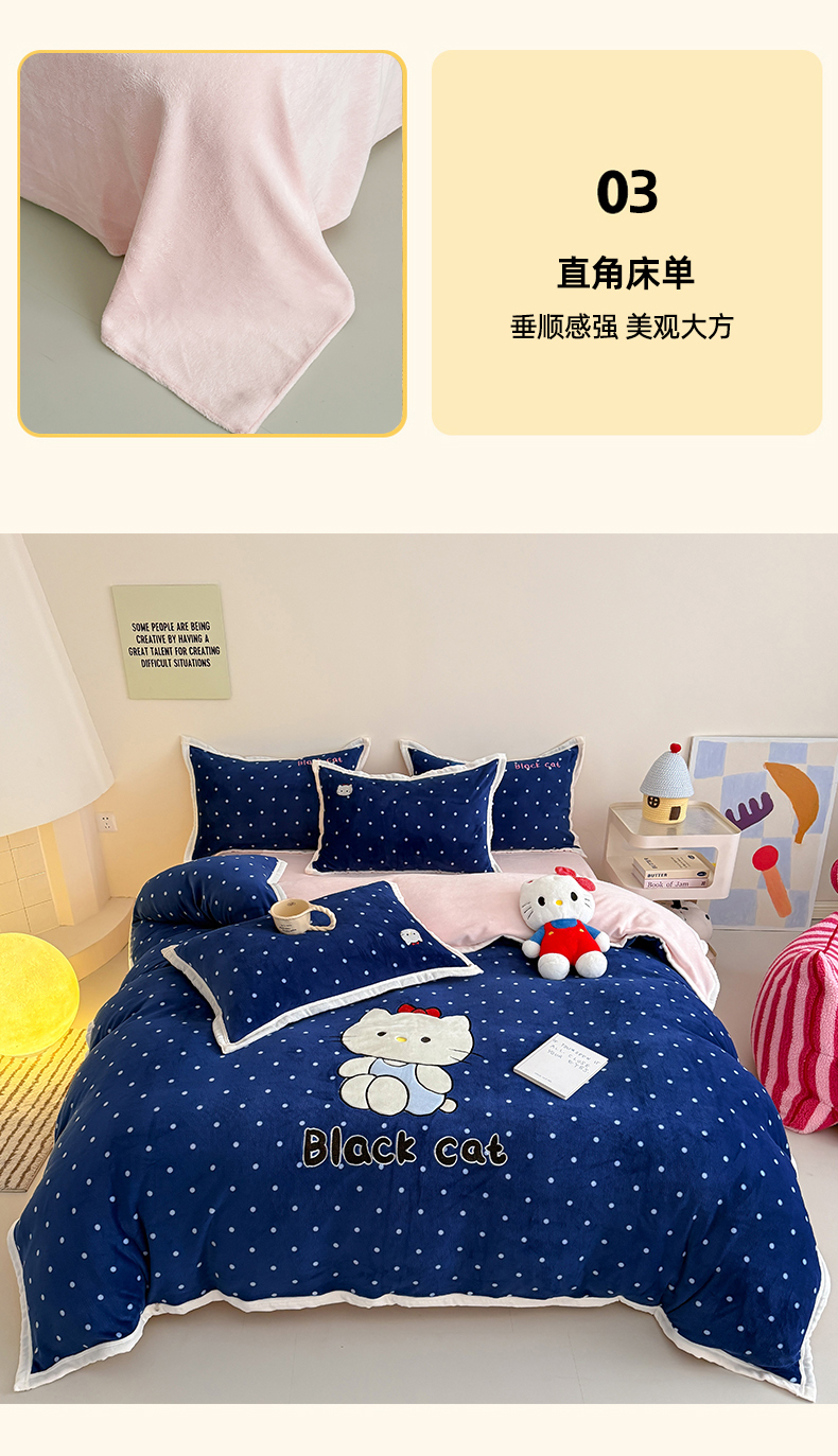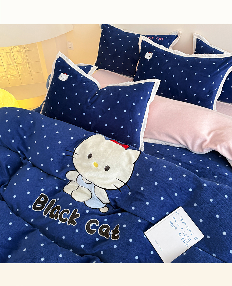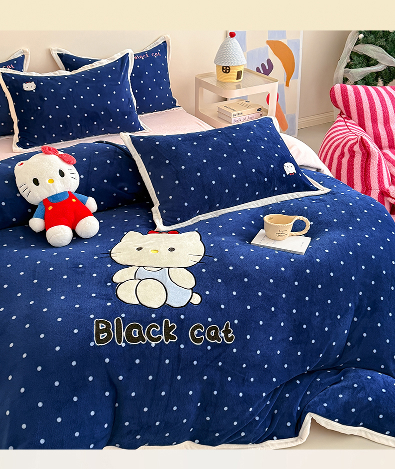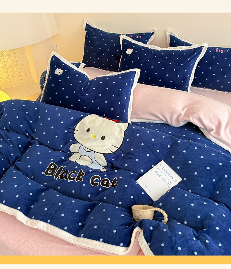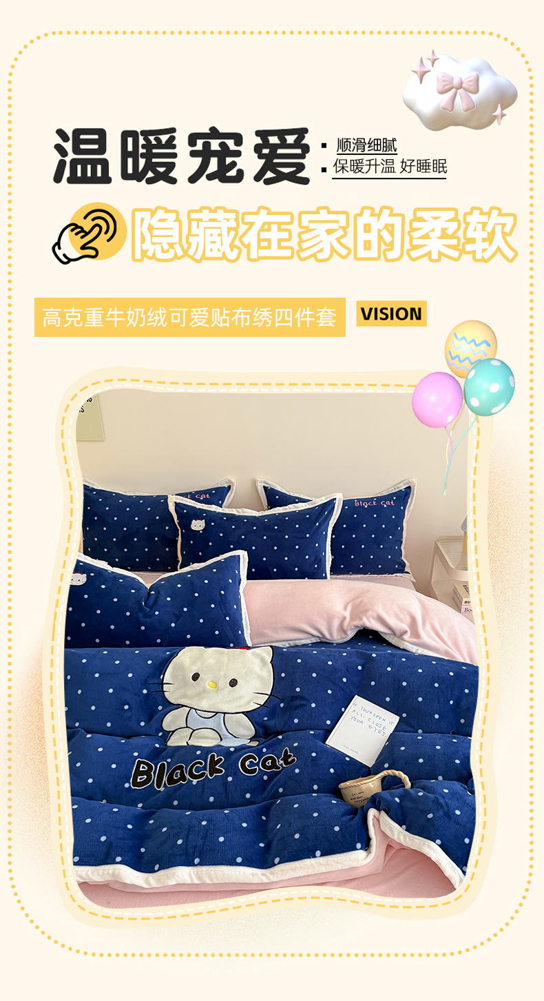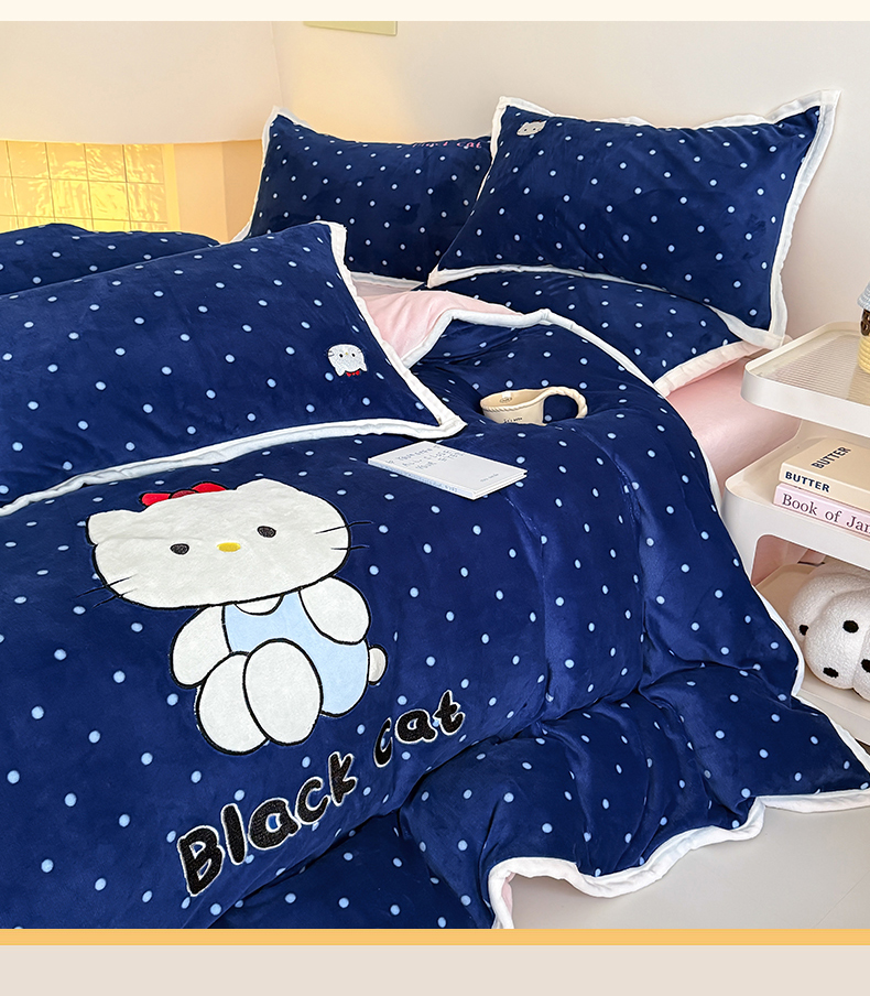 商品名称:艾特你 2025新款200克全工艺高克重牛奶绒贴布绣大包边四件套 蓝色猫咪