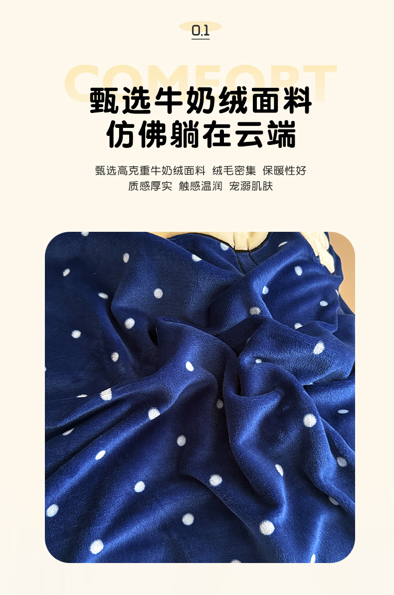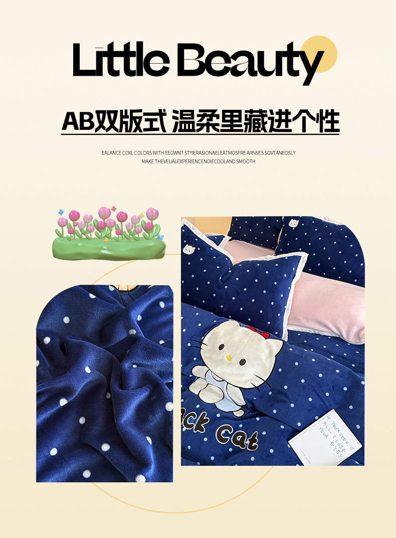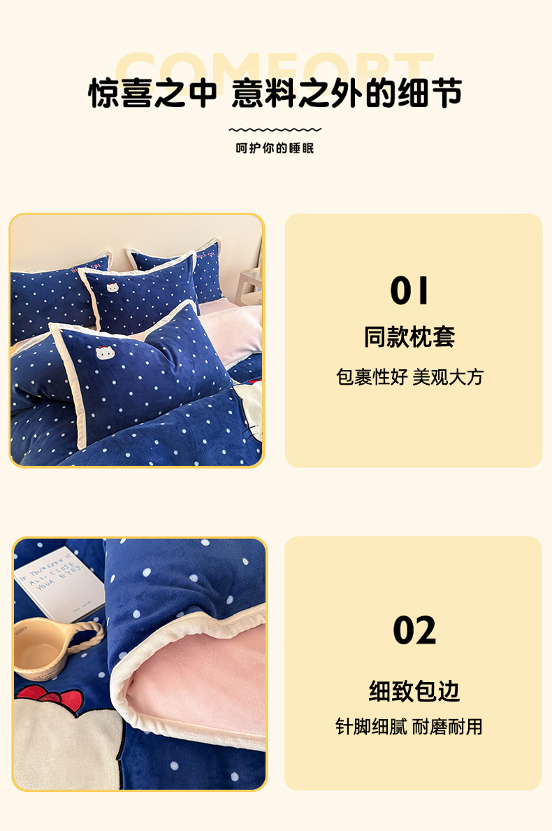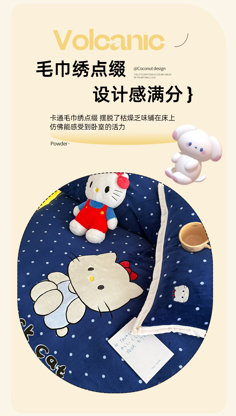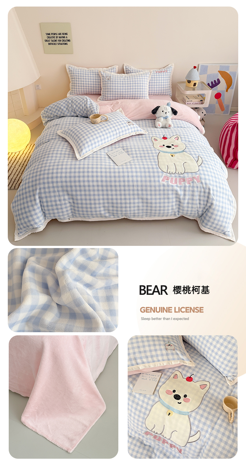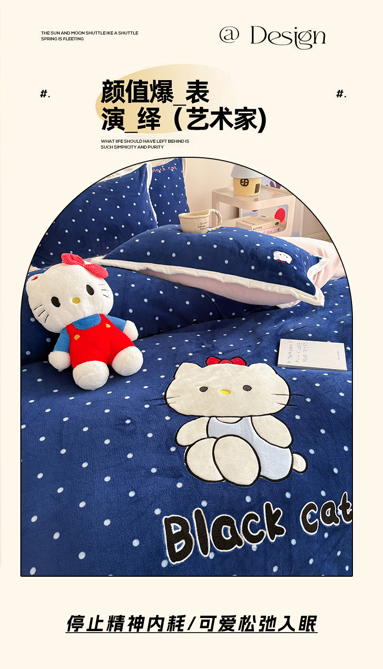 商品名称:艾特你 2025新款200克全工艺高克重牛奶绒贴布绣大包边四件套 蓝色猫咪