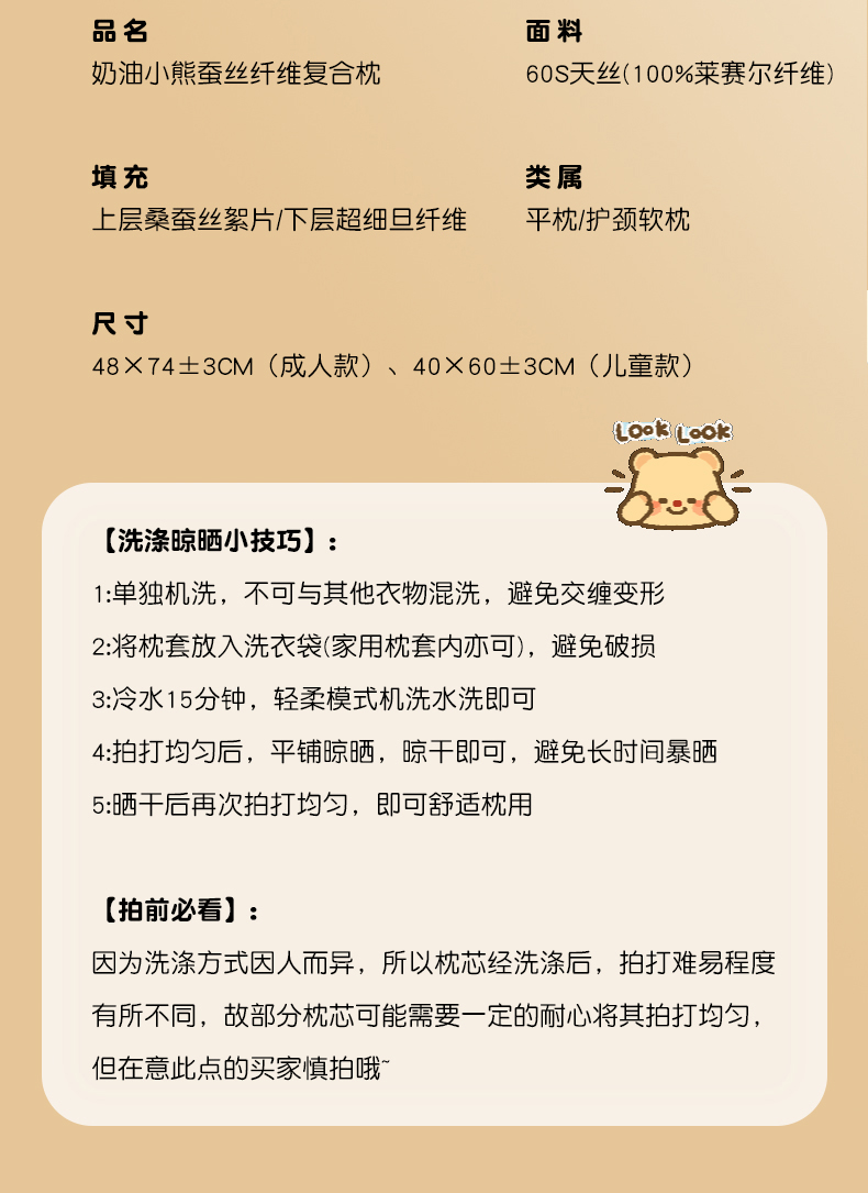 (总)北鸣有鱼枕芯馆 2025新款蚕丝纤维复合枕枕头枕芯-奶油小熊,奶油小熊-成人款 48×74±3cm/只,奶油小熊-儿童款 40×60±3cm/只