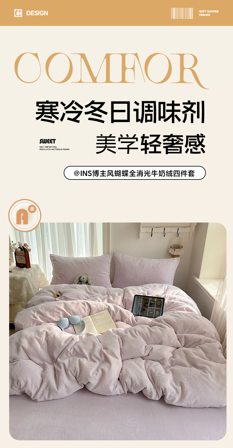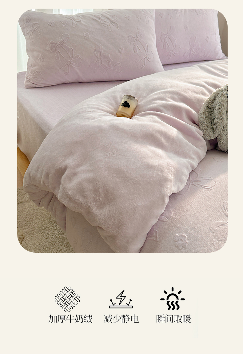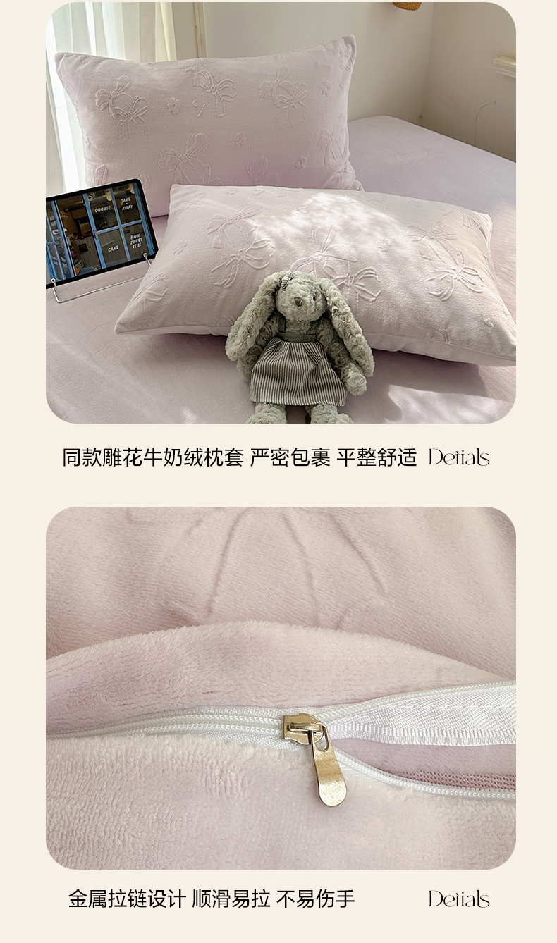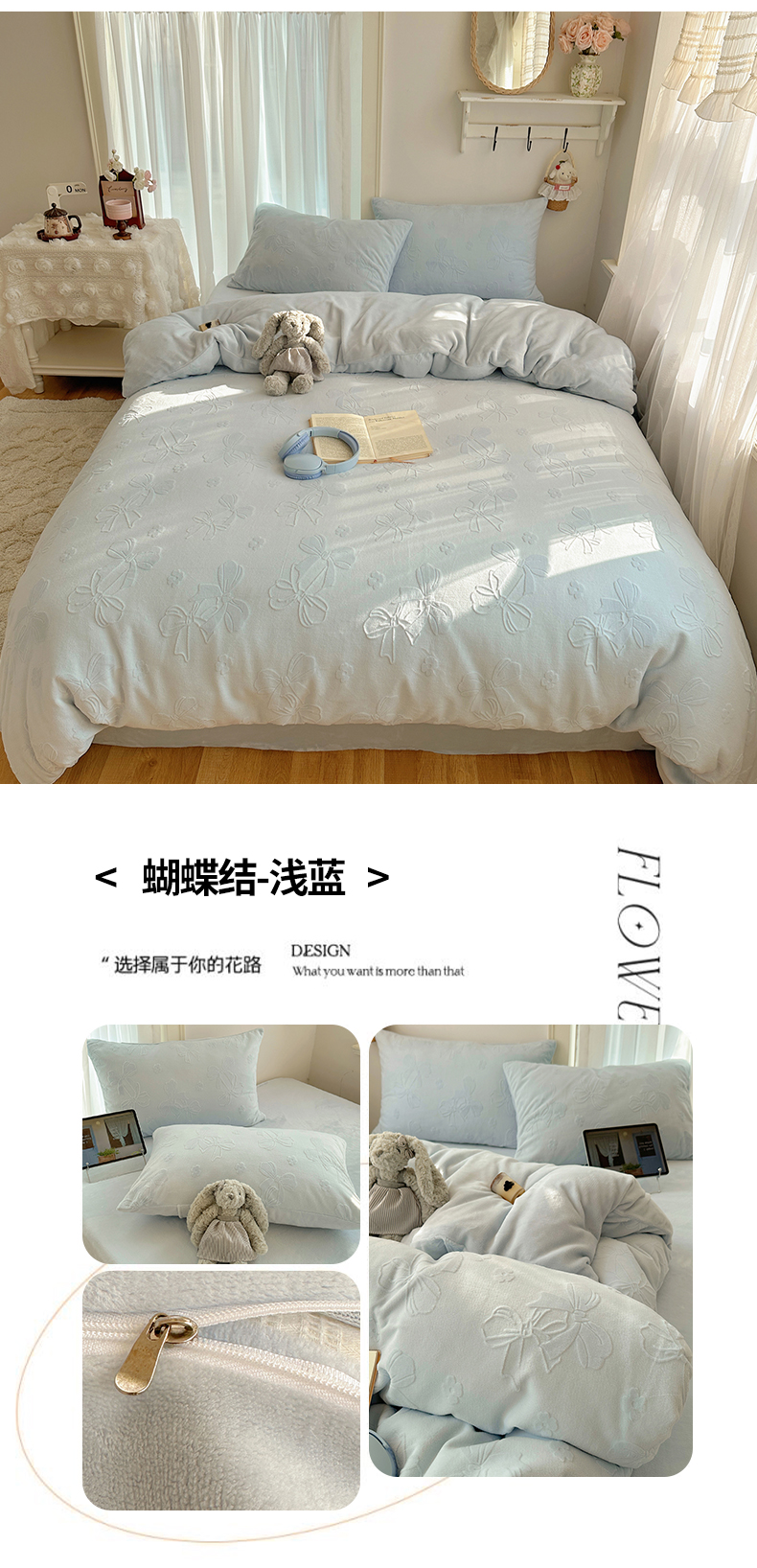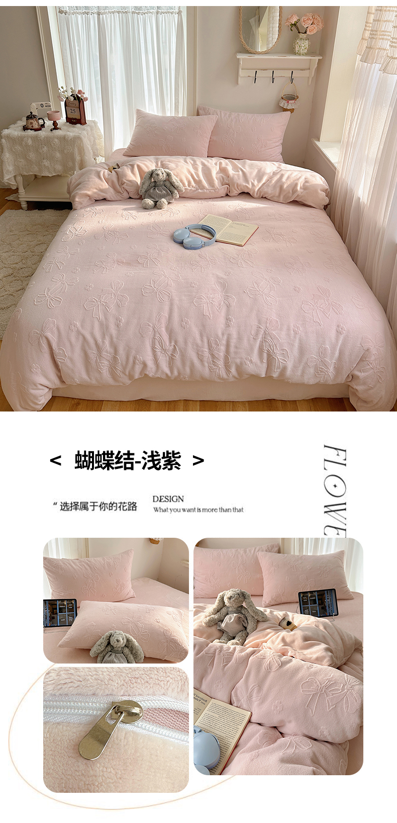 (总)瑞钰 2025新款ins博士风蝴蝶全消光雕花暗合牛奶绒四件套,蝴蝶结-米白,蝴蝶结-浅粉,蝴蝶结-浅蓝,蝴蝶结-浅紫