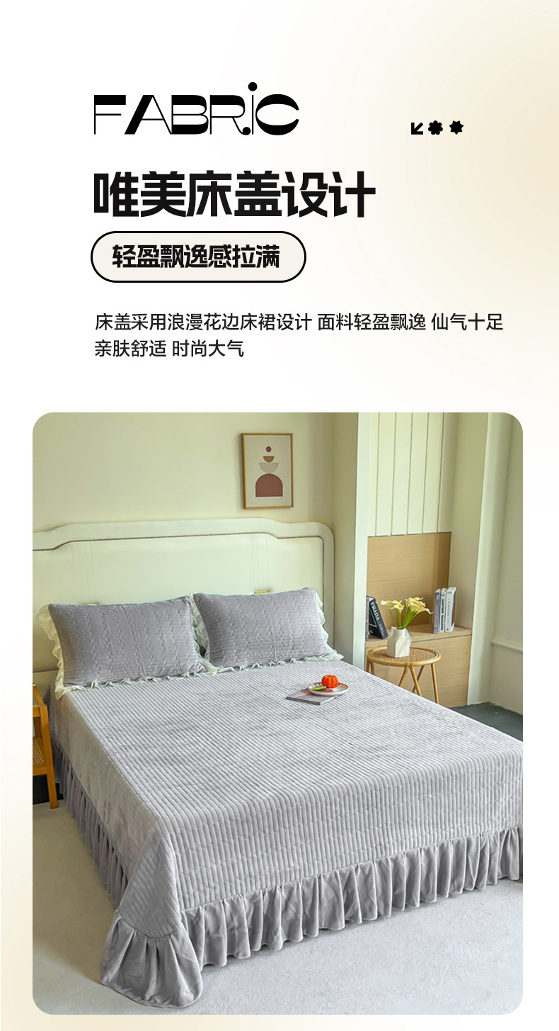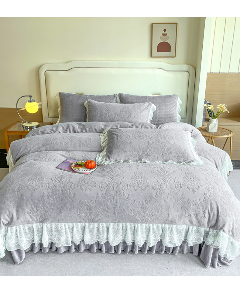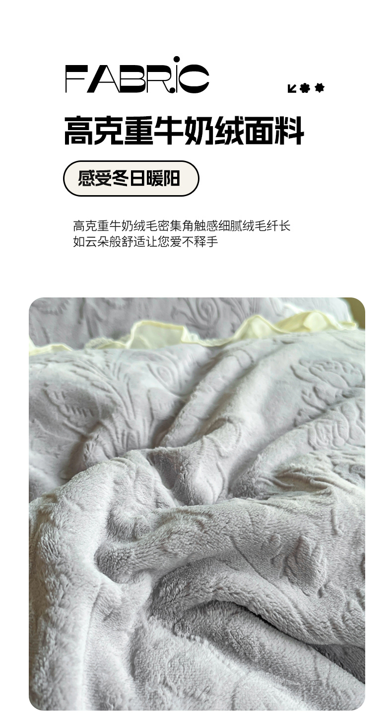 商品名称:木兰花 2025新款纯色雕花全消光牛奶绒 床盖款四件套-繁花绮梦 繁花绮梦-灰色