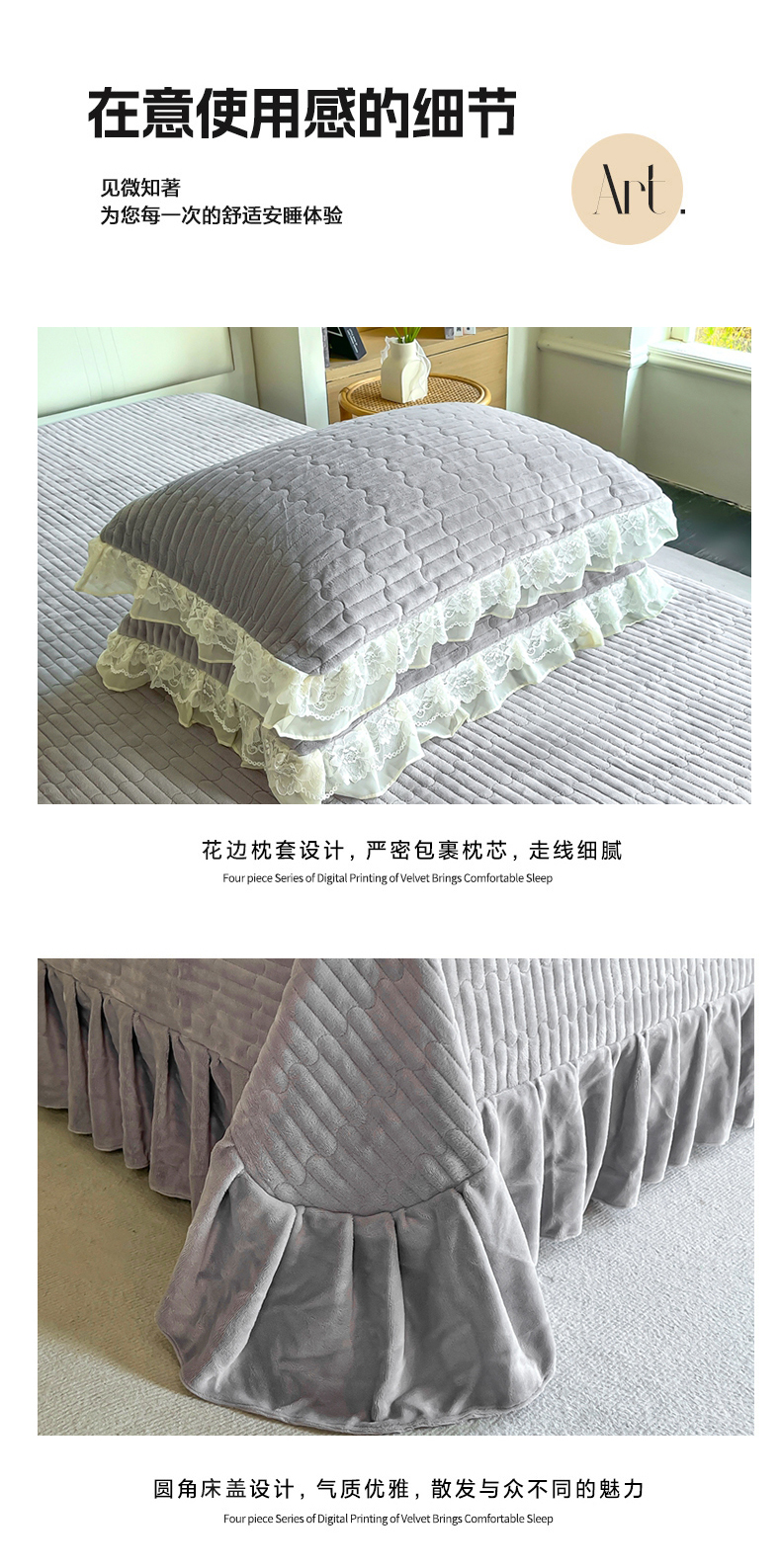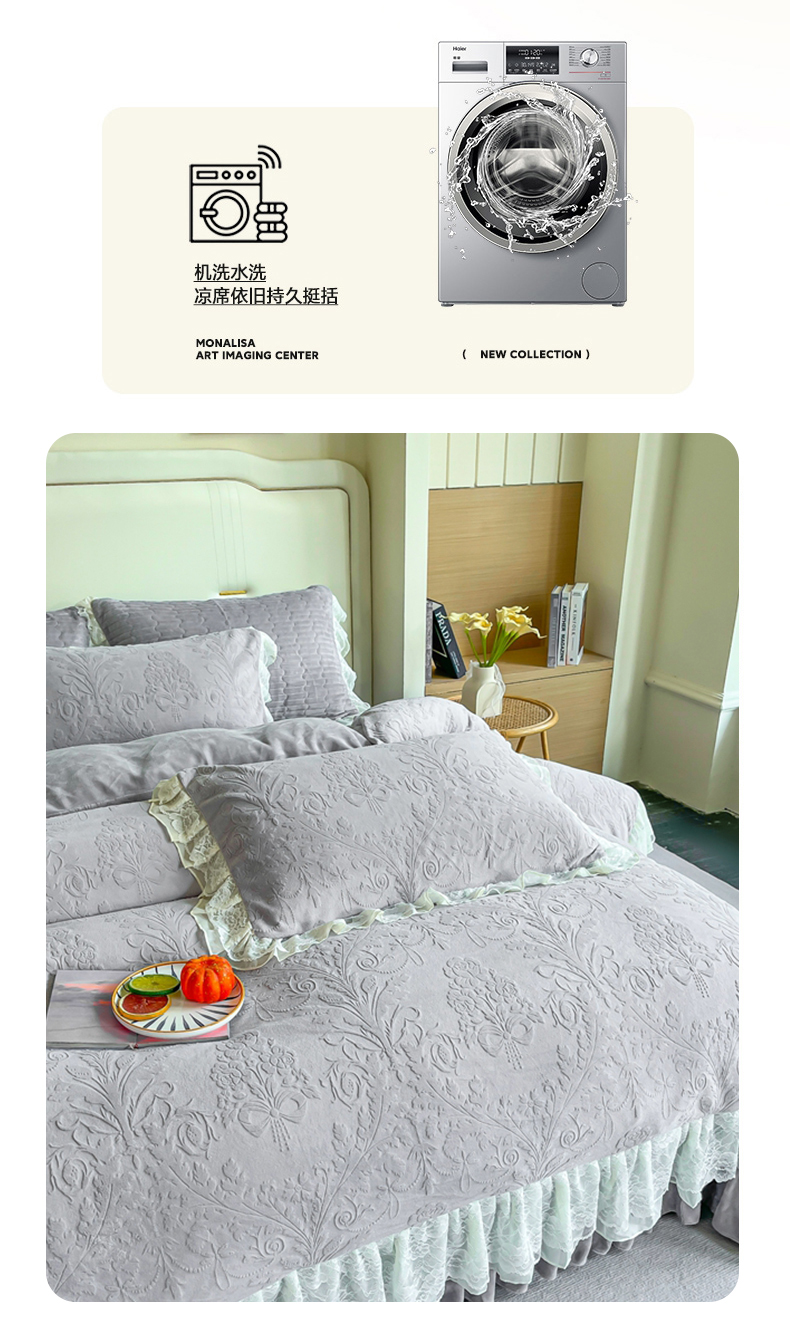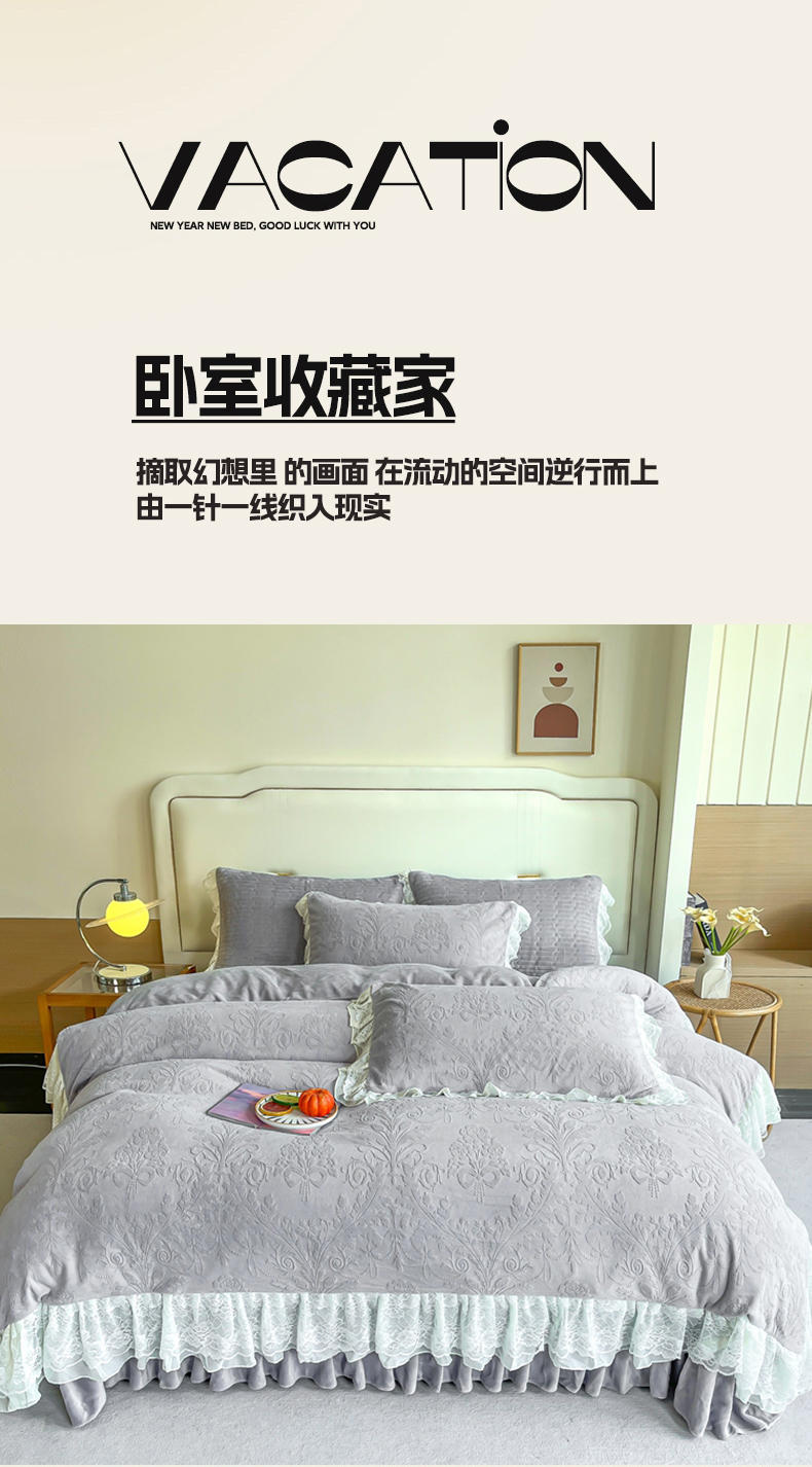 商品名称:木兰花 2025新款纯色雕花全消光牛奶绒 床盖款四件套-繁花绮梦 繁花绮梦-灰色
