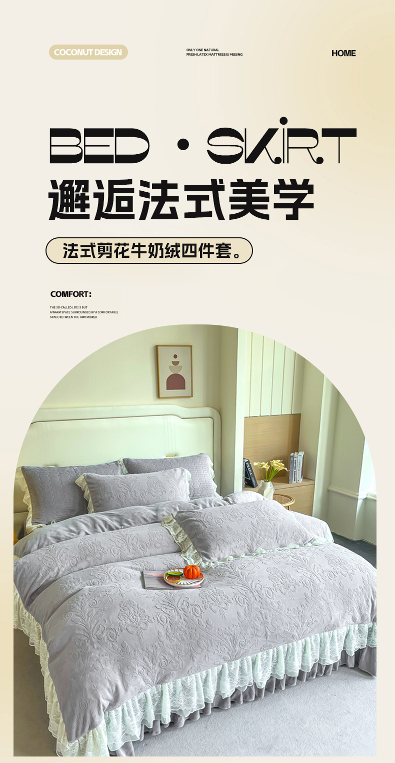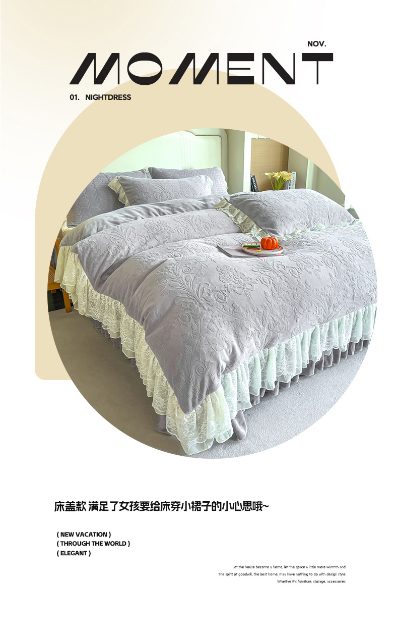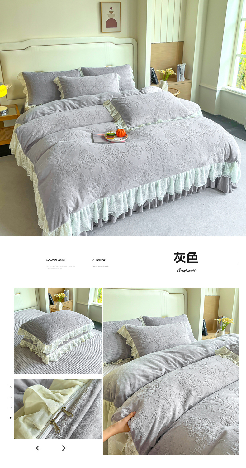 (总)2025新款纯色雕花全消光牛奶绒蕾丝绣花被套夹棉床裙 床盖款四件套(控价268),粉玉,米咖,天蓝,香芋紫,淡紫,豆纱色