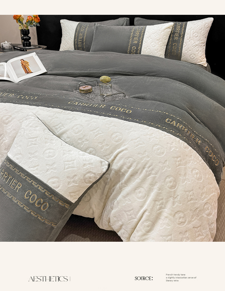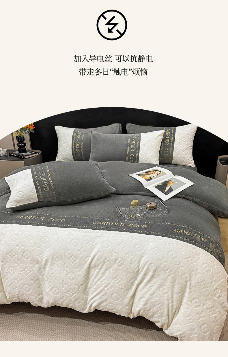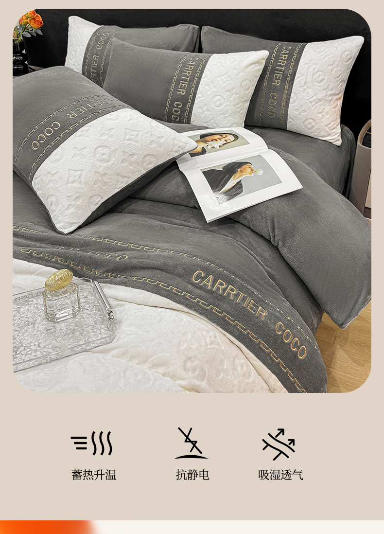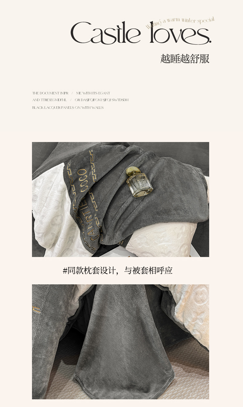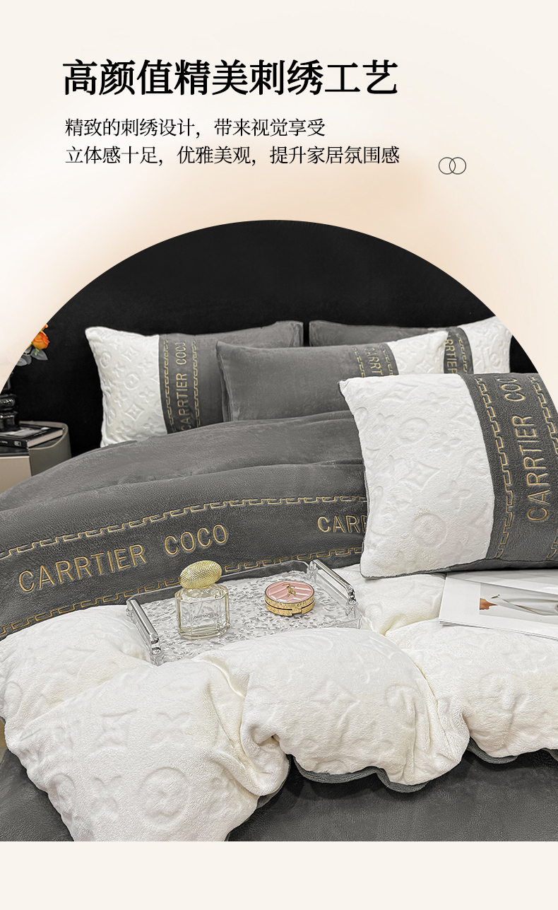 当前位置: 91家纺网 > 商品网购 > 床品套件 > 四件套 > 牛奶绒四件套 > 灰鲸 2025新款牛奶绒拼接刺绣雕花四件套-威登 威登-绅士灰