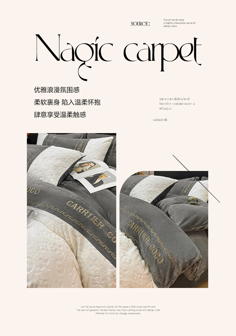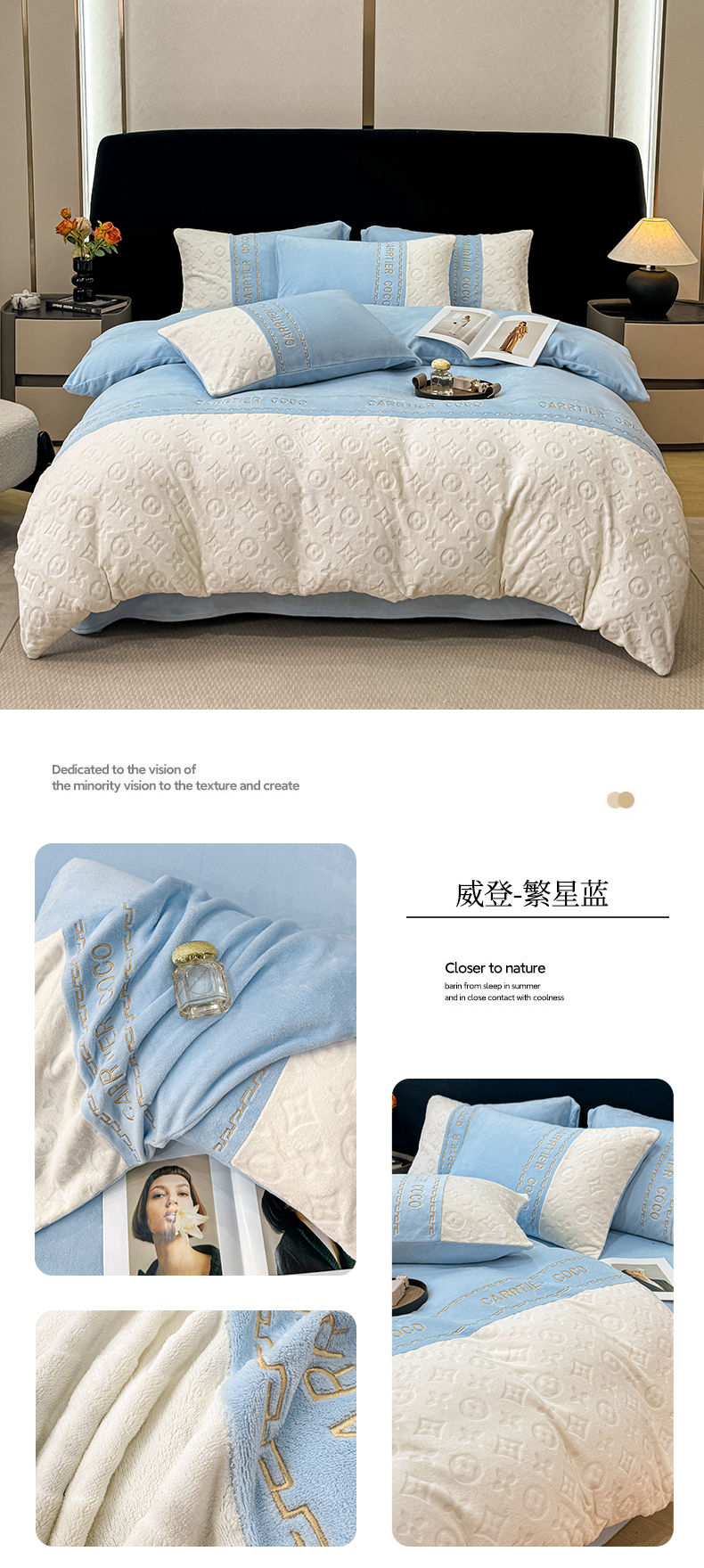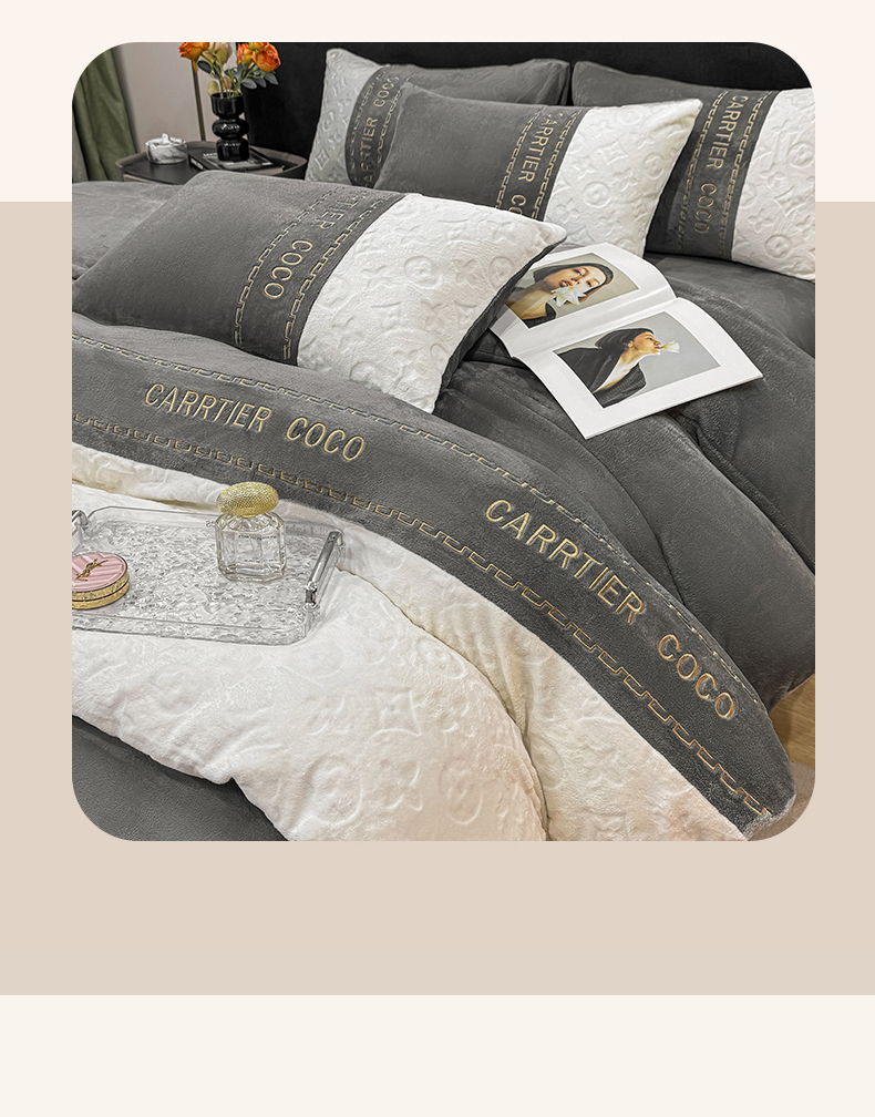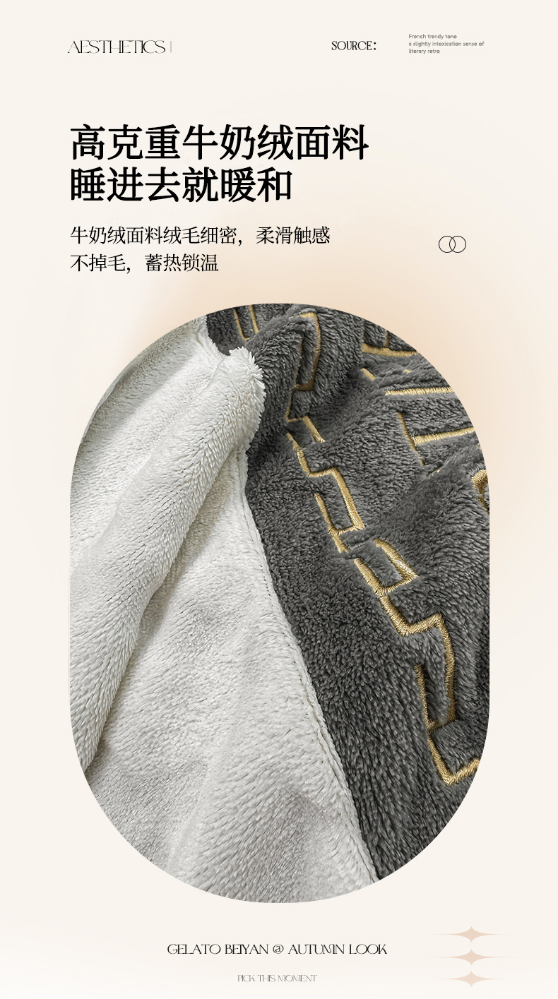 当前位置: 91家纺网 > 商品网购 > 床品套件 > 四件套 > 牛奶绒四件套 > 灰鲸 2025新款牛奶绒拼接刺绣雕花四件套-威登 威登-绅士灰