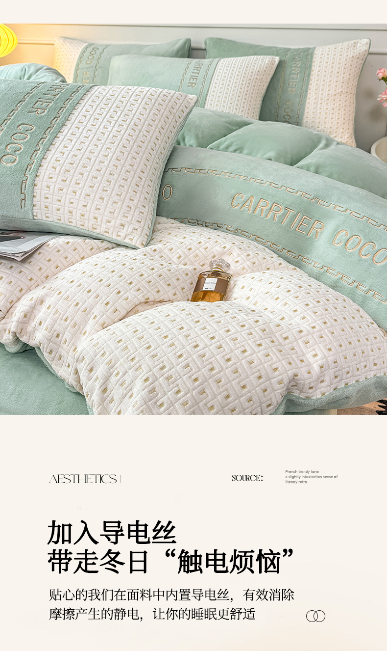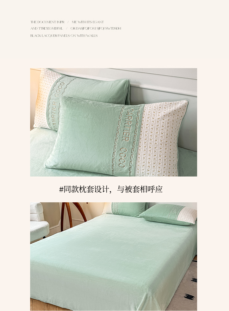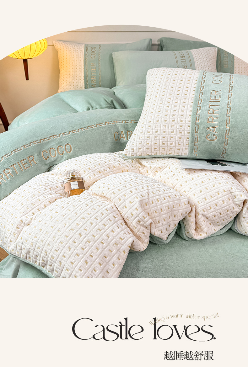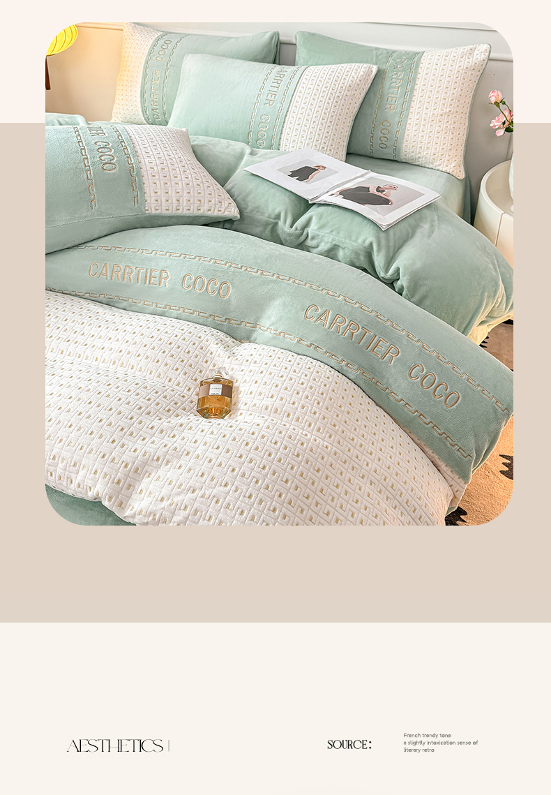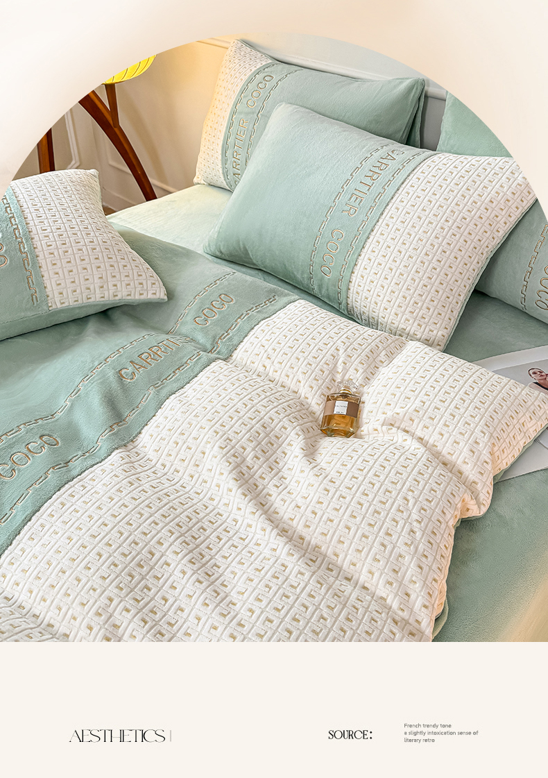 当前位置: 91家纺网 > 商品网购 > 床品套件 > 四件套 > 牛奶绒四件套 > 灰鲸 2025新款牛奶绒刺绣拼接款四件套-威廉 威廉-抹茶绿