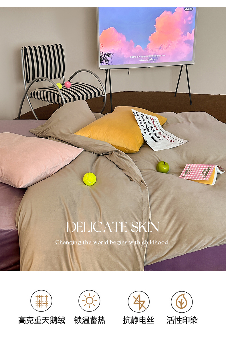 当前位置: 91家纺网 > 商品网购 > 床品套件 > 四件套 > 其它四件套 > 例外 2025新款日式良品190克高克重天鹅绒HD混搭系列四件套 HD玉粉