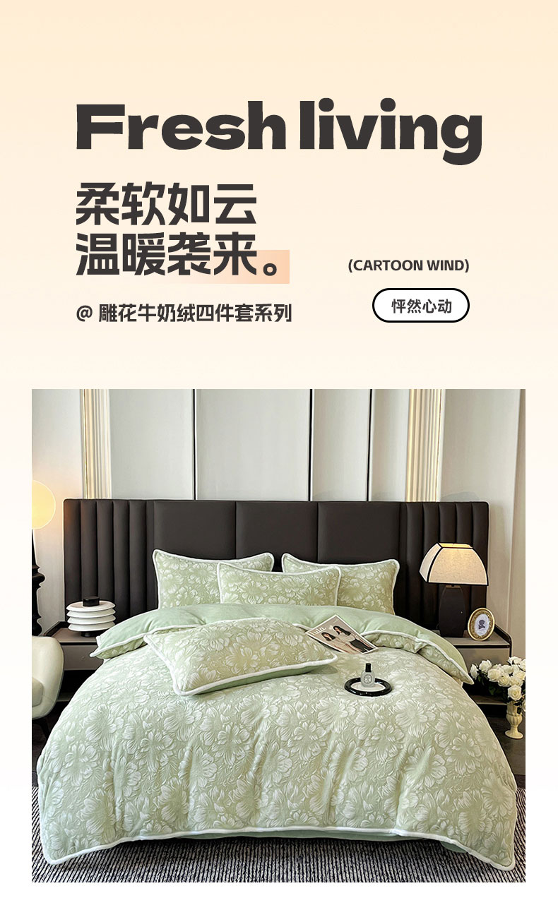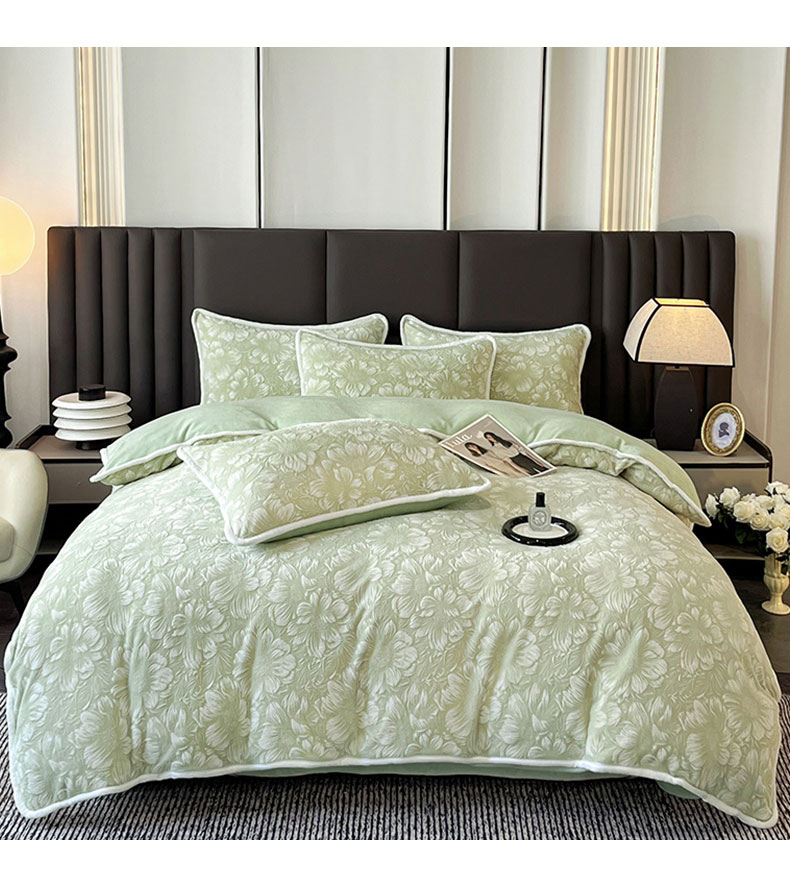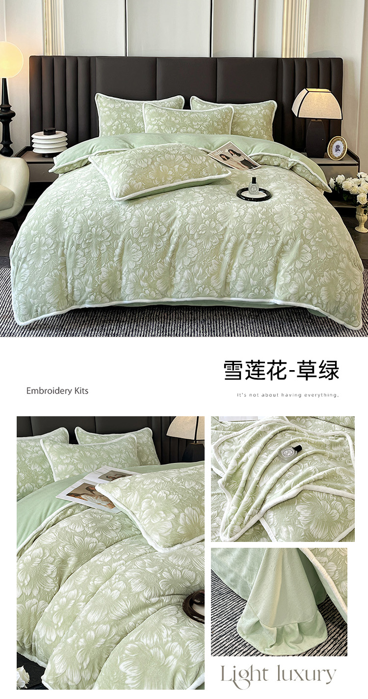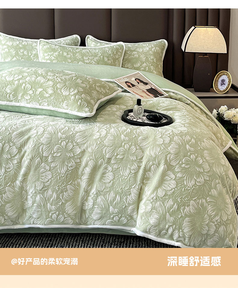 妮恒美家纺 2025新款雕花牛奶绒四件套 雪莲花-草绿