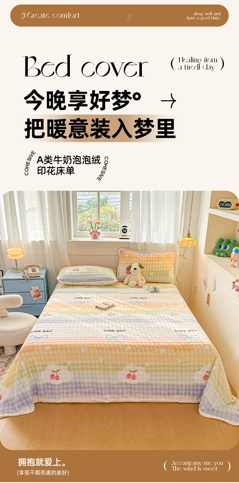 (总)丝芙妮家居(原乐视家纺) 2025新款A类牛奶泡泡绒印花单品床单,草莓小猫,春日樱桃,纯真小熊,狗狗乐园,假日小狗,快乐小熊猫,漫花香,泡芙KT,轻舞梦蝶,甜蜜黛露,甜糯凯蒂,晚安宝贝,西高地,心愿蝴蝶-咖,心愿蝴蝶-绿,夜幕星辰,慵懒KT,遇见花海,紫色蝴蝶结,可爱颂