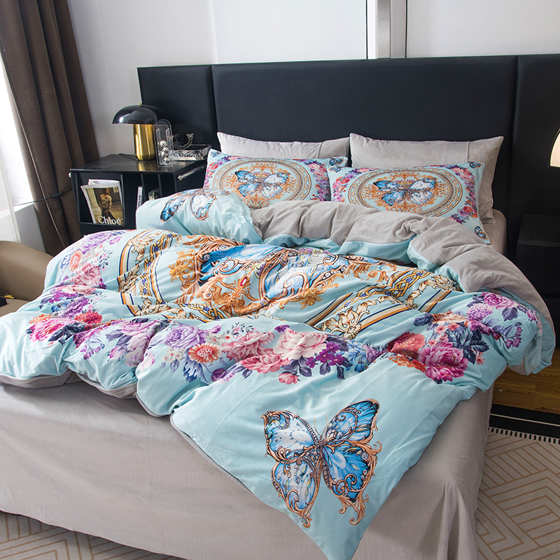 (总)爵仕 2023新款秋冬牛奶绒数码印花四件套保暖,宝蓝,简约蓝,魅力红,暖粉,烟灰