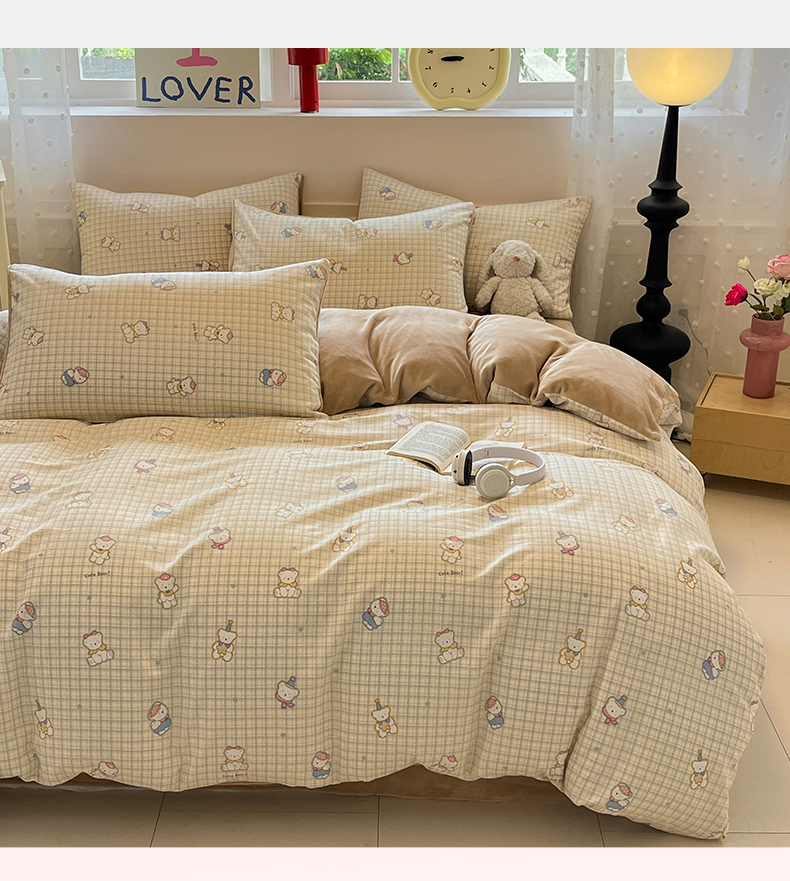 吉象家纺 2025新款全棉牛奶绒印花四件套 棉绒-格子熊