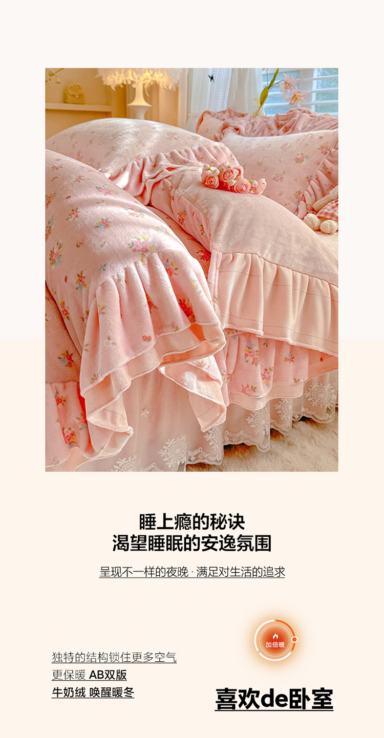商品名称:苏米娜2025新款高克重11斤重直播热款双层蕾丝花边全消光牛奶绒印花床盖四件套单床盖床盖三件套 玫瑰恋语