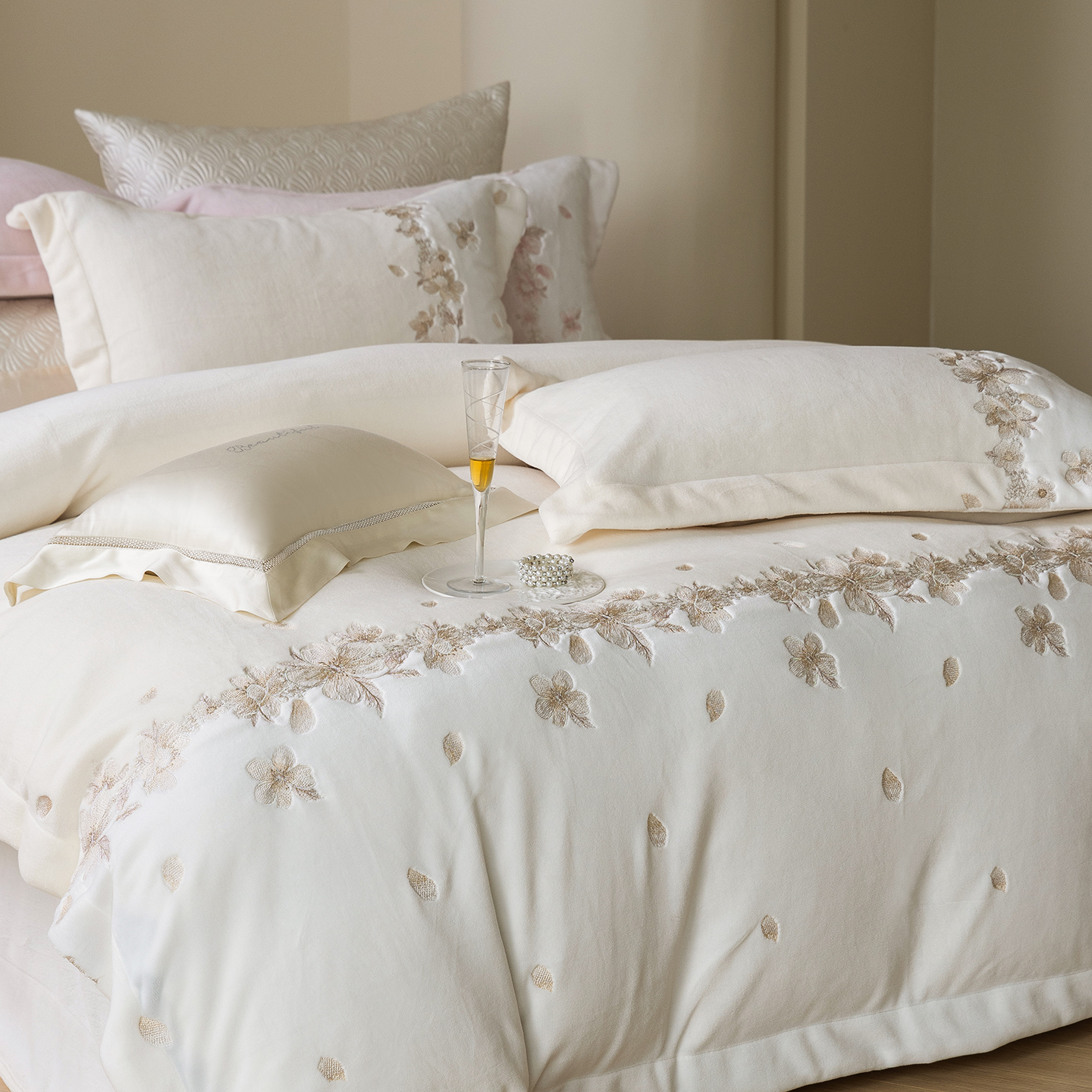 (总)佳汐蓝家纺 2026新款新疆长绒棉全棉纯棉轻奢五线刺绣四件套,初雪白,稻谷米,冷釉灰,汐雾蓝,薰衣紫,釉粉,朱砂红