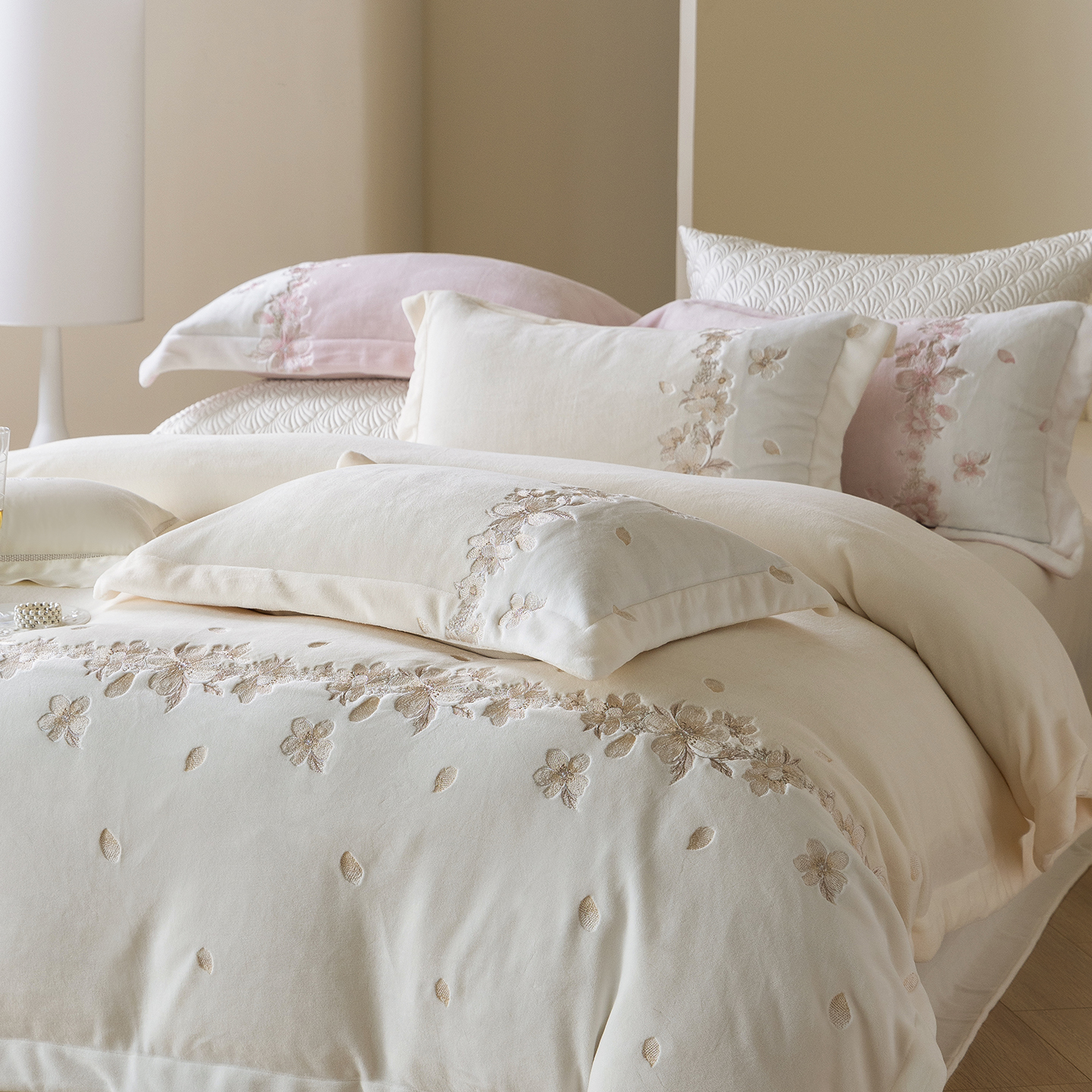 佳汐蓝家纺 2025新款双色拼接刺绣全消光牛奶绒四件套-花沐语 控价:券后不低于398 绒 花沐语-粉色