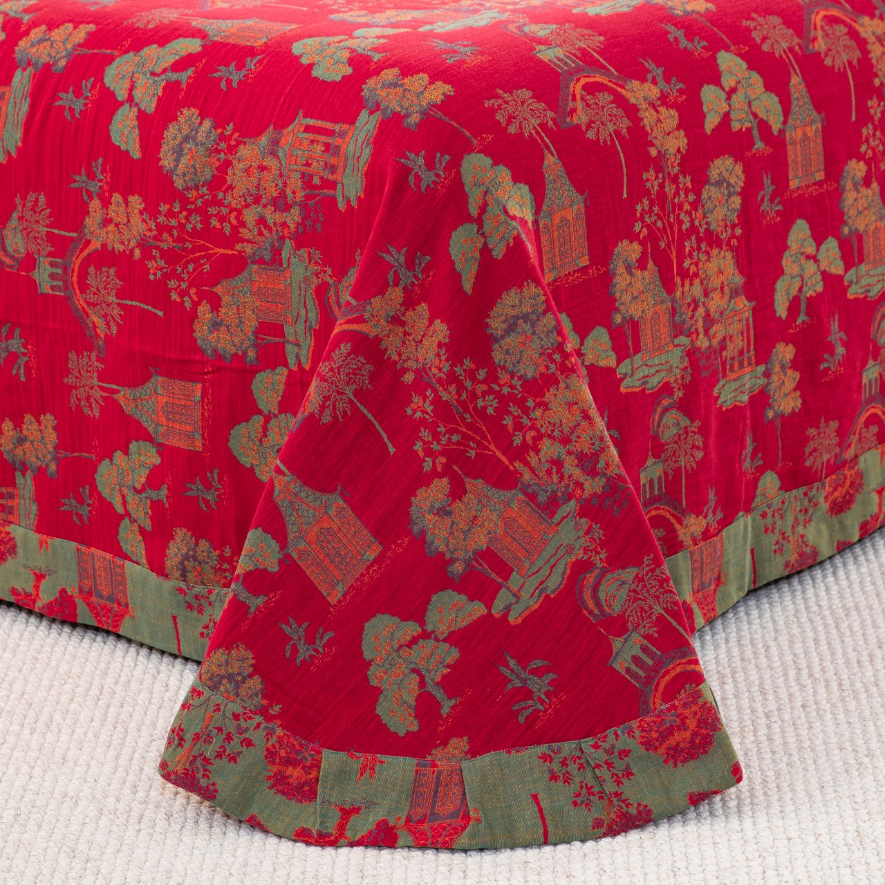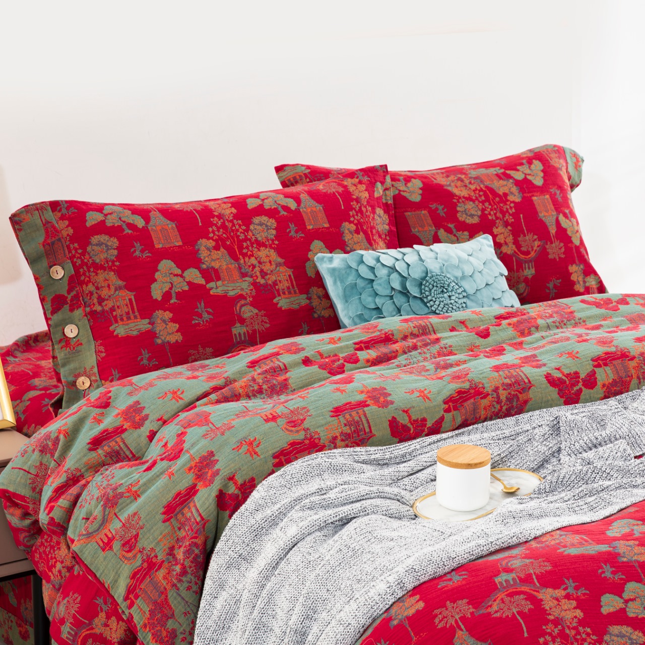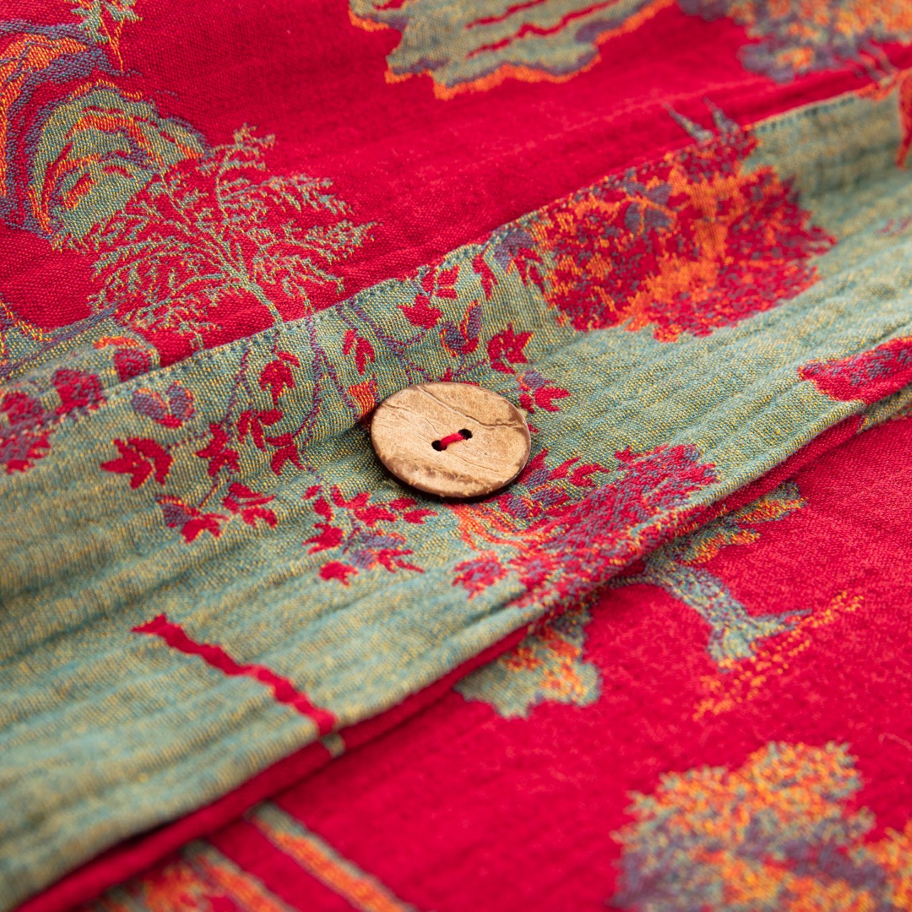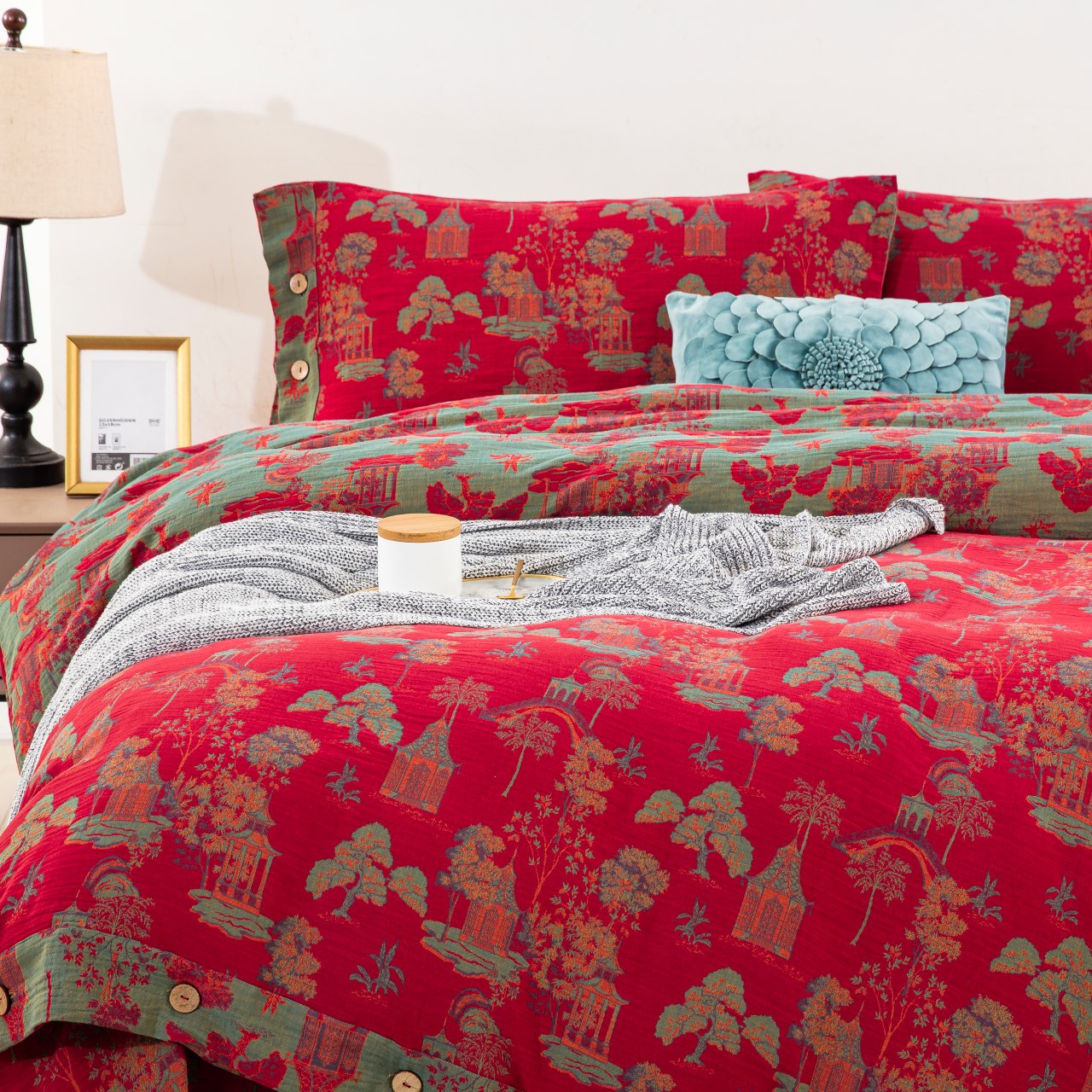商品名称:仰望棉麻双层纱供应链 2026新款全棉色织提花纽扣款四件套--森林庭院 森林庭院--正红