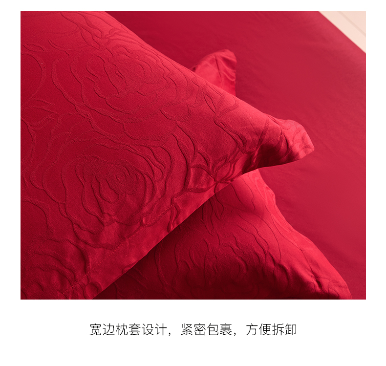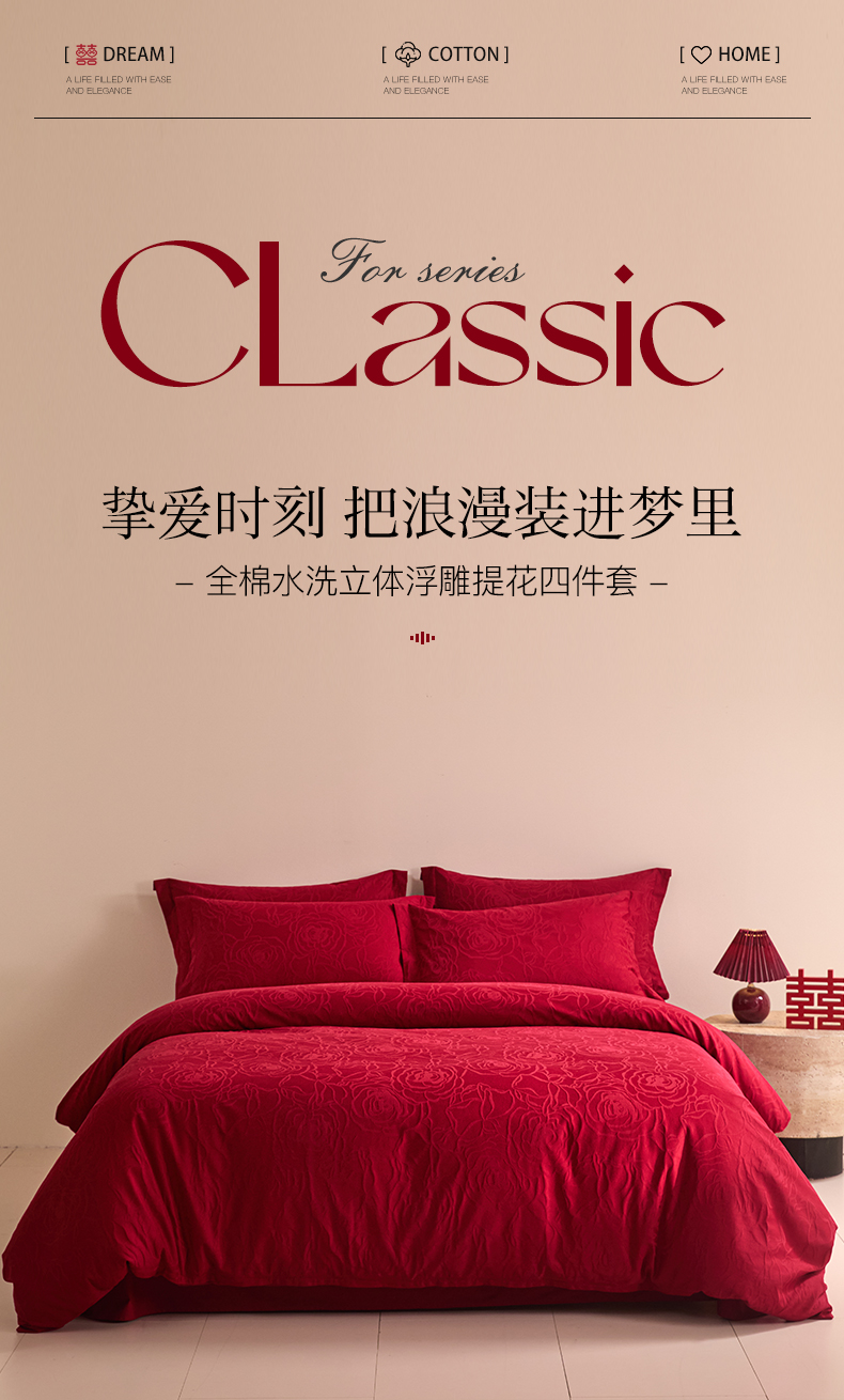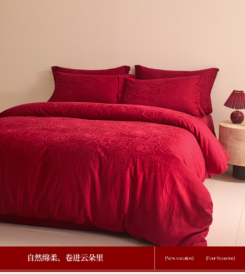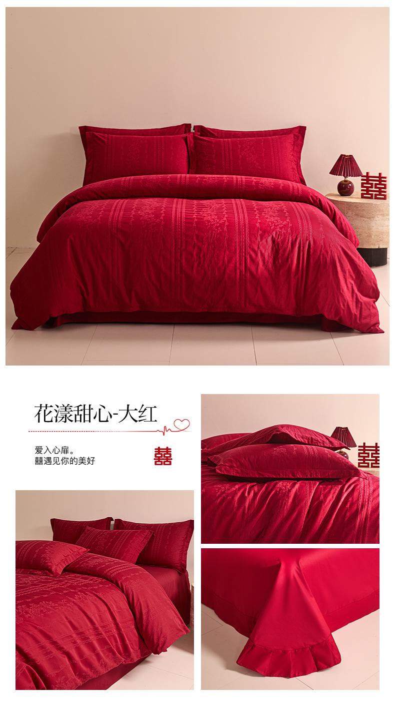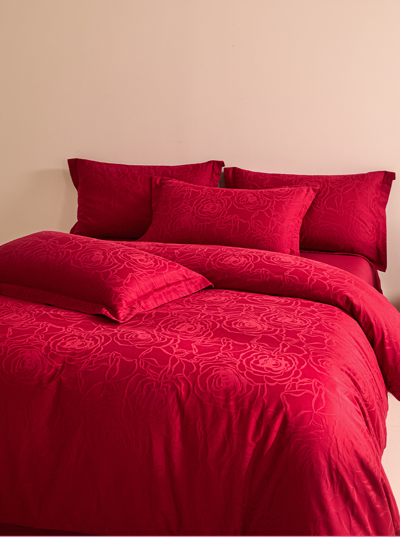 当前位置: 91家纺网 > 商品网购 > 床品套件 > 四件套 > 婚庆四件套 > 格里芬家纺 2026新款全棉水洗立体浮雕提花大红婚庆四件套 玫香-大红