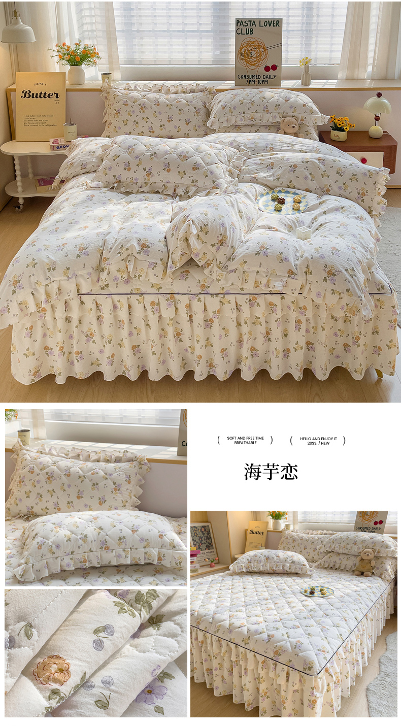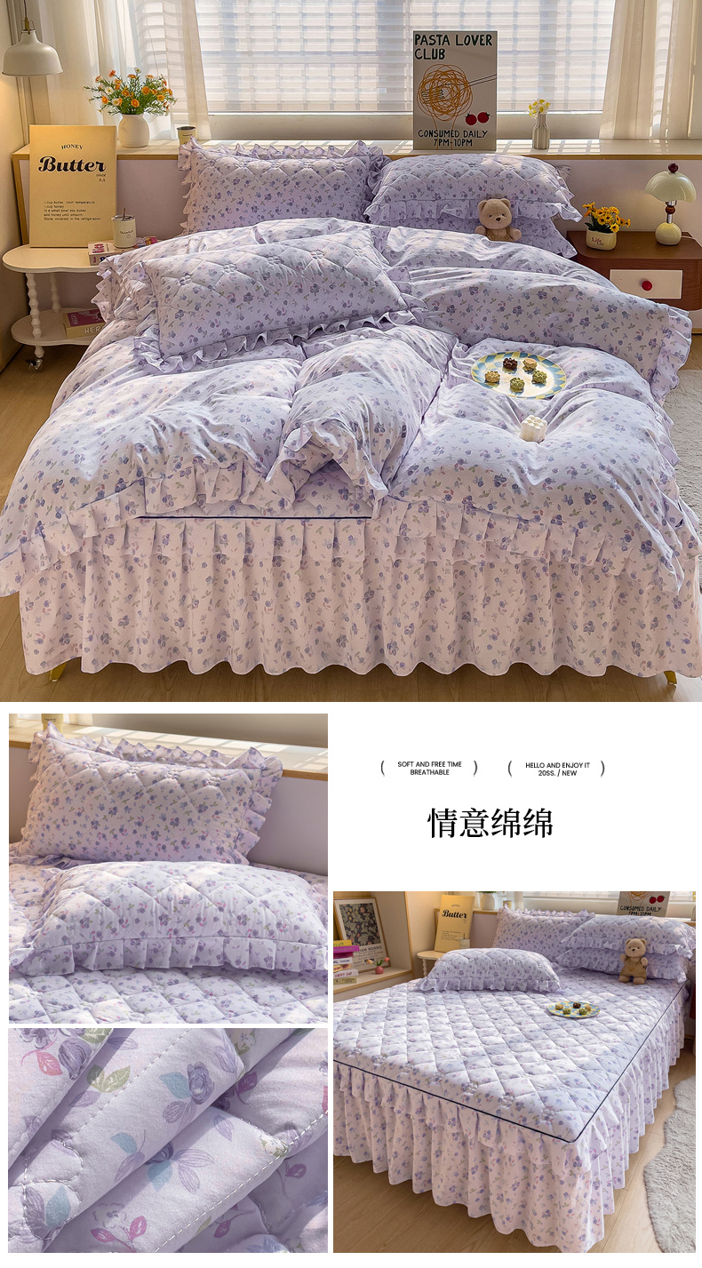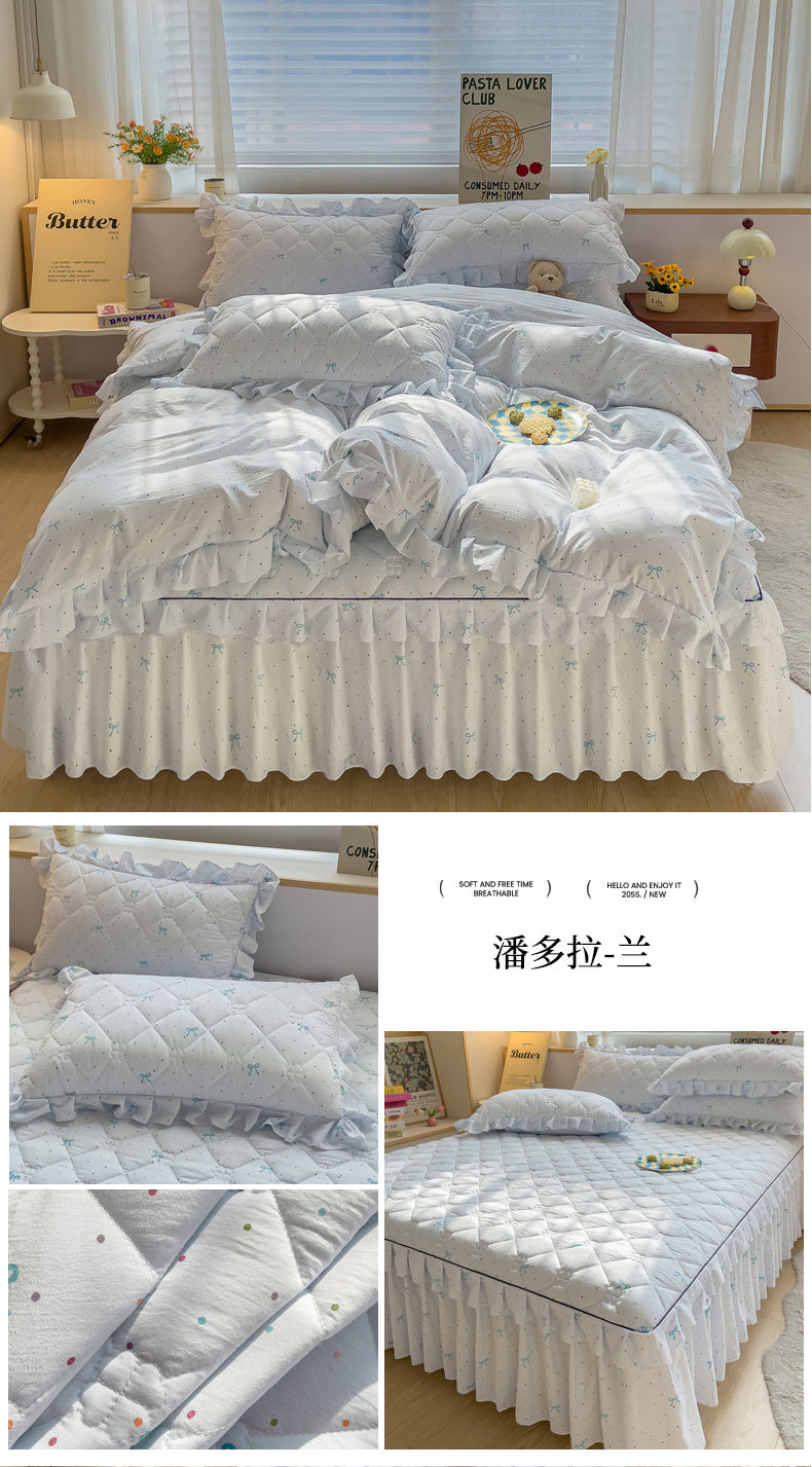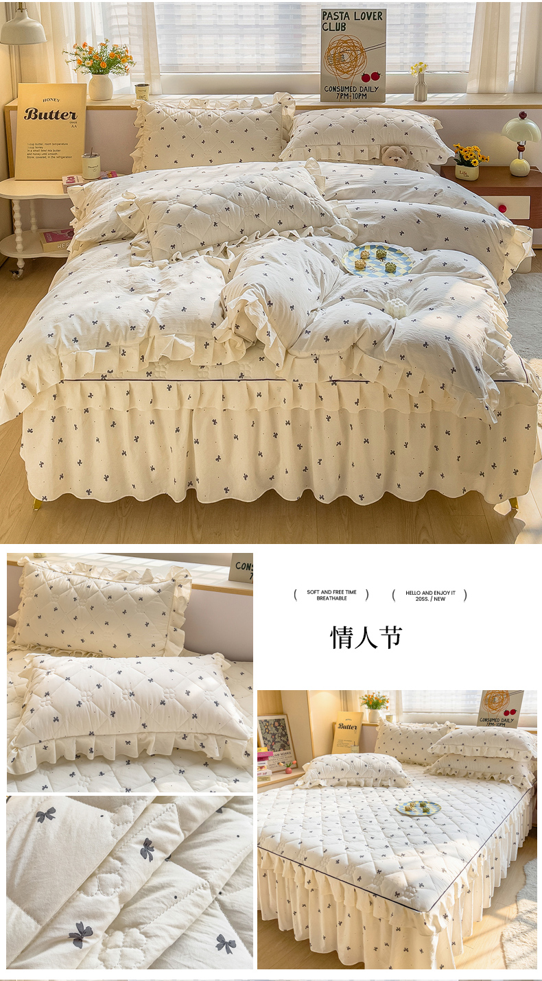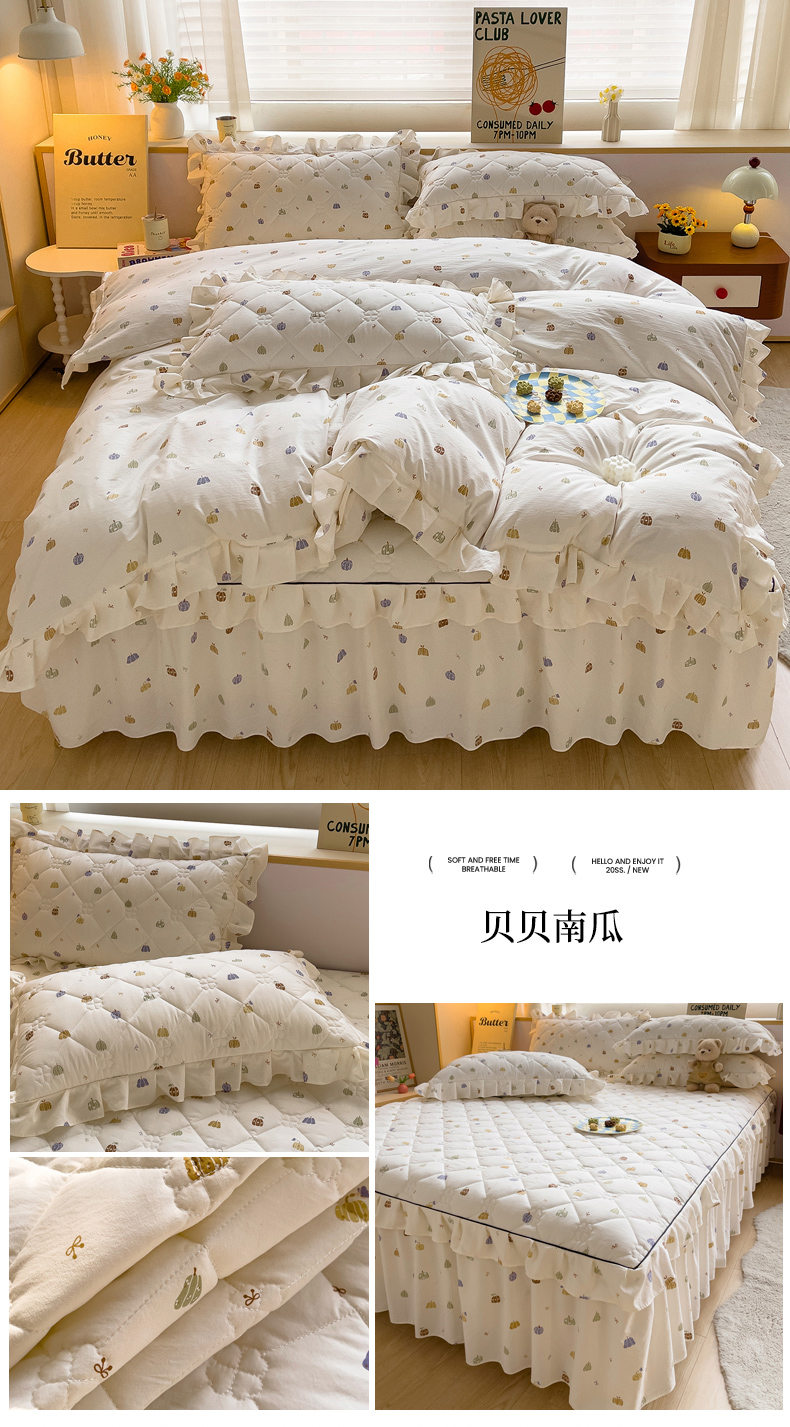 当前位置: 91家纺网 > 商品网购 > 床品套件 > 四件套 > 其它四件套 > 优家居工厂店 2026新款精仿棉夹棉床裙四件套水洗棉韩版公主风花边床裙被套直播外贸定制 贝贝南瓜