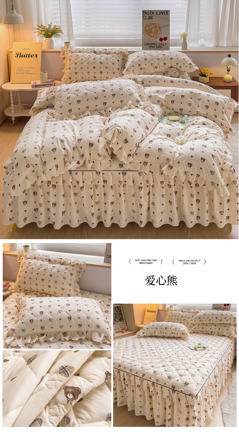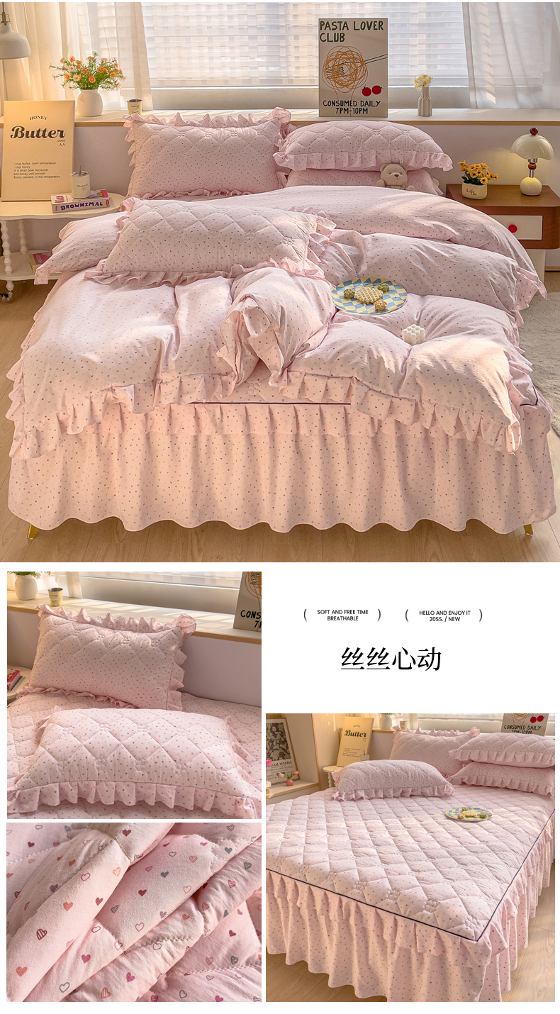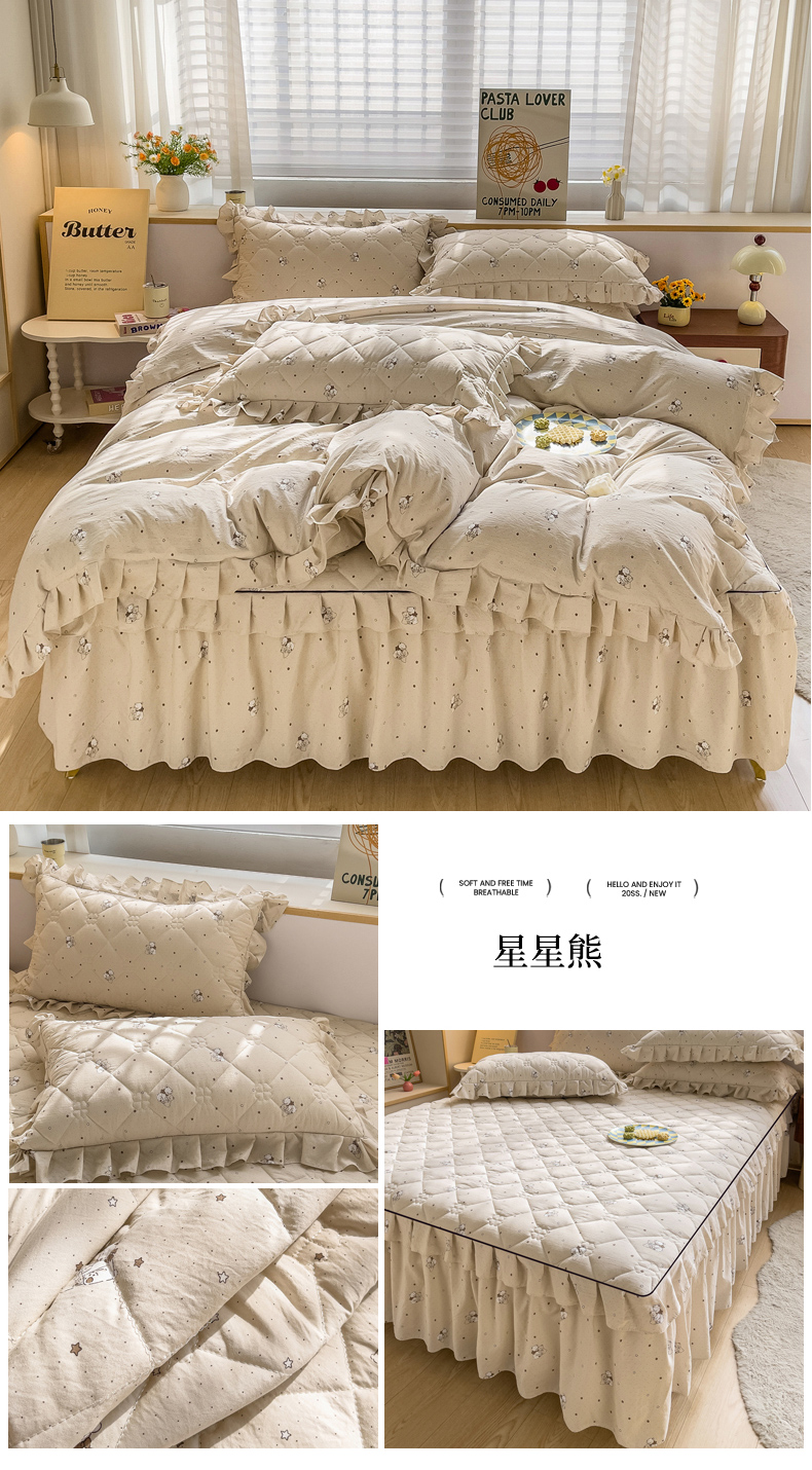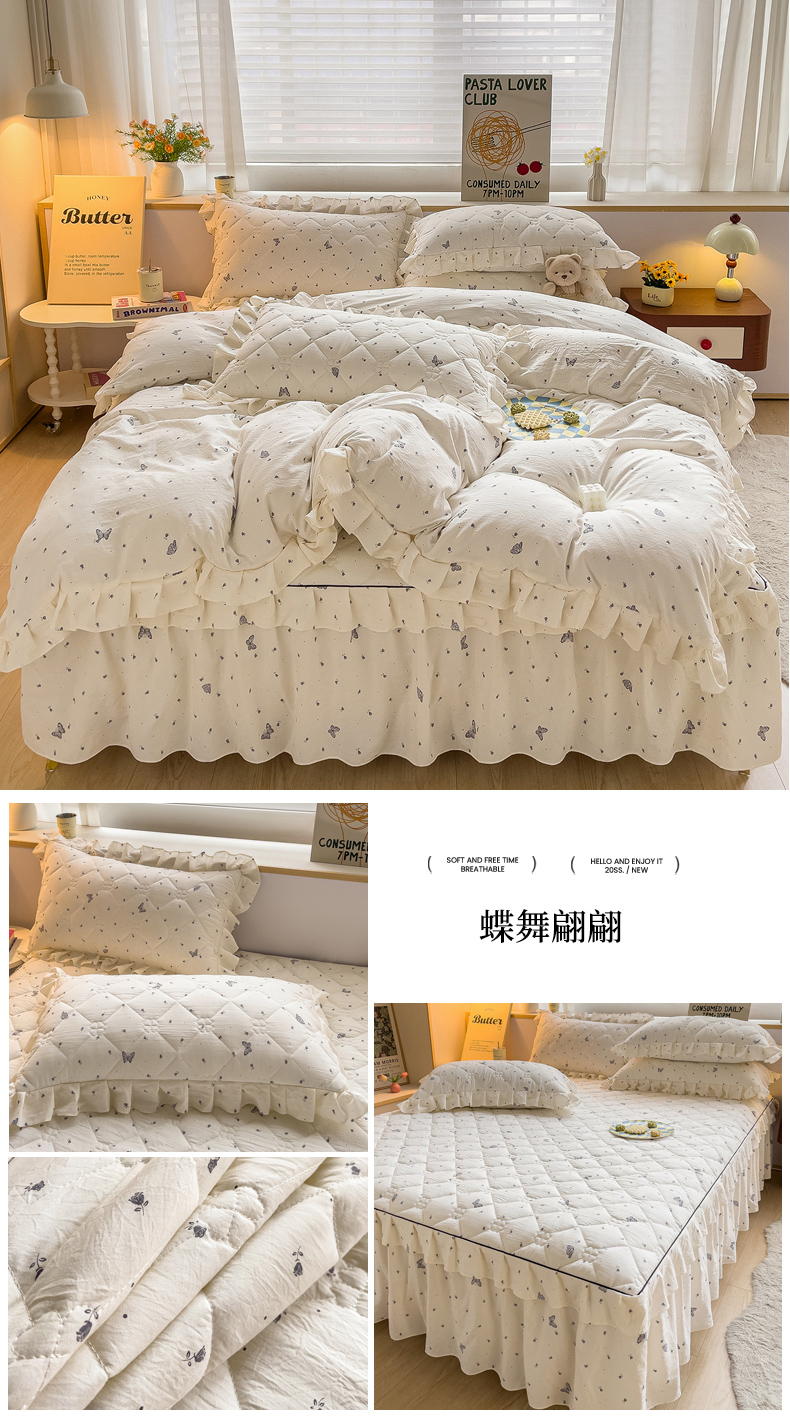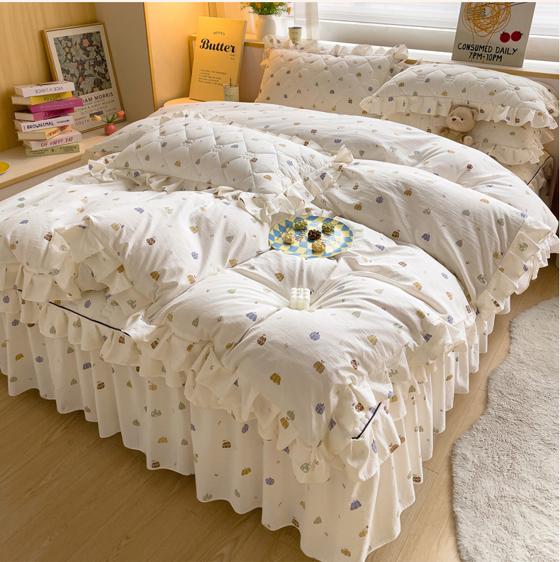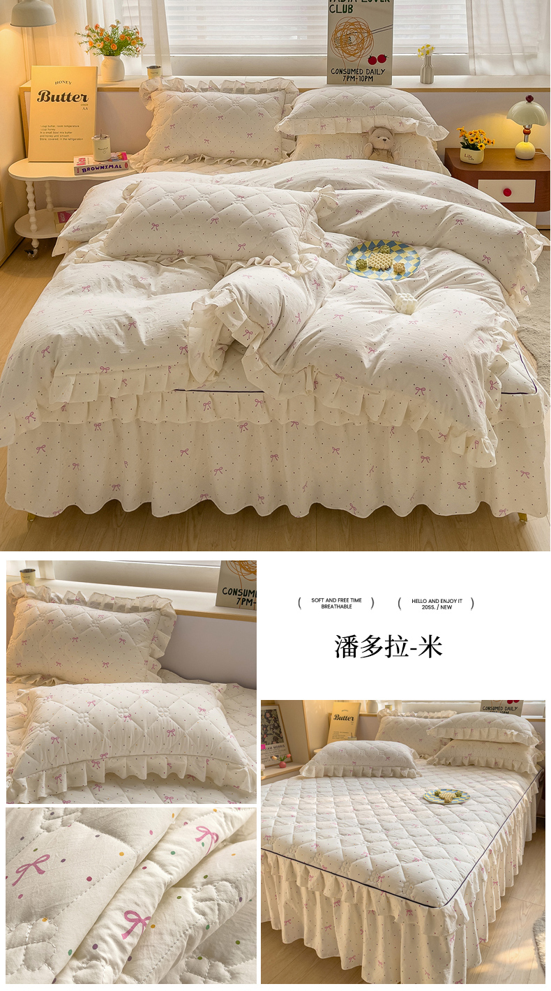 当前位置: 91家纺网 > 商品网购 > 床品套件 > 四件套 > 其它四件套 > 优家居工厂店 2026新款精仿棉夹棉床裙四件套水洗棉韩版公主风花边床裙被套直播外贸定制 贝贝南瓜