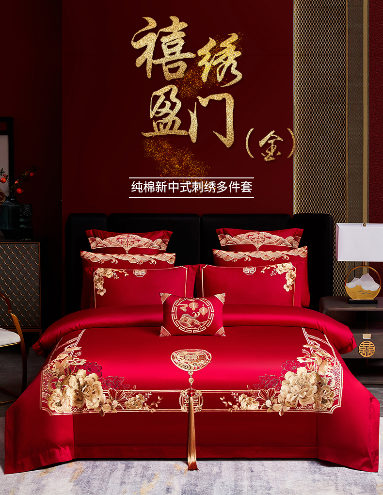 当前位置: 91家纺网 > 商品网购 > 床品套件 > 四件套 > 婚庆四件套 > 红番天婚庆 2026新款全棉刺绣新中式婚庆四件套多件套 禧绣盈门-金