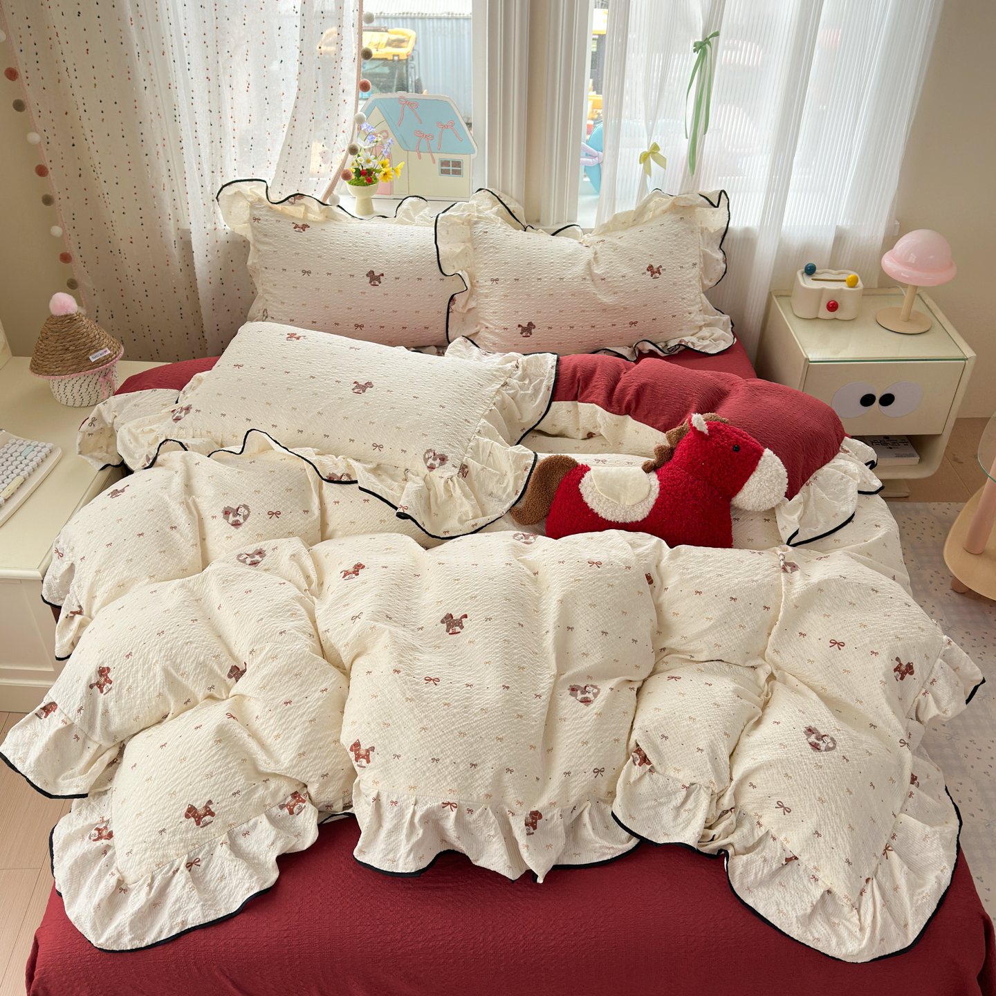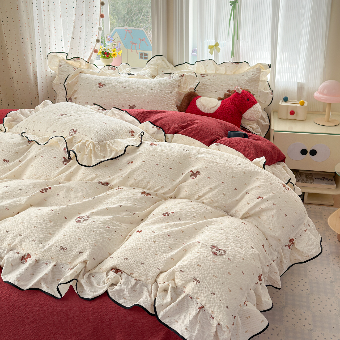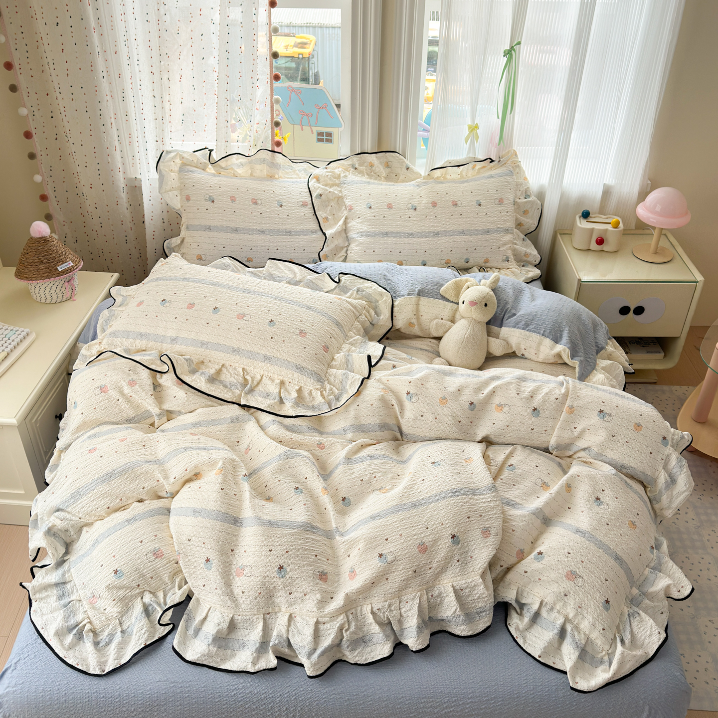 (总)德比尔斯 2026新款小清新110g高品质直播热卖款A类木耳花边泡芙棉四件套,爱心草莓,安妮小兔,鸿运小马,蝴蝶,浆果,可爱熊猫,马上有钱,奶酪星宝,轻蕊,手绘草莓,条纹狗,小马派对,樱桃小猫,云朵