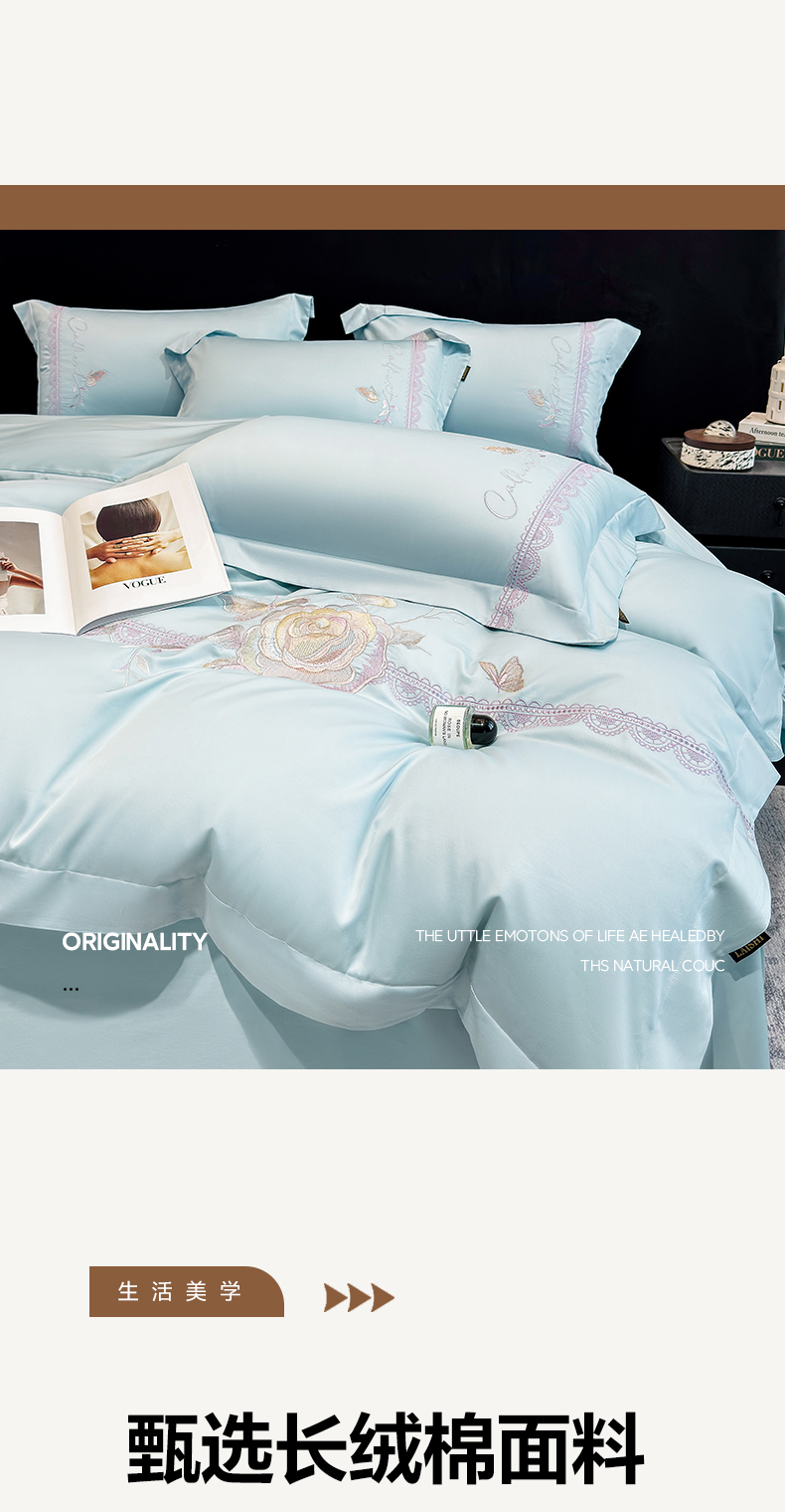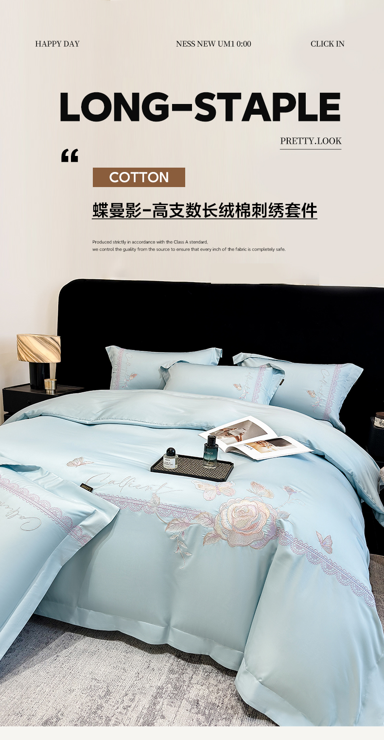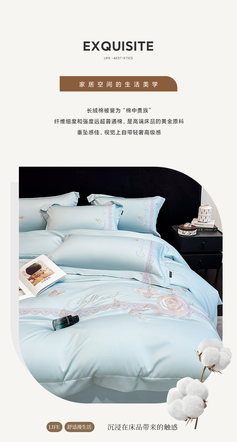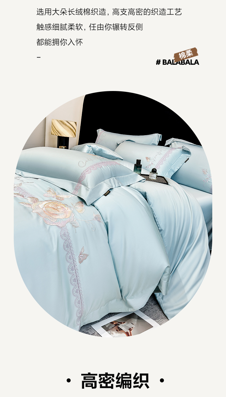 当前位置: 91家纺网 > 商品网购 > 床品套件 > 四件套 > 长绒棉四件套 > 欣宜家纺 2026新款100支贡缎长绒棉纯棉无纸刺绣软绣花四件套高端礼盒-蝶曼影 蝶曼影-天空蓝