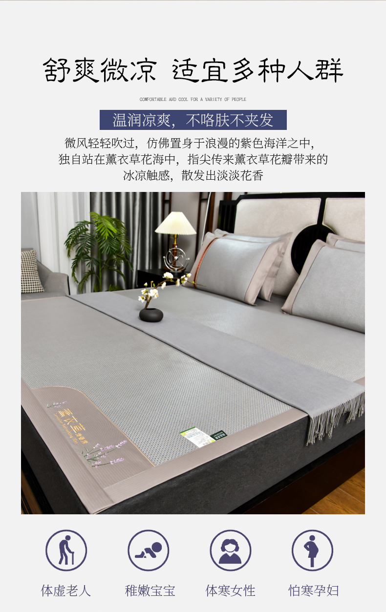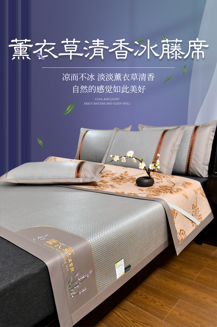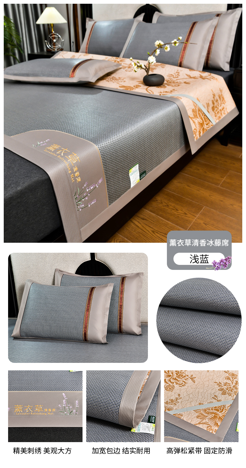 • 91家纺网 家纺一手货源 找家纺 小牛席业 2026新款薰衣草冰藤席系列(冰藤席面)凉席藤席冰藤双面席冰丝席竹席凉席空调席草席三件套 薰衣草清香冰藤席-银灰