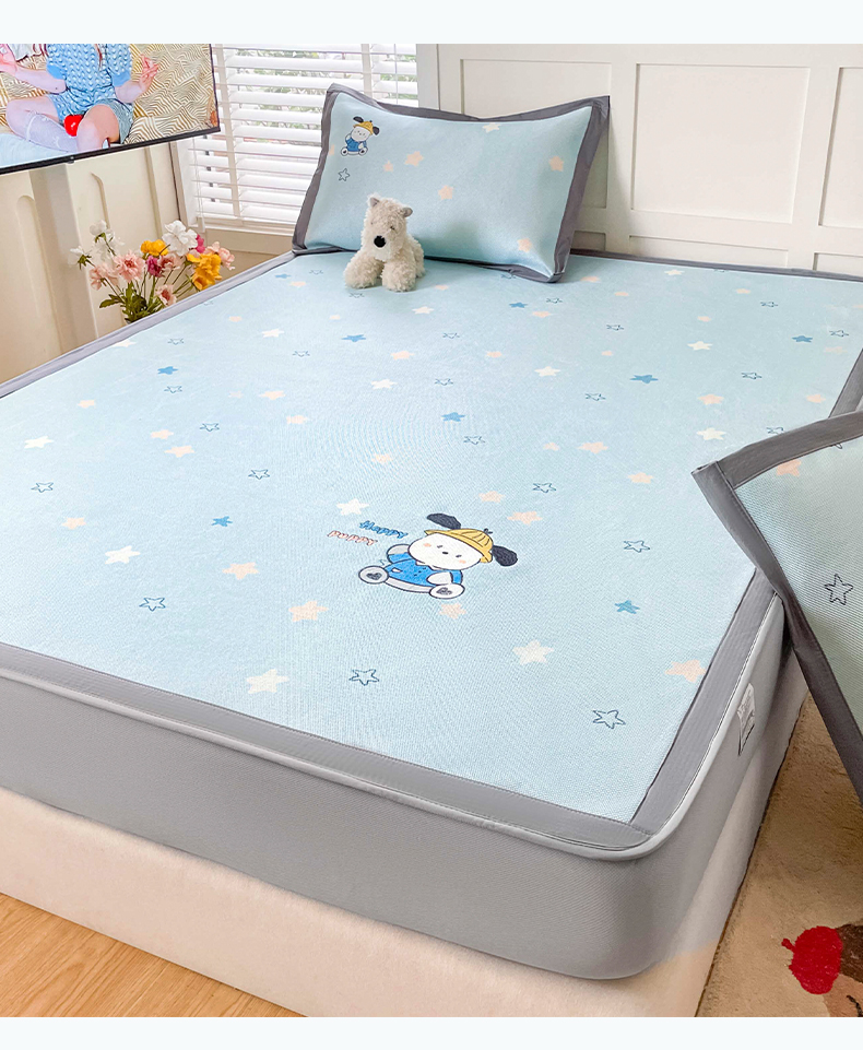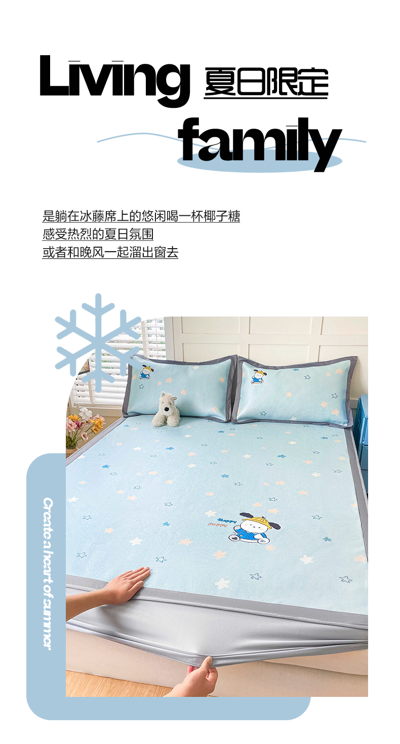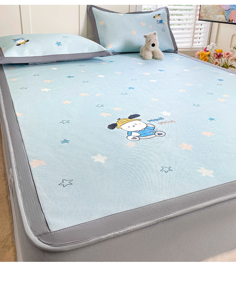 商品名称:雅居纺家纺 2026新款A类加厚三明治底绣花冰藤席床笠款凉席席子 动感小狗
