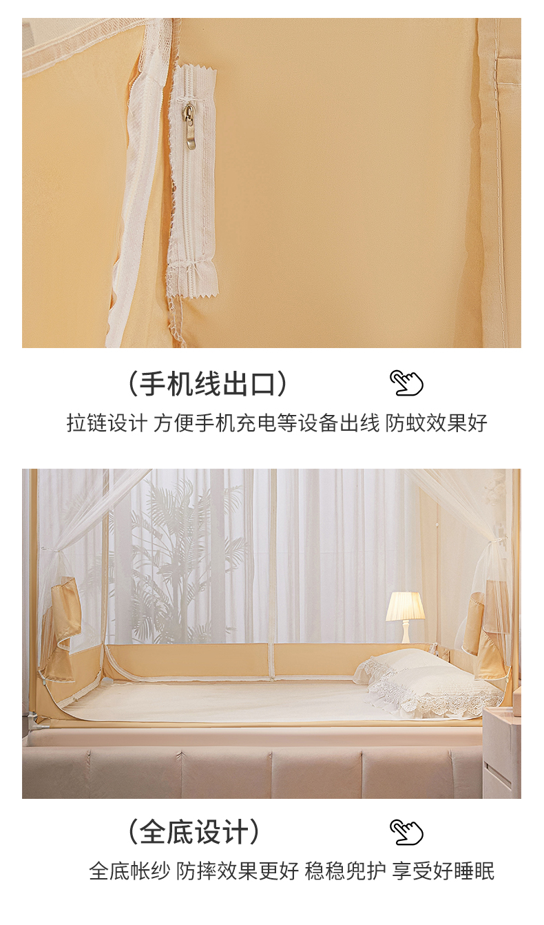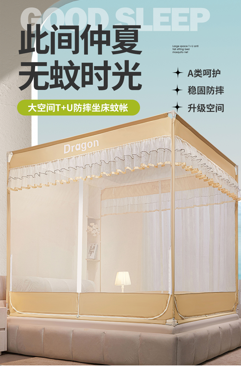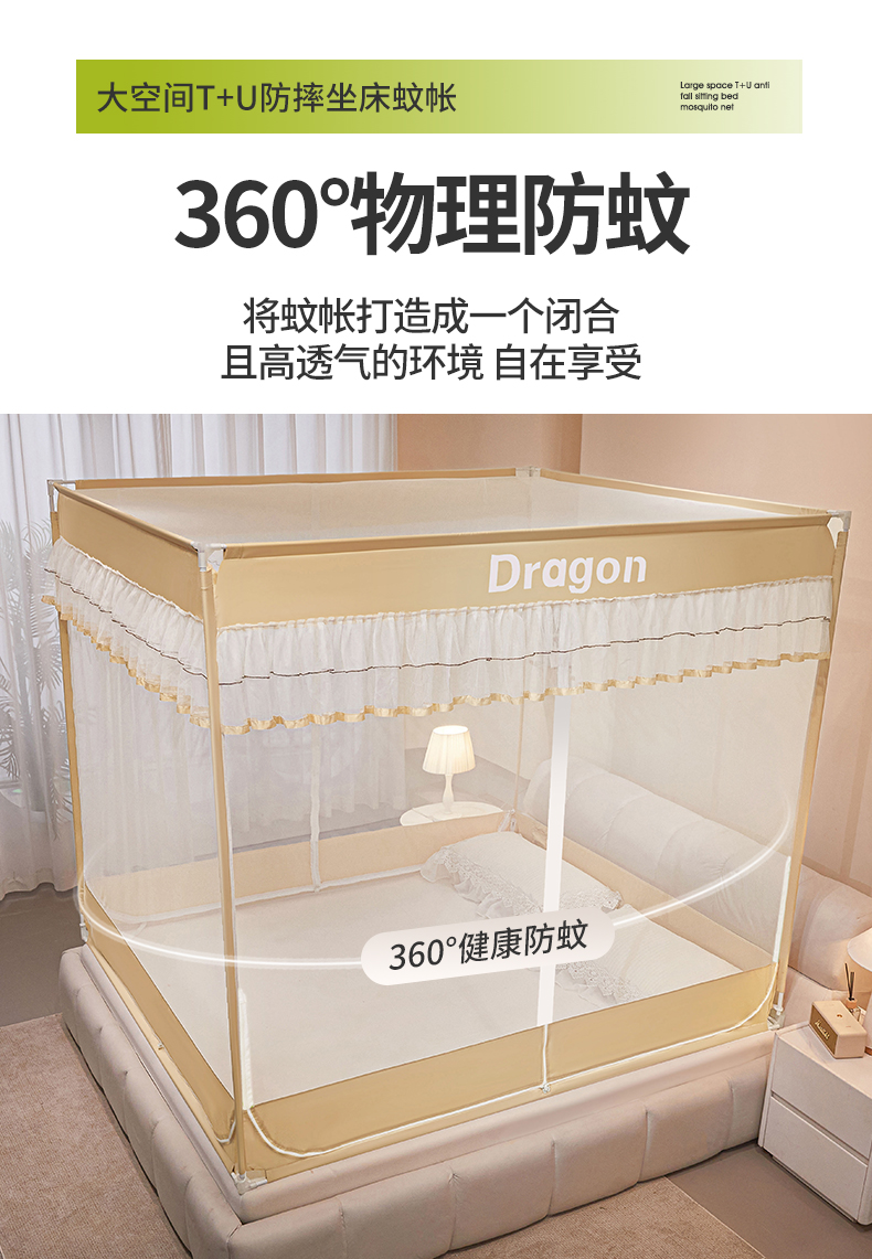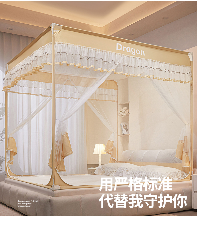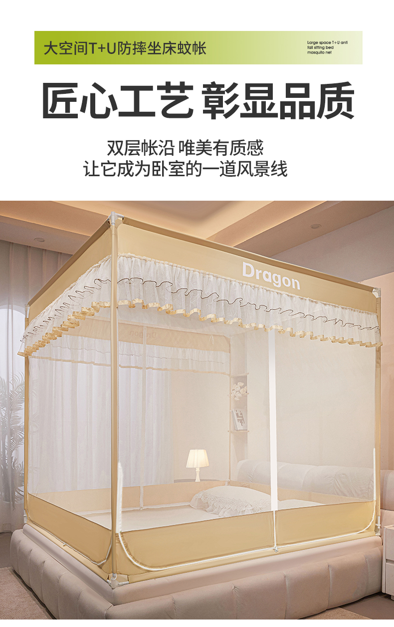 商品名称:梵希良品家纺 2026新款全底家用卧室坐床加密加厚支架全包围加粗大空间T+U防摔坐床蚊帐-漫语 漫语 卡其