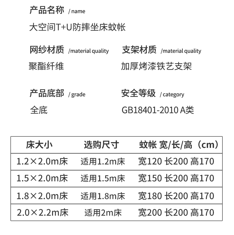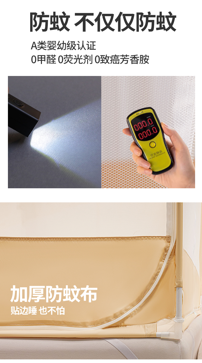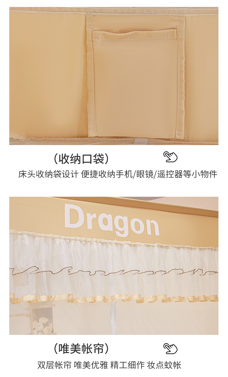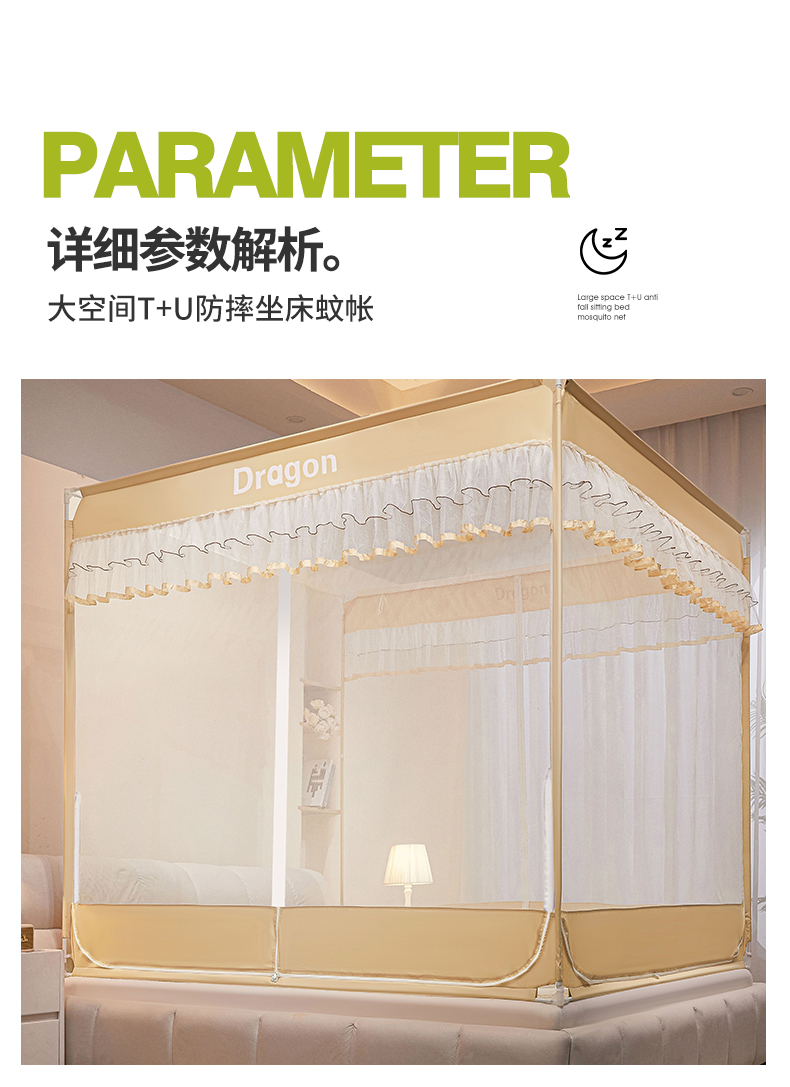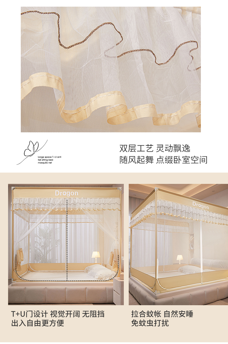 商品名称:梵希良品家纺 2026新款全底家用卧室坐床加密加厚支架全包围加粗大空间T+U防摔坐床蚊帐-漫语 漫语 卡其