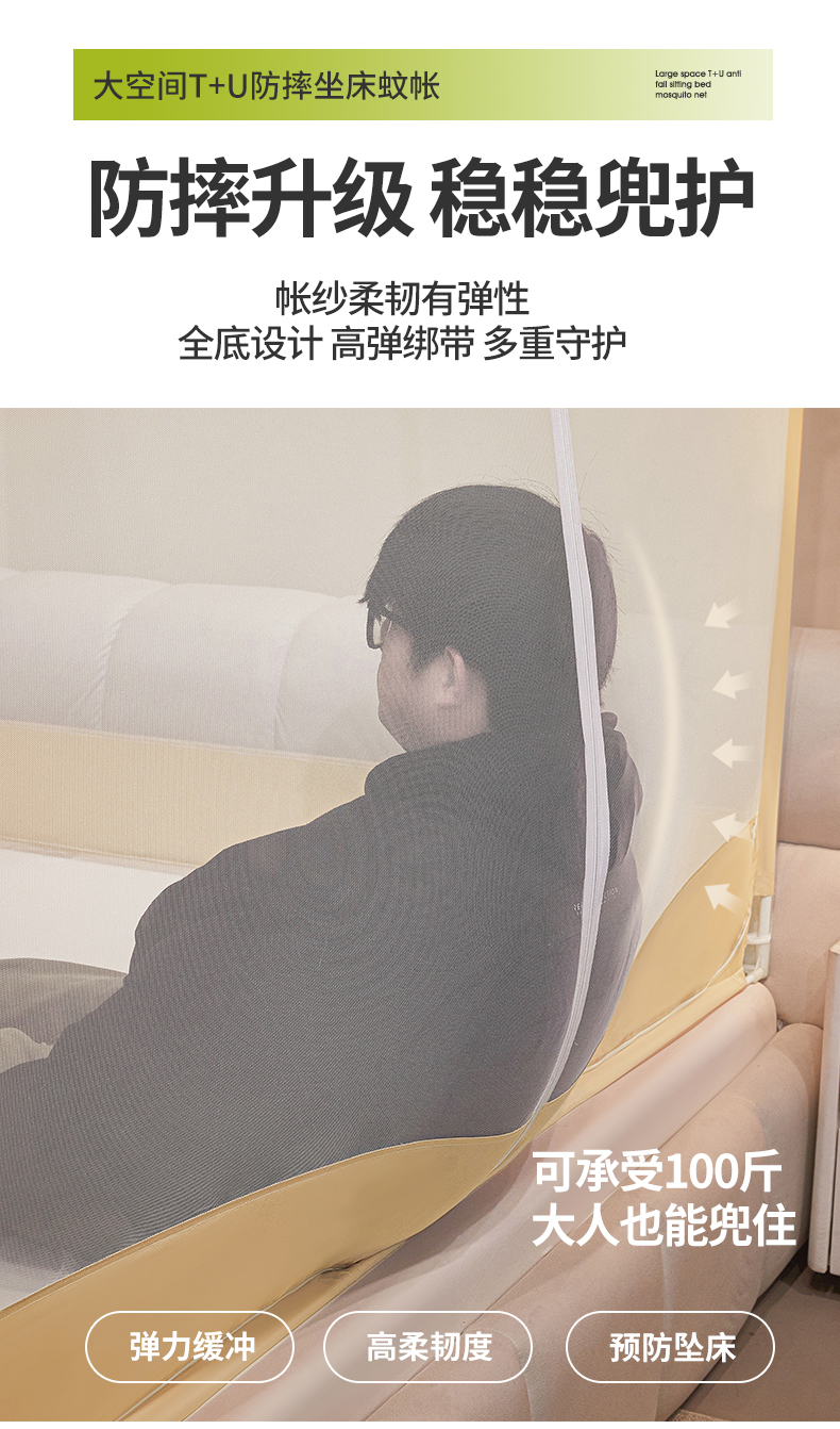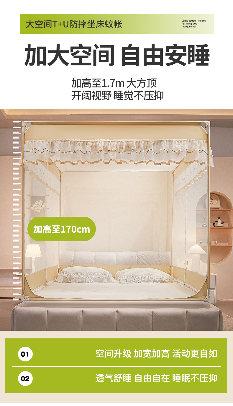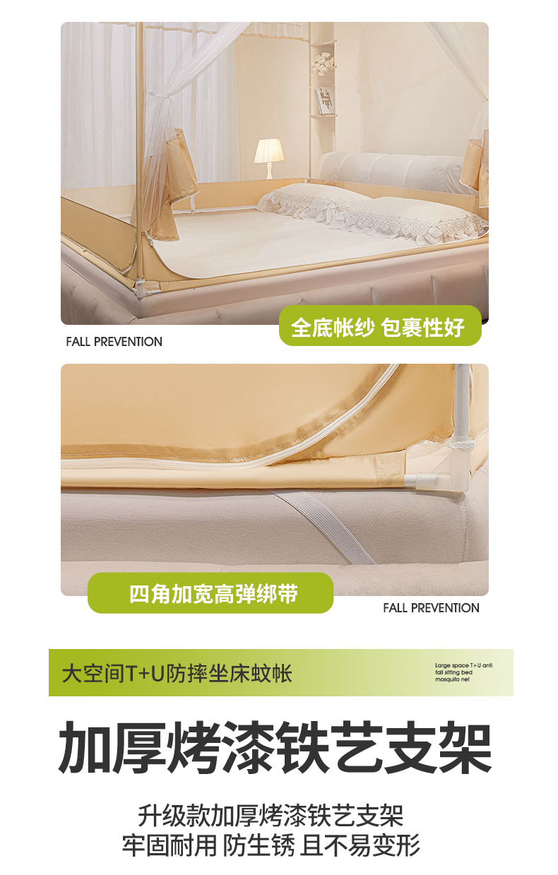 (总)梵希良品家纺 2026新款全底家用卧室坐床加密加厚支架全包围加粗大空间T+U防摔坐床蚊帐-漫语,漫语 果绿,漫语 简灰,漫语 卡其,漫语 柔粉