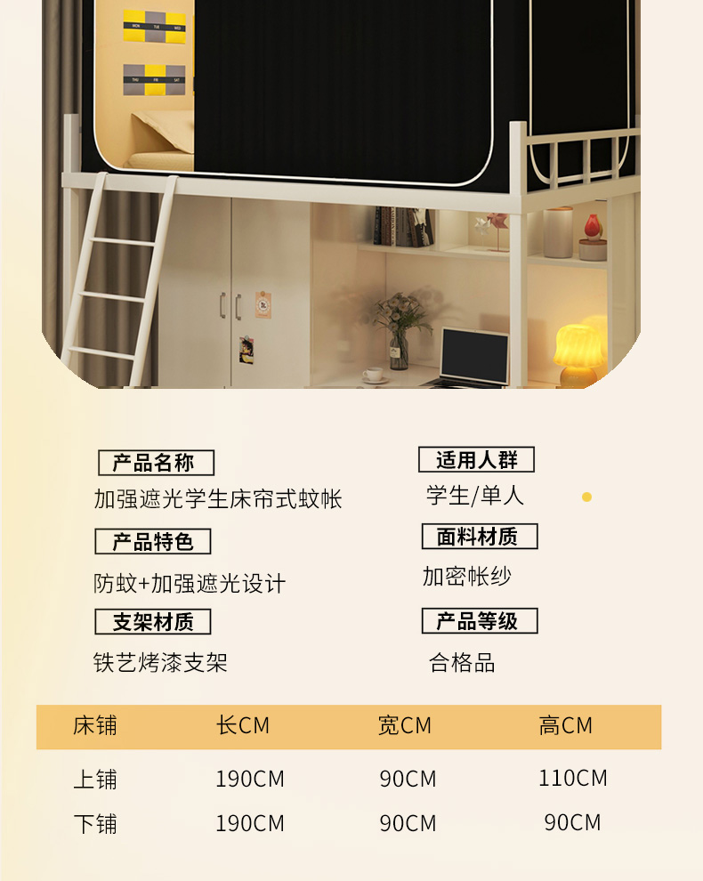 90上下铺通用(带靠墙帘):90宽x190长x90-120高(高度伸缩)