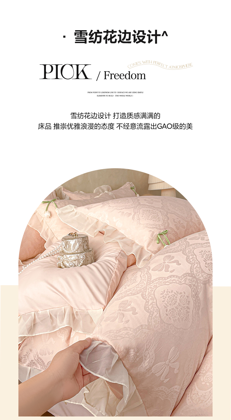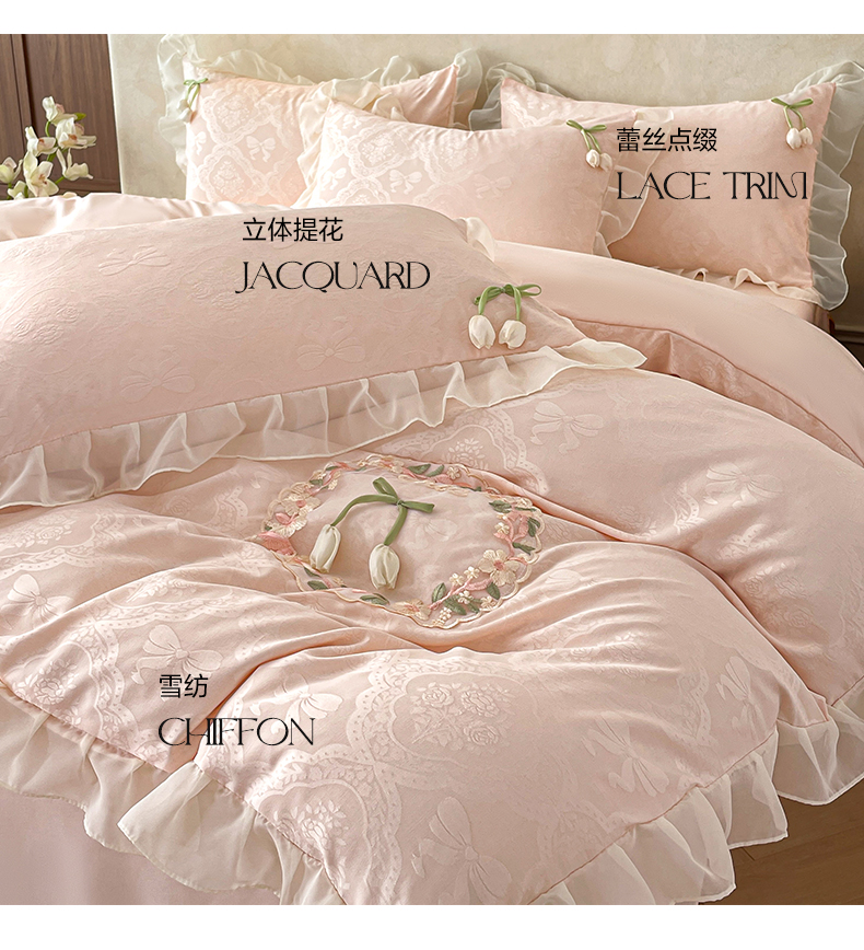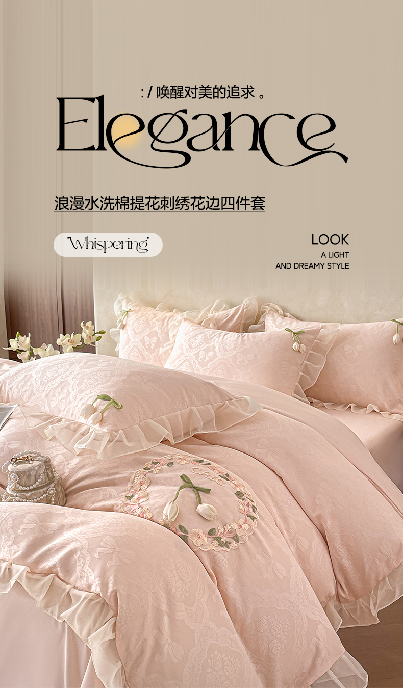 当前位置: 91家纺网 > 商品网购 > 床品套件 > 四件套 > 水洗棉四件套 > 易禾家纺 2026春夏新款提花水冼棉刺绣雪纺花边四件套-典雅 典雅-玉