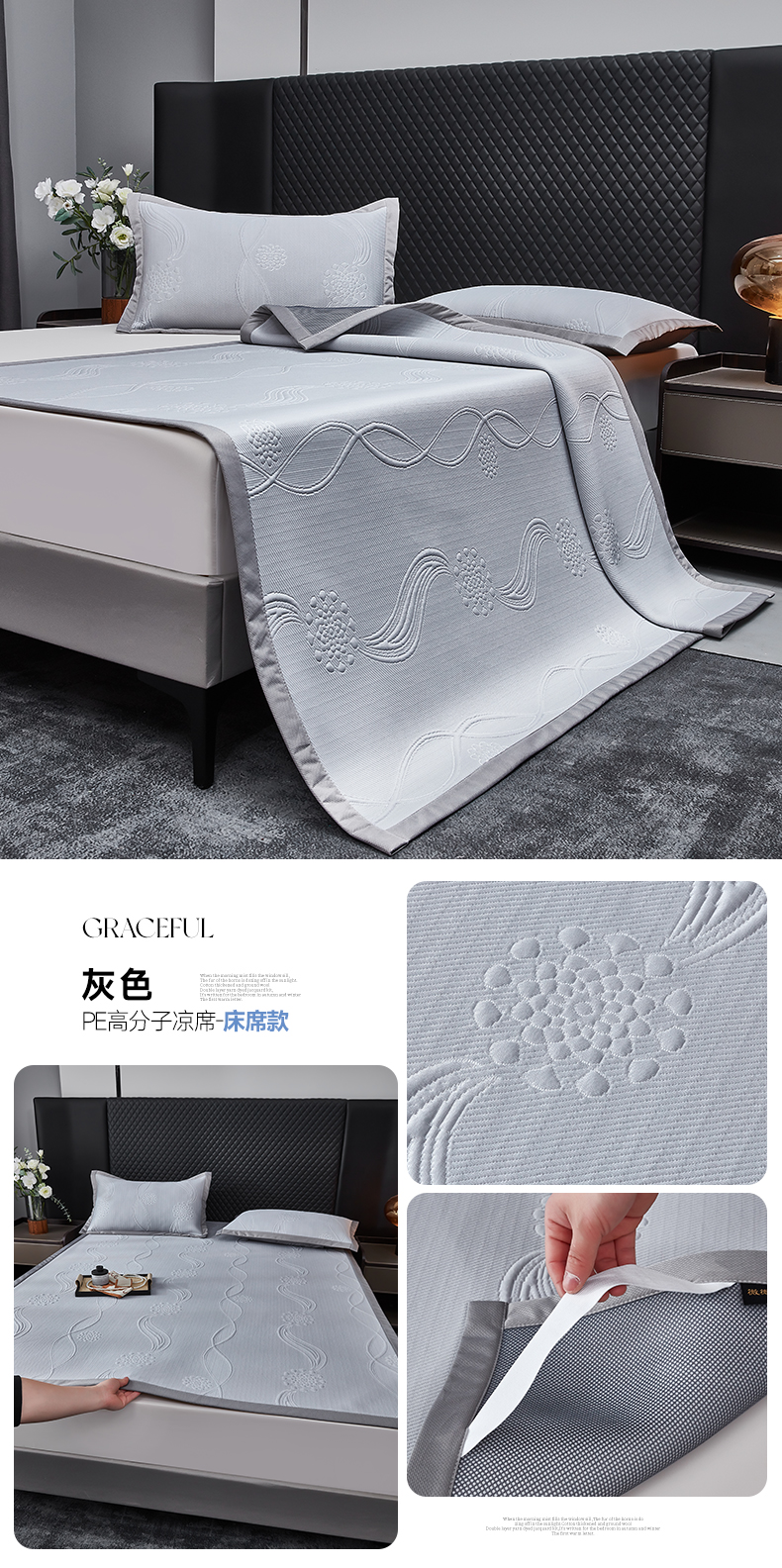 商品名称:库里梦家纺 2026新款轻奢高克重复合PE高分子凉席床笠三件套-芳菲 芳菲-灰色床席款