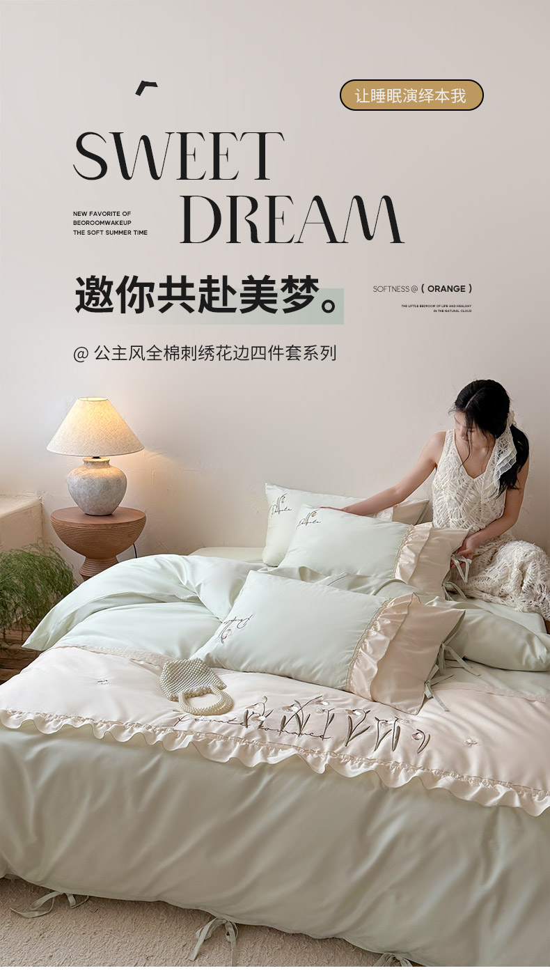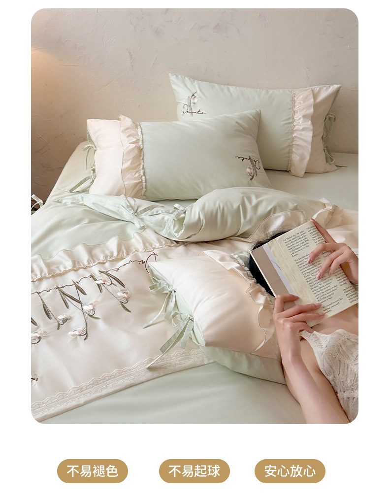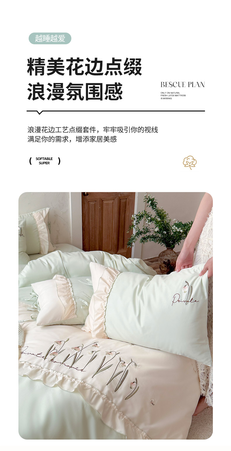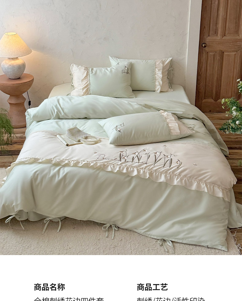 商品名称:艾唯希家纺 2026新款全棉纯棉公主风花边刺绣工艺四件套纯棉-安娜公主系列 安娜公主-绿