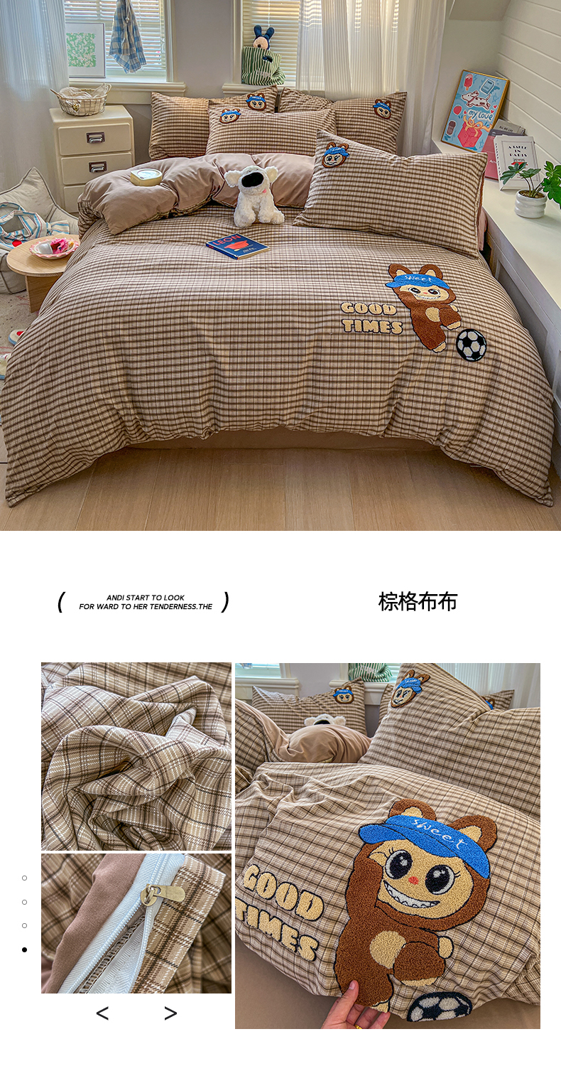 (总)一比一家纺 2026新款仿棉毛巾绣四件套,趴趴小狗,豹纹kitty,粉花兔仔,粉紫熊猫,蓝格小熊,米色熊猫,星星苹果,紫心少女,棕格布布