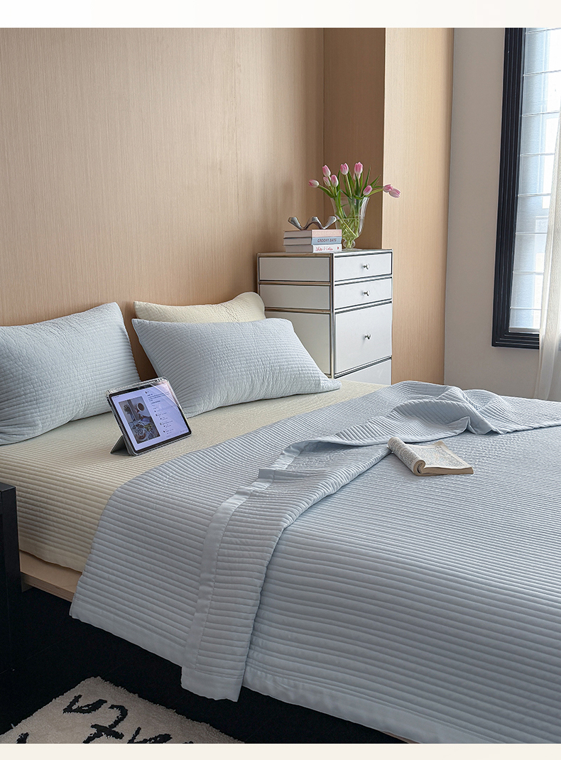 漫调家纺 2026新款韩国莫代尔夏被床盖系列-宽边直条款 海盐蓝