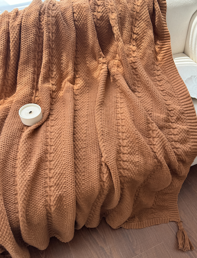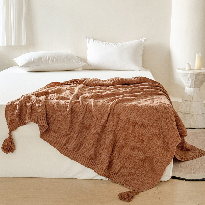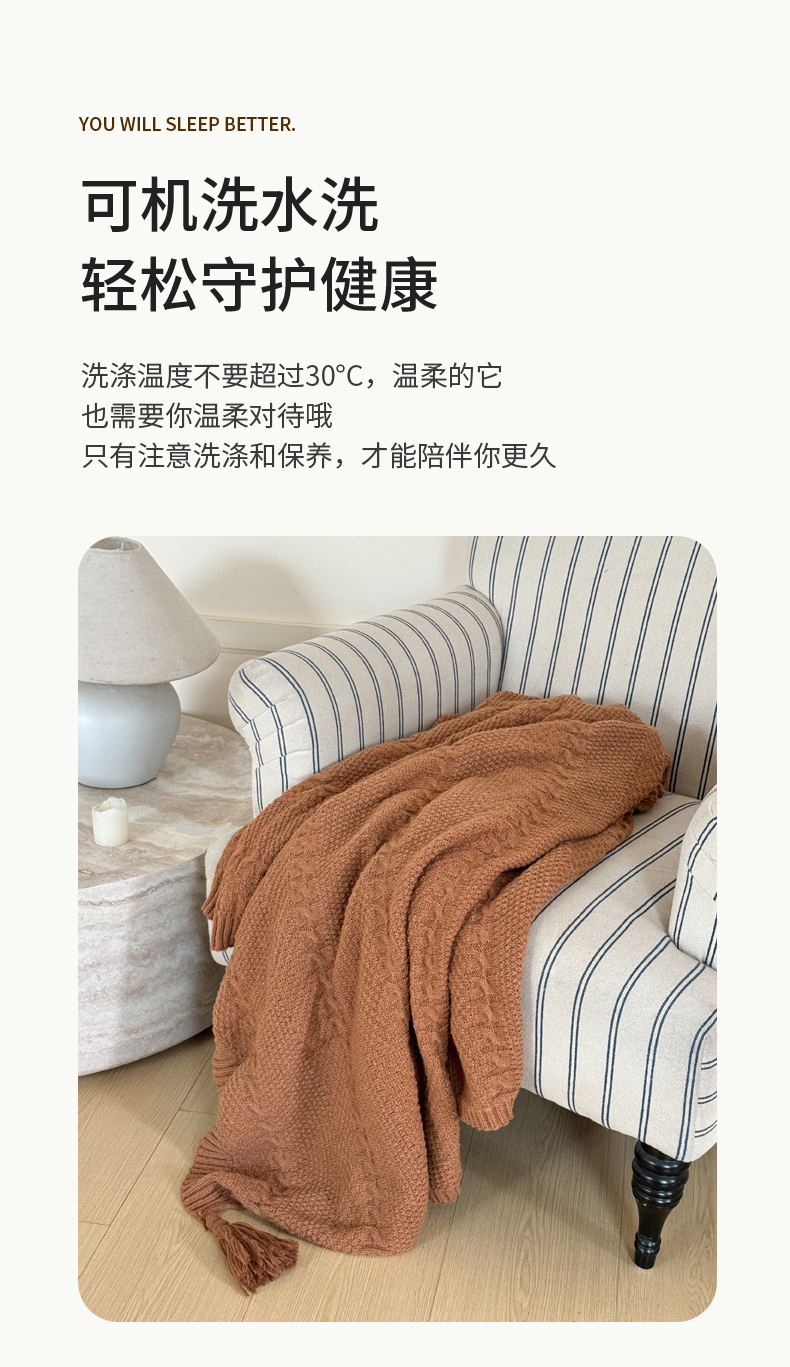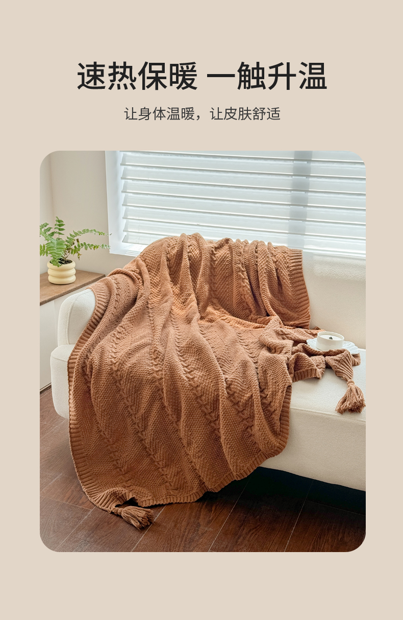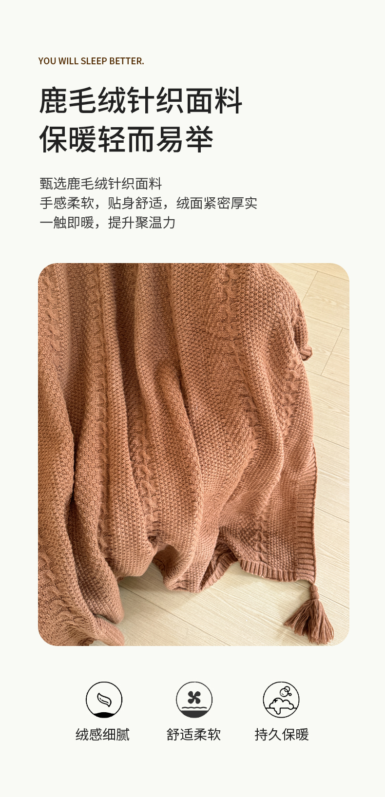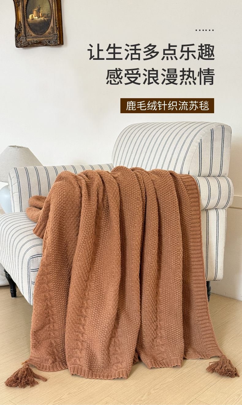 商品名称:丹本家纺 2026新款针织毛毯鹿毛绒纯色流苏航空休闲毯办公午睡盖毯多功能装饰毯 驼棕