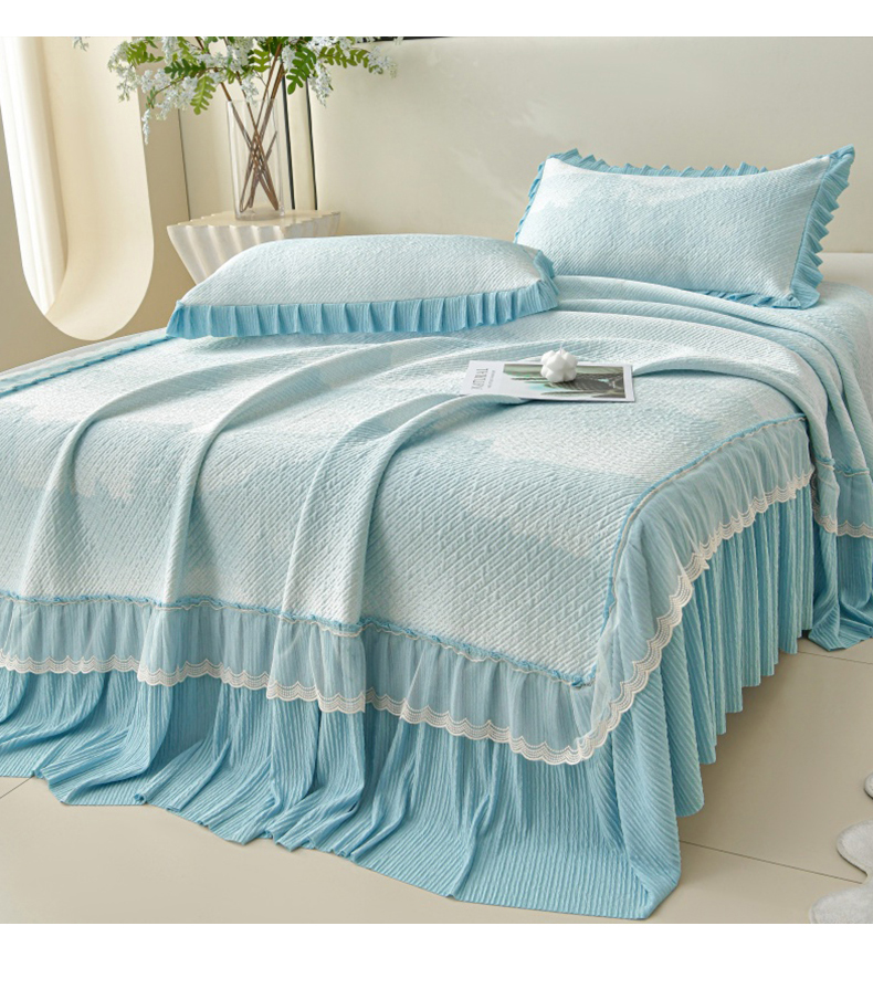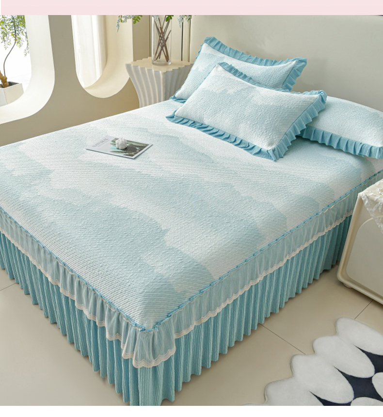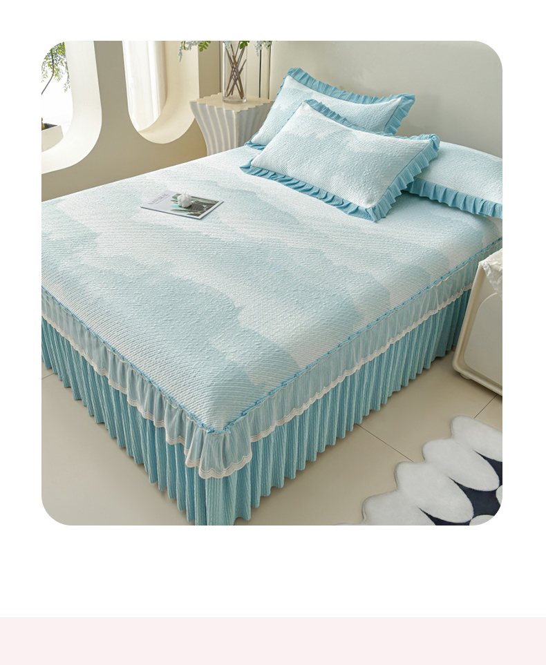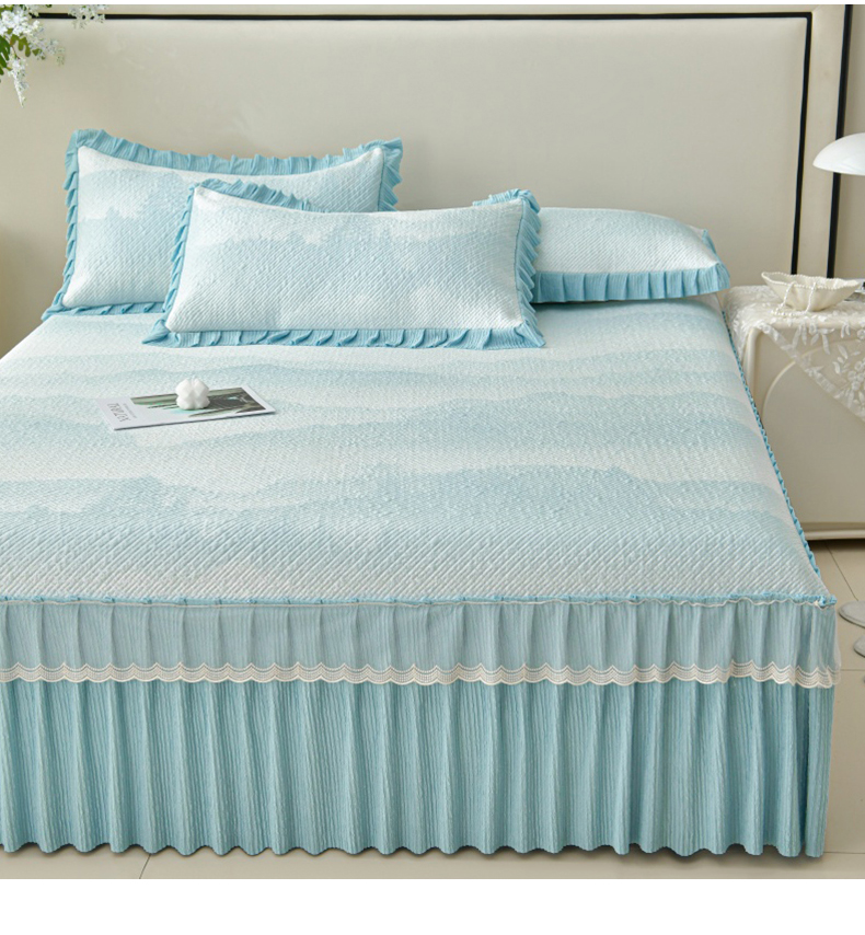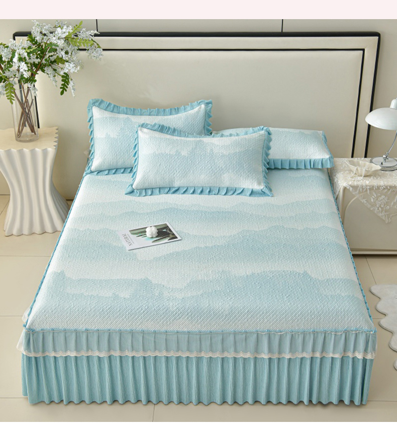 诺梵家纺 2026新款凉豆豆PE高分子凉感花边床裙凉席三件套 见山-蓝