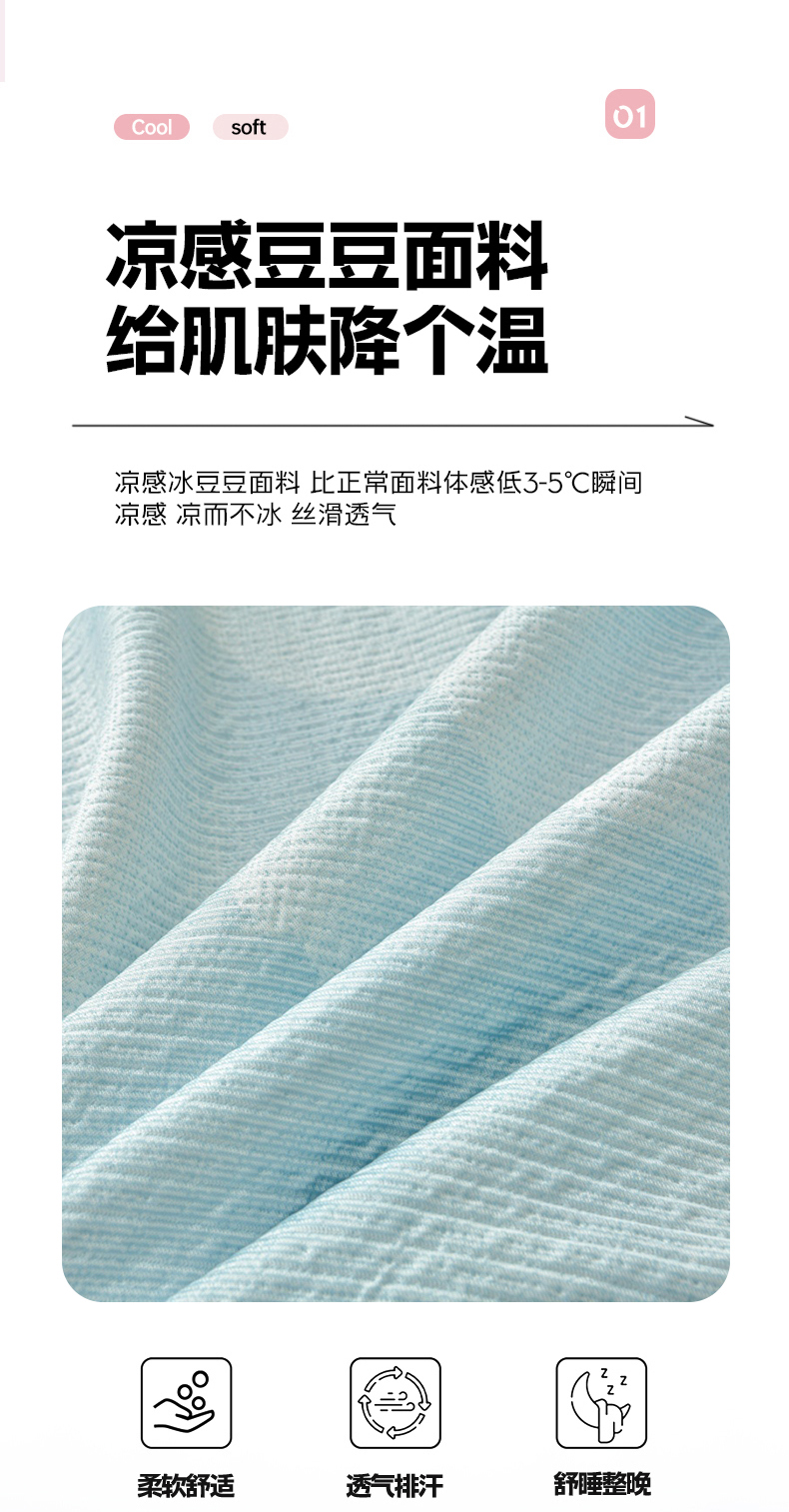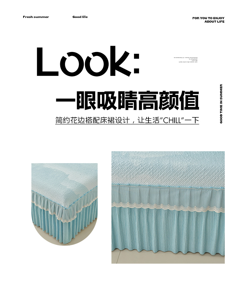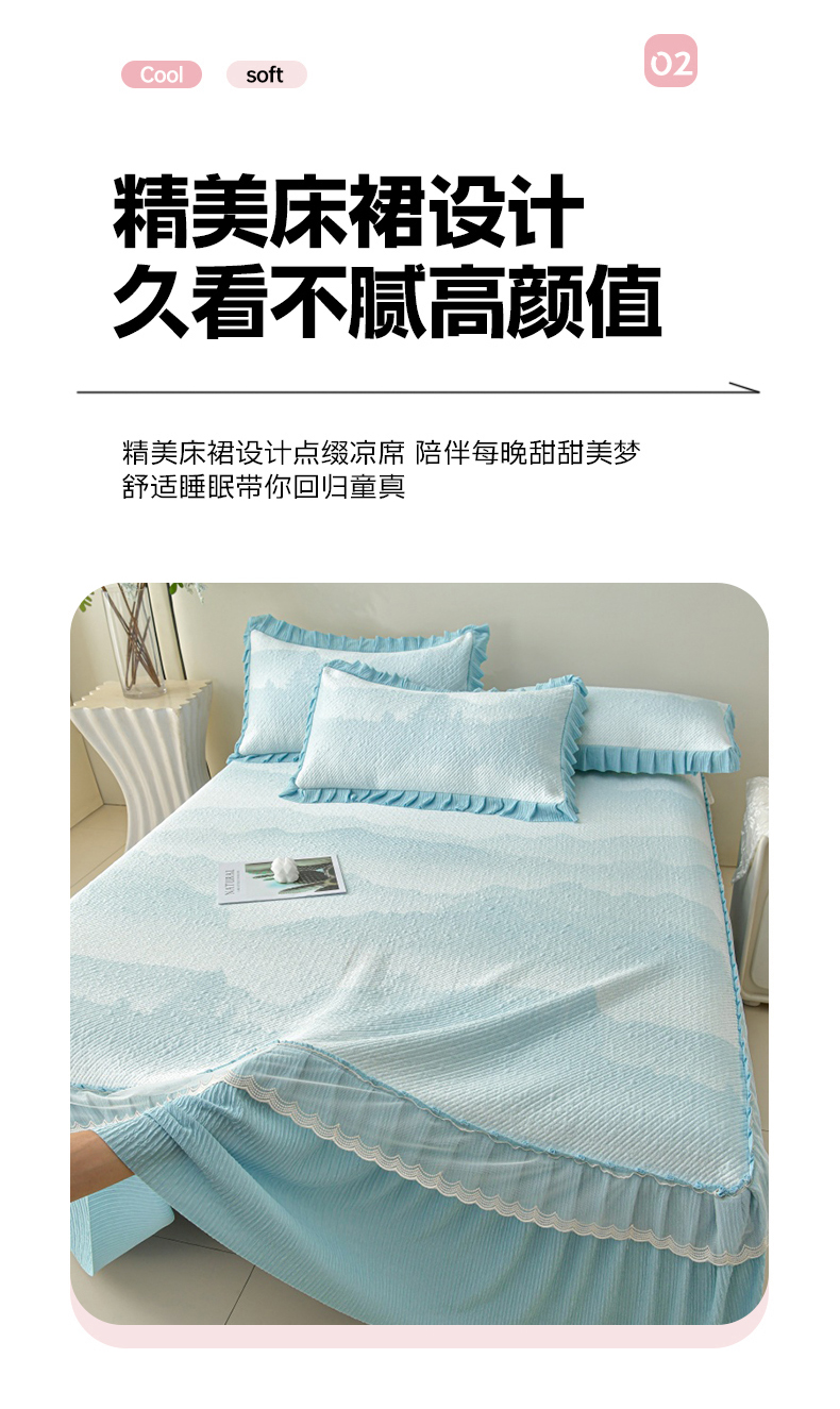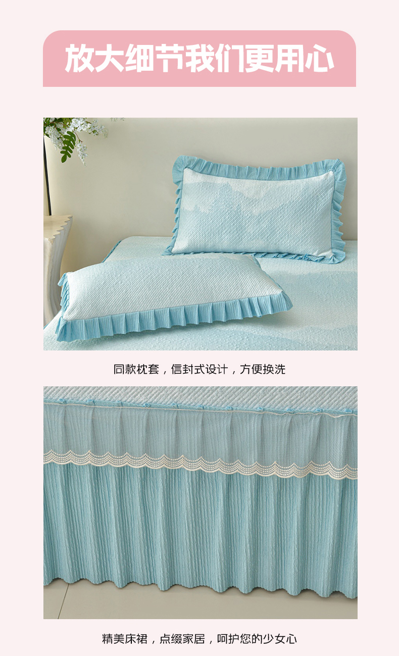 商品名称:诺梵家纺 2026新款凉豆豆PE高分子凉感花边床裙凉席三件套 见山-蓝