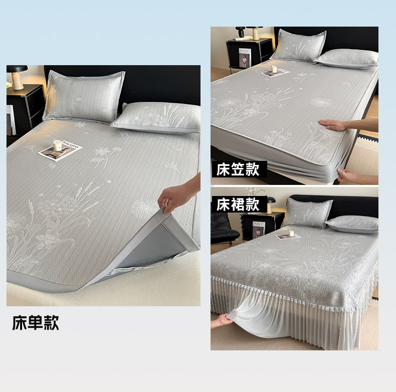 • 91家纺网 家纺一手货源 找家纺 鑫琪莱家纺 2026新款提花浮雕凉豆豆凉感凉席床裙款 蒲公英蓝灰