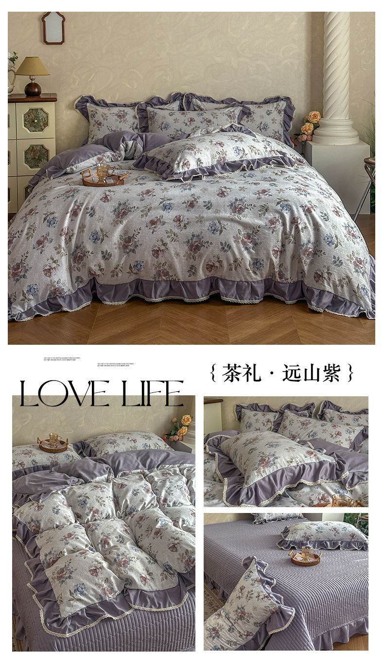 (总)星光耀 2026新款A类高克重斜纹云柔棉床盖四件套,茶礼·远山紫,茶礼·梅子红,边庭,禅弥,花棠,岚语