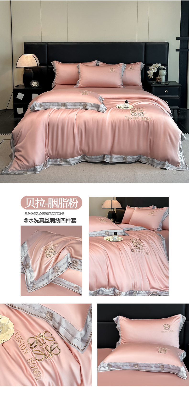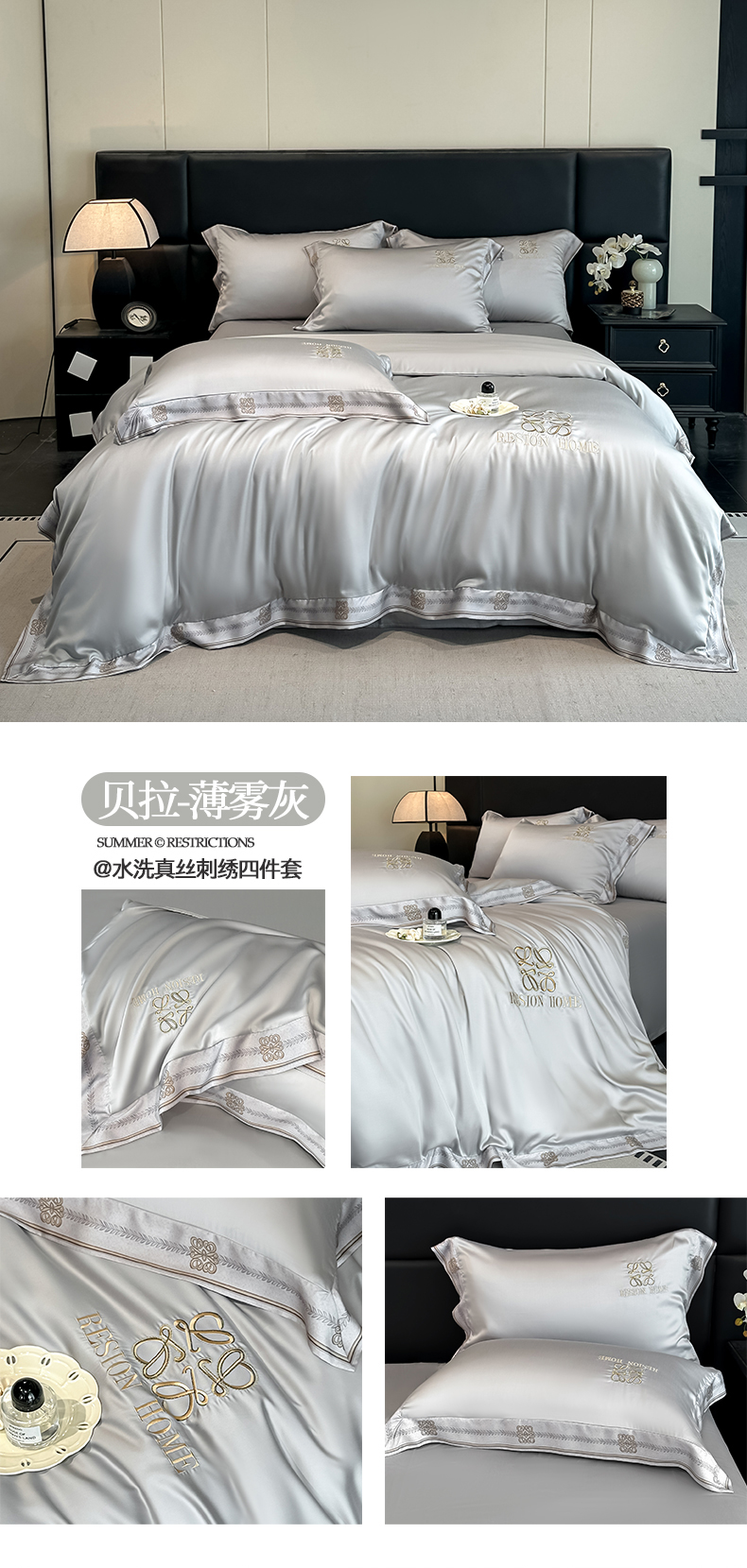 当前位置: 91家纺网 > 商品网购 > 床品套件 > 四件套 > 其它四件套 > 露梦家纺 2026新款A类水洗真丝轻奢刺绣拼接宽边四件套--贝拉系列 贝拉-高级灰
