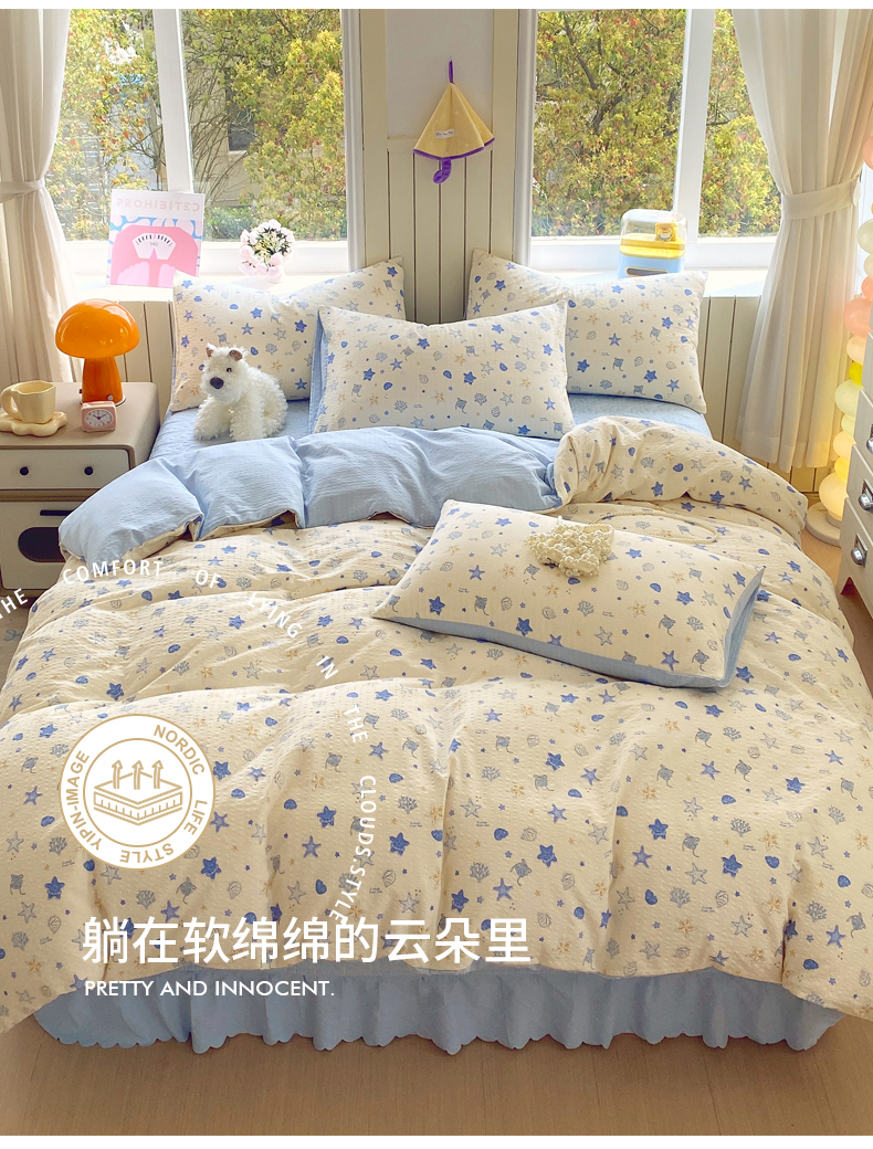 莱米家纺 2026新款云感泡泡纱双层纱床盖四件套 海底星星